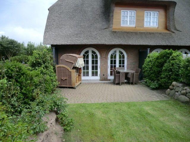 Sehr schöner eigener und sonniger Garten mit Garteneingang, Friesenwällen und Sylt-Rosen, schönem Strandkorb und edlen Gartenmöbeln.