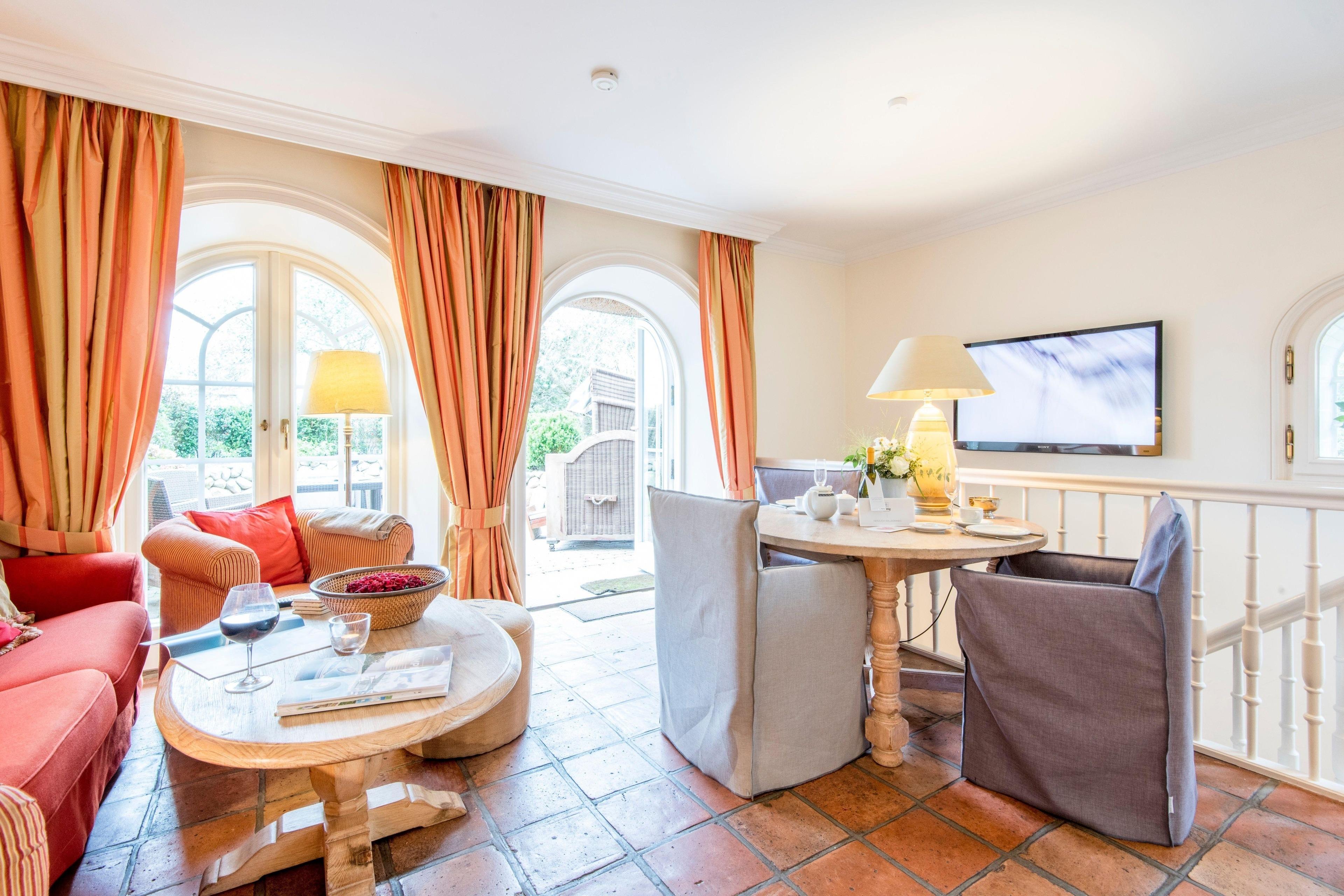 Die Gartensuiten in dem luxuriösen und exklusiv gestalteten Reethaus sind edel und geschmackvoll und hochwertig eingerichtet, sehr ruhig gelegen mit eigenem Garteneingang. Das helle und gemütliche Wohnzimmer mit offenem Kamin mit schönem essplatz für 3-4 pers hat einen edlen antikem Plavoisen-Fliesenboden mit Fußbodenheizung, großen Flatscreen-TV, gemütlicher Essplatz mit großem Tisch und kleiner voll ausgestatteter Pantry-Küche mit Geschirrspüler, Ceranfeld mit 2 Pl und Nespresso-Maschine (inkl Startset mit 10 Kapseln). Der eigene sonnige Garten und Garteneingang mit Friesenwällen, Strandkorb und schönen Gartenmöbeln ist schön eingewachsen und ruhig gelegen.