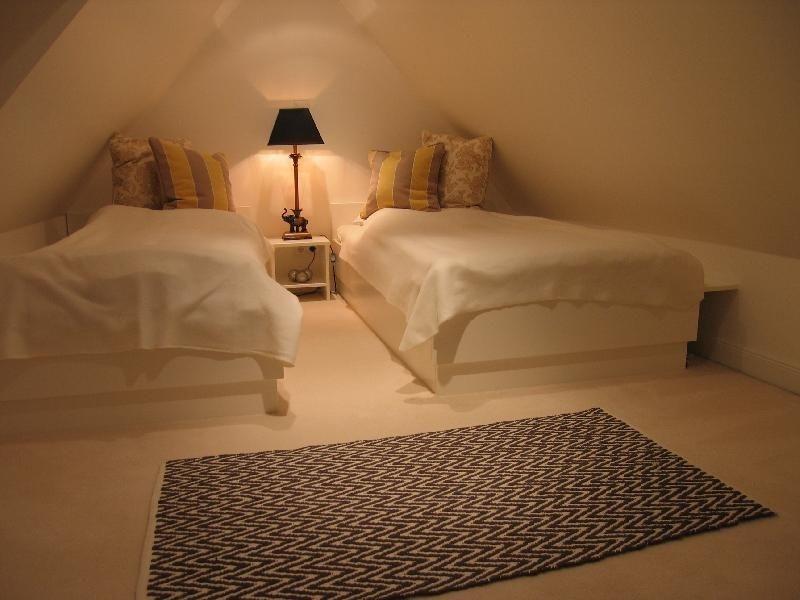 Über eine bequeme Treppe erreicht man das 2. Schlafzimmer im Dachgeschoss mit 2 überbreiten Betten und TV-Anschluss.