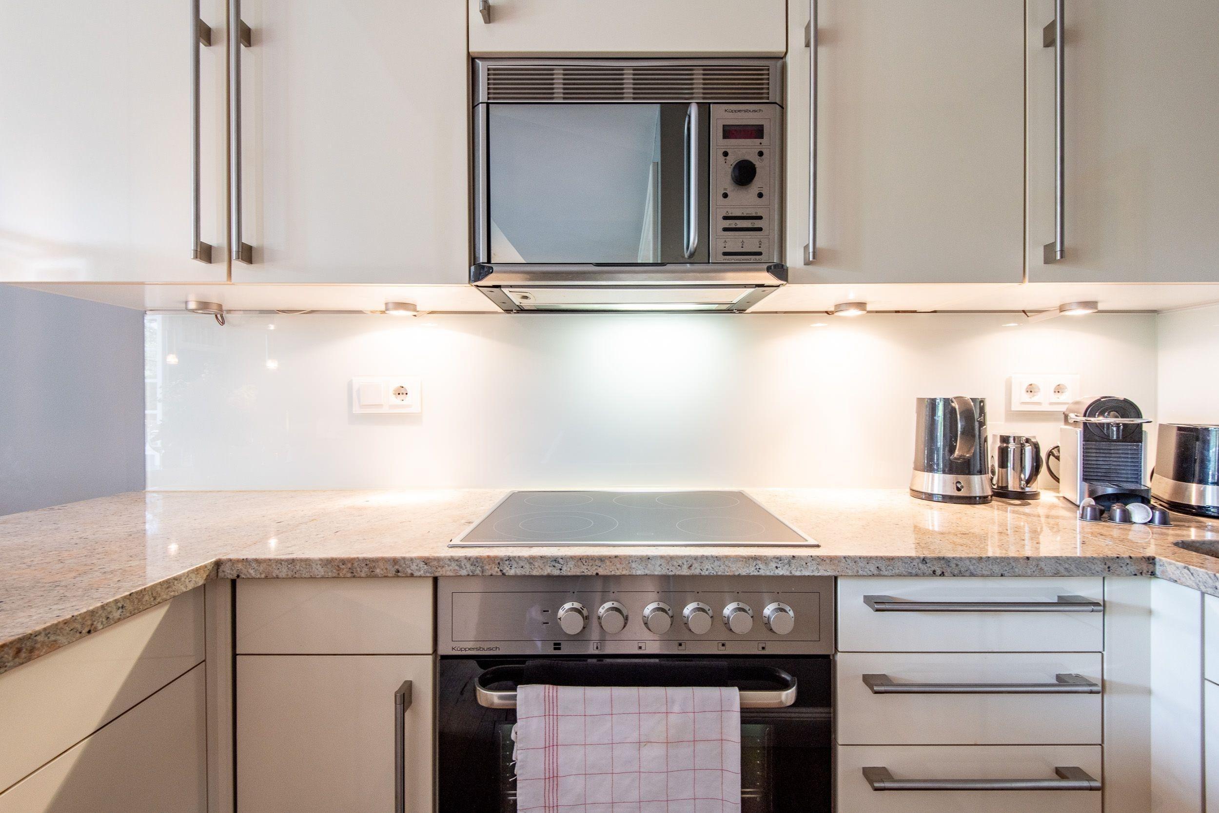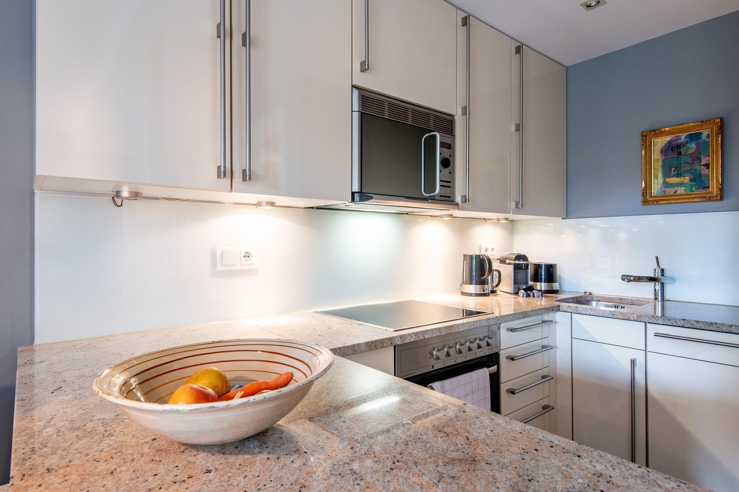 Helles gemütliches Wohnzimmer mit edlem Holzdielenboden, luxuriöse offene komplett ausgestattete Küche mit Nespresso-Maschine inkl Startset (10 Kapseln), Backofen, Herd, Mikrowelle, Geschirrspüler etc.
