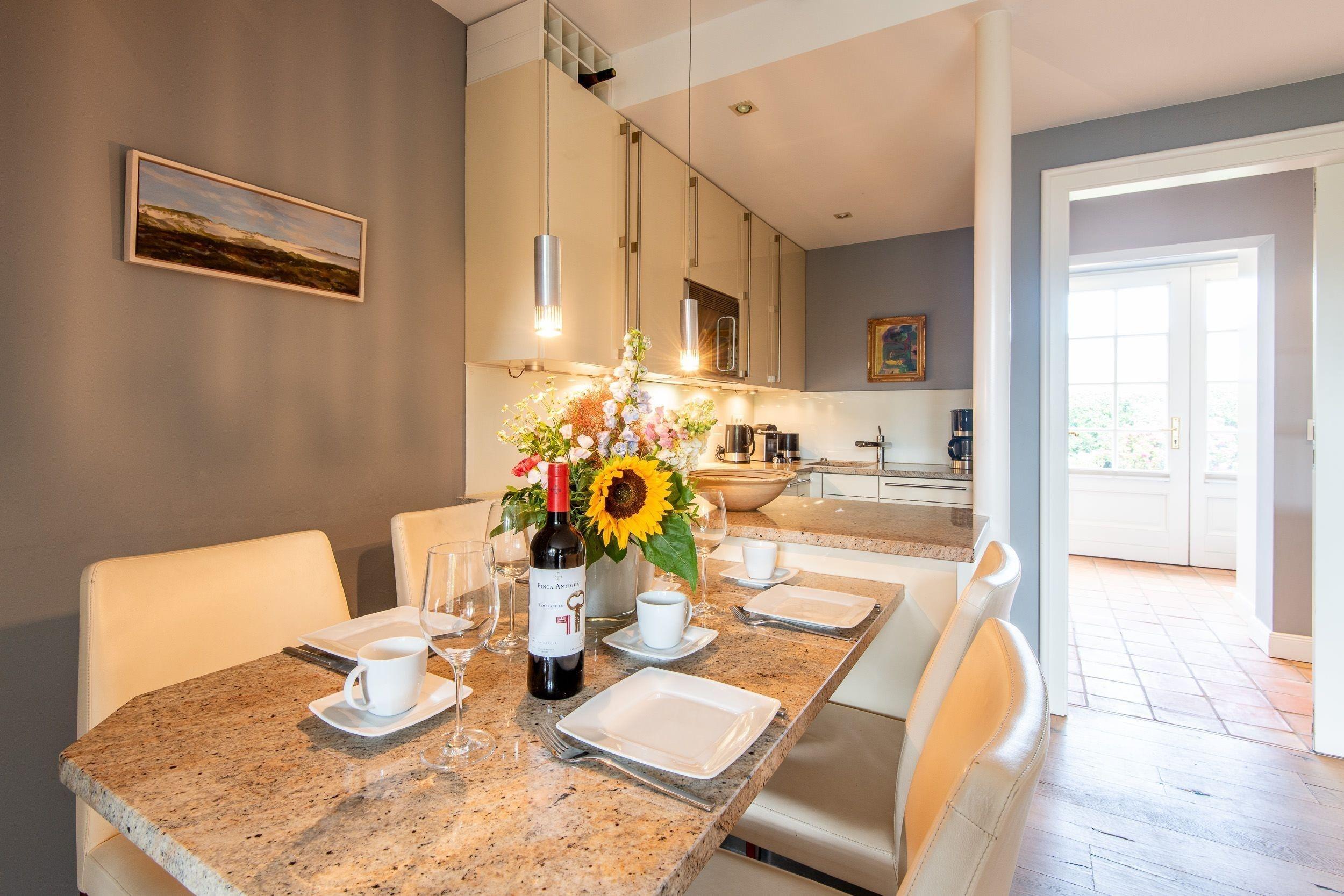 Hochwertiger und bequemer Essplatz mit Tisch für 4 Personen mit Blick in den schönen Garten.