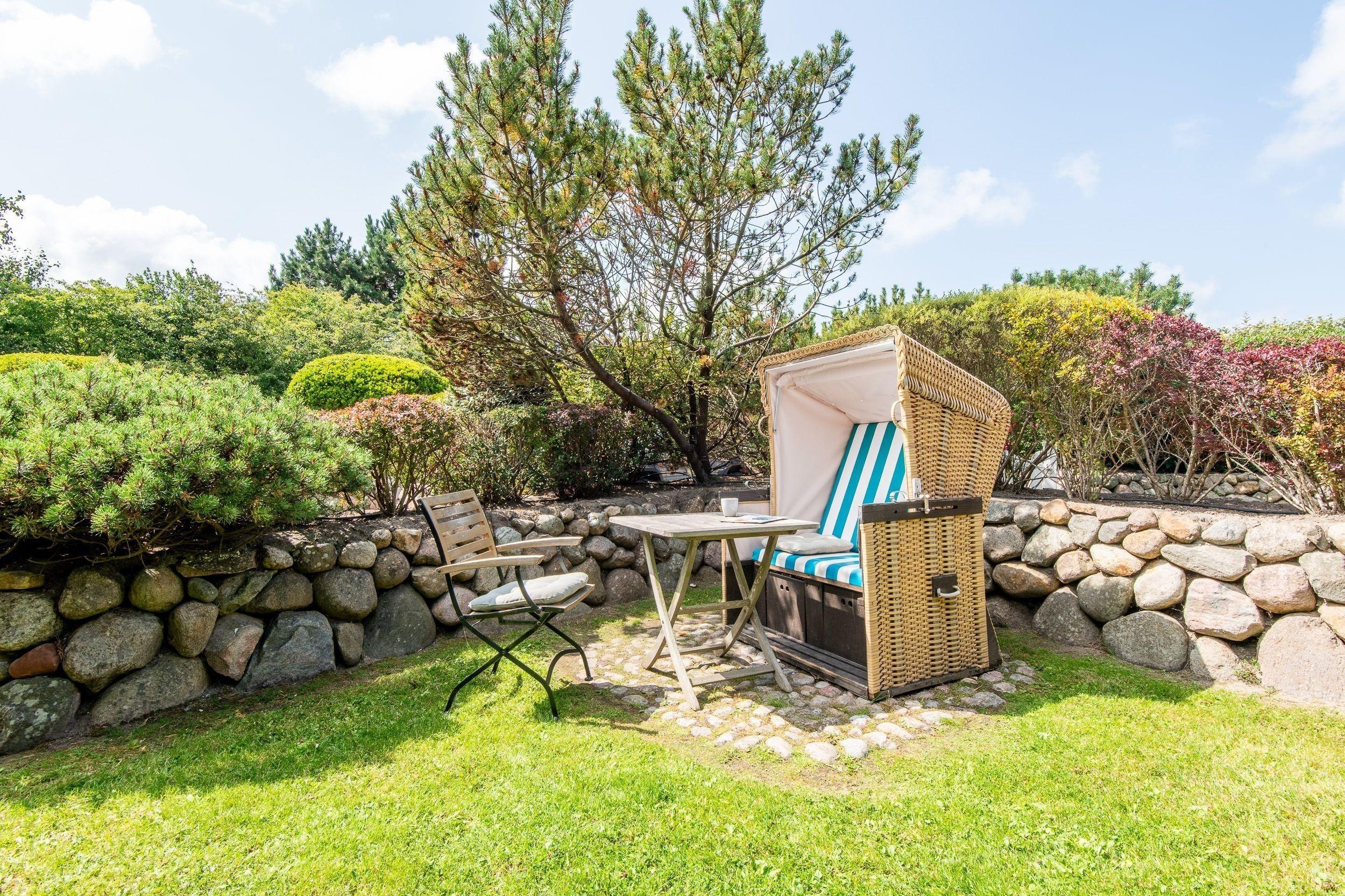 Vor dem Wohnzimmer liegende Südterrasse mit schönen Gartenmöbeln und edlem Strandkorb. Eigener sonniger Garten mit Garteneingang über einen kleinen Privatweg. Das Haus liegt ruhig, von der Straße zurück gesetzt und durch einen Privatweg verbunden.