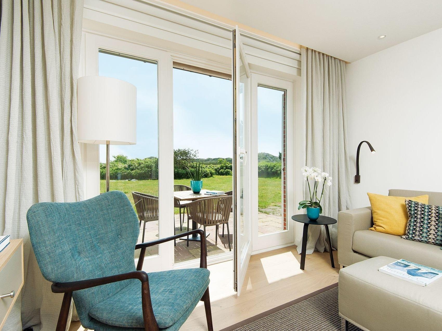 So geht „Schöner Wohnen“ für zwei Personen. Eine Perle in der Kurhausstraße mit bezaubernder Lage - acht Minuten zu Fuß bis an den Strand und acht Minuten bis Kampen Mitte - der Blick über die Dünen bis zur legendären Uwe-Düne, dazu ein Stück Garten und eine eigene Terrasse. Die 60 m² Interieur dagegen erlebten ein rasantes Upgrade: Schwebetüren sorgen für elegante Abtrennungen und für eine großzügige Optik. Ess- und Loungebereich sind auf vier Personen ausgelegt und bieten sogar Platz für eventuelle Gäste unserer Gäste. Die Küchenzeile überzeugt Pragmatiker wie Ästheten. Die Dusche mit direktem Zugang vom Doppelschlafzimmer begeistert genauso wie das separate WC mit modernster Sanitärtechnik. Licht und Wärme werden über ein iPad im Flur gesteuert. Das K6 ist in jeder Hinsicht ein Traum - nicht zuletzt in Stilfragen. Mobiliar und Stoffe in Naturtönen mit eleganten Farbakzenten sorgen mit nordisch modernem Design für eine elegante Note.