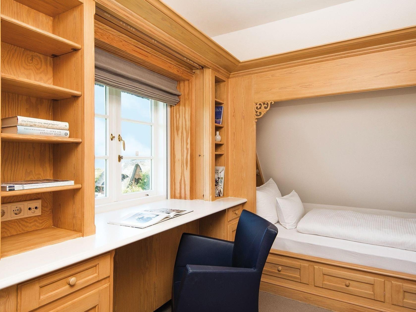 Im Außenbereich dieses Quartiers dürfen Sie sich auf das freuen, was Kampen besonders macht: Salzige Luft und phantastischer Blick aufs Watt, ökologisch wertvolle Heidebepflanzung im großen Garten, eine Sonnenkuhle mit Strandkorb und eine wunderschöne Terrasse. Im Erdgeschoss dieses Schmuckstücks erfreuen die stilvolle, offene Küche und der elegante Wohn-Essbereich mit Kamin, geschmackvollen Tischlereinbauten und Panoramafenstern Richtung Wattenmeer das Auge. Das WannenDuschbad mit Doppelwaschtisch und Sauna befindet sich im Untergeschoss und ist von stattlicher Größe. Direkt nebenan ein behagliches Doppelschlafzimmer mit geräumigem Einbauschrank. Im Obergeschoss ist der Wattblick bei Sonnenaufgang aus dem Doppelbett heraus nur schwer zu überbieten, außerdem erwartet Sie hier noch ein hübsches Badezimmer mit Dusche unter der Schräge und ein Einzelzimmer mit typisch friesischem Alkovenbett. Ein charmantes Extra: Die maßgefertigten Schreibtische im Haus verführen zum Sinnieren und kreativ sein - nicht schwer b