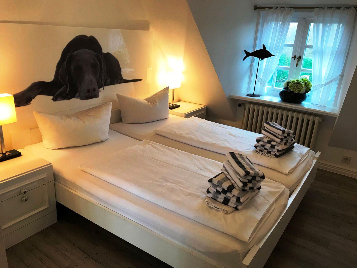 Über eine Wendeltreppe lassen sich sowohl das Ober-, als auch das Untergeschoss erreichen. Im Obergeschoss befindet sich das großes Doppelschlafzimmer. Schrägen sorgen hier ebenso wie die geschmackvoll ausgewählte Dekoration für Gemütlichkeit. Ein Einbauschrank bietet die Möglichkeit das eigene Gepäck gut zu verstauen. Das große Duschbad der Unterkunft grenzt direkt an das Schlafzimmer. Sprossenfenster sorgen für ein angenehmes Licht und viel Luft im Badezimmer. Weiße Fliesen mit umlaufender Bordüre und ein modernes Design setzen den Stil des Hauses auch im Badezimmer fort. Neben Waschtisch, Toiletten und Abstellflächen sorgen auch die feste Duschkabine sowie der Handtuchwärmer für reichlich Komfort im Badezimmer.