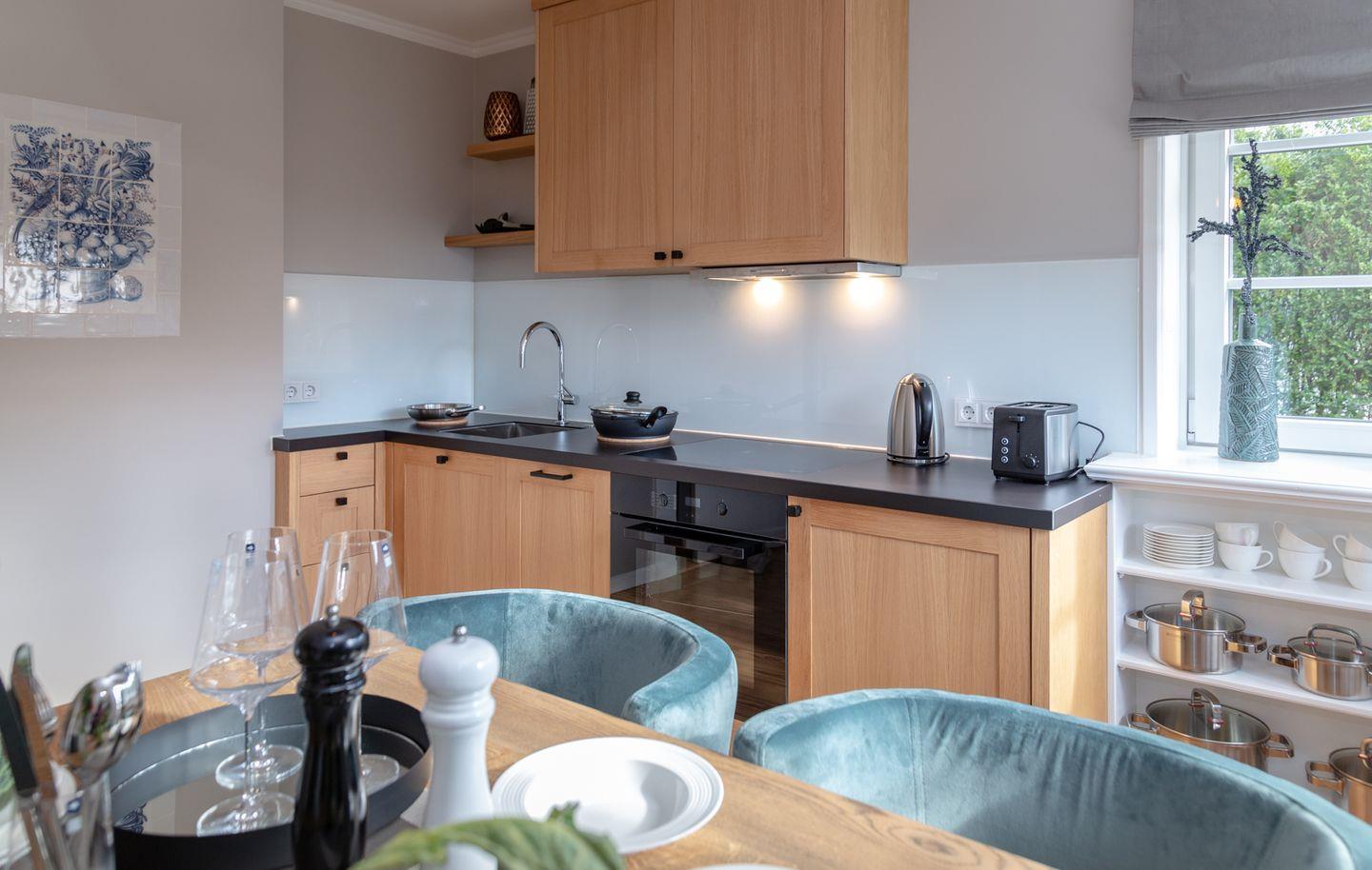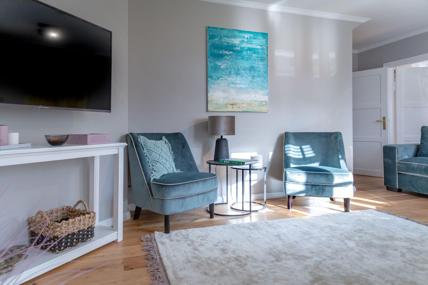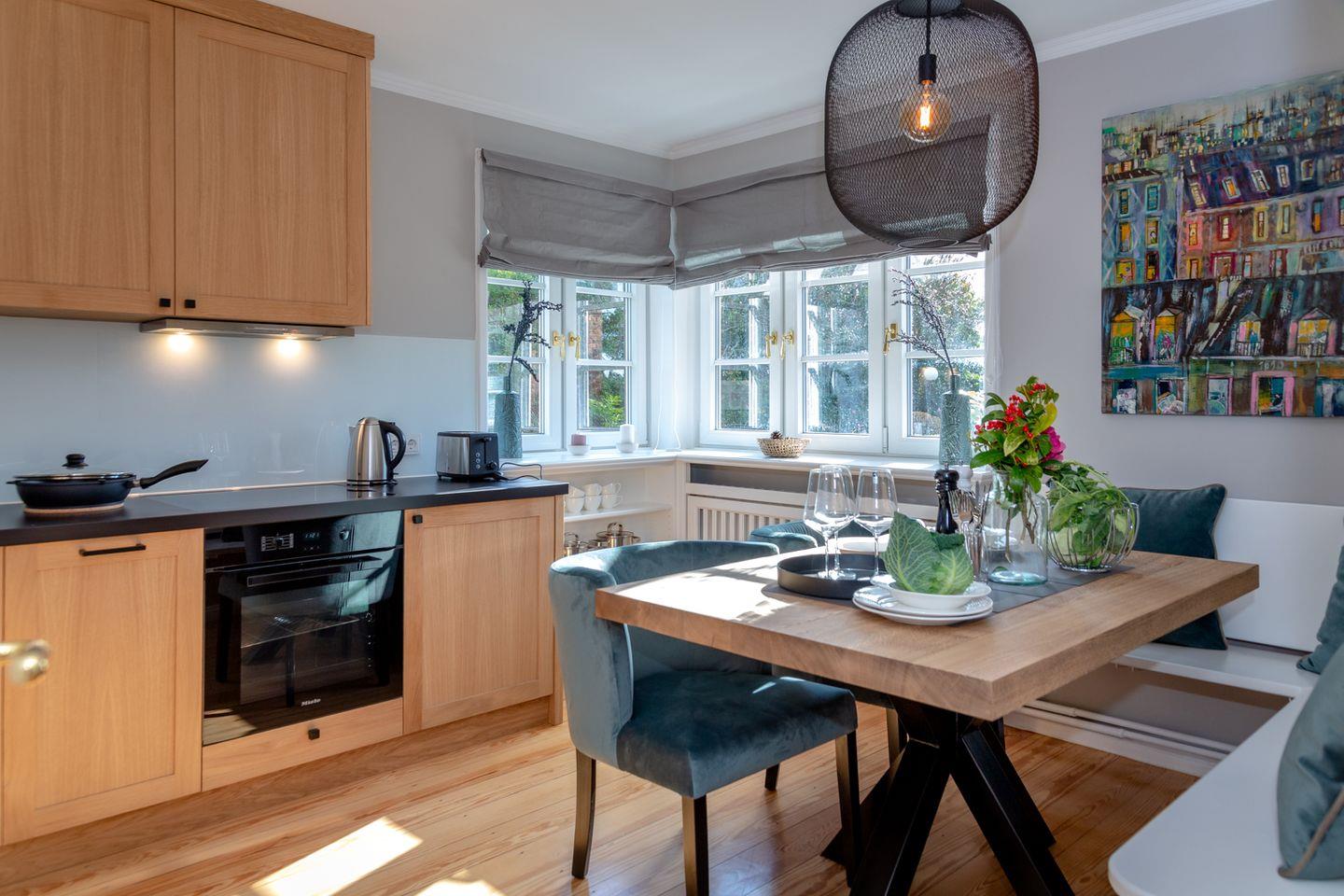 Aus der Diele mit Garderobe heraus werden Sie vom großzügigen und lichtdurchfluteten Wohnbereich empfangen. Das Sofa und die Sessel laden zum Lesen, Entspannen und Verweilen ein. Von der Diele gelangen Sie in das Badezimmer mit Doppelwaschtisch, Dusche und WC sowie in die vollausgestattete Küche mit Cerankochfeld, Toaster, Kaffeefiltermaschine sowie Nespresso-Maschine, Koch- und Tischset.