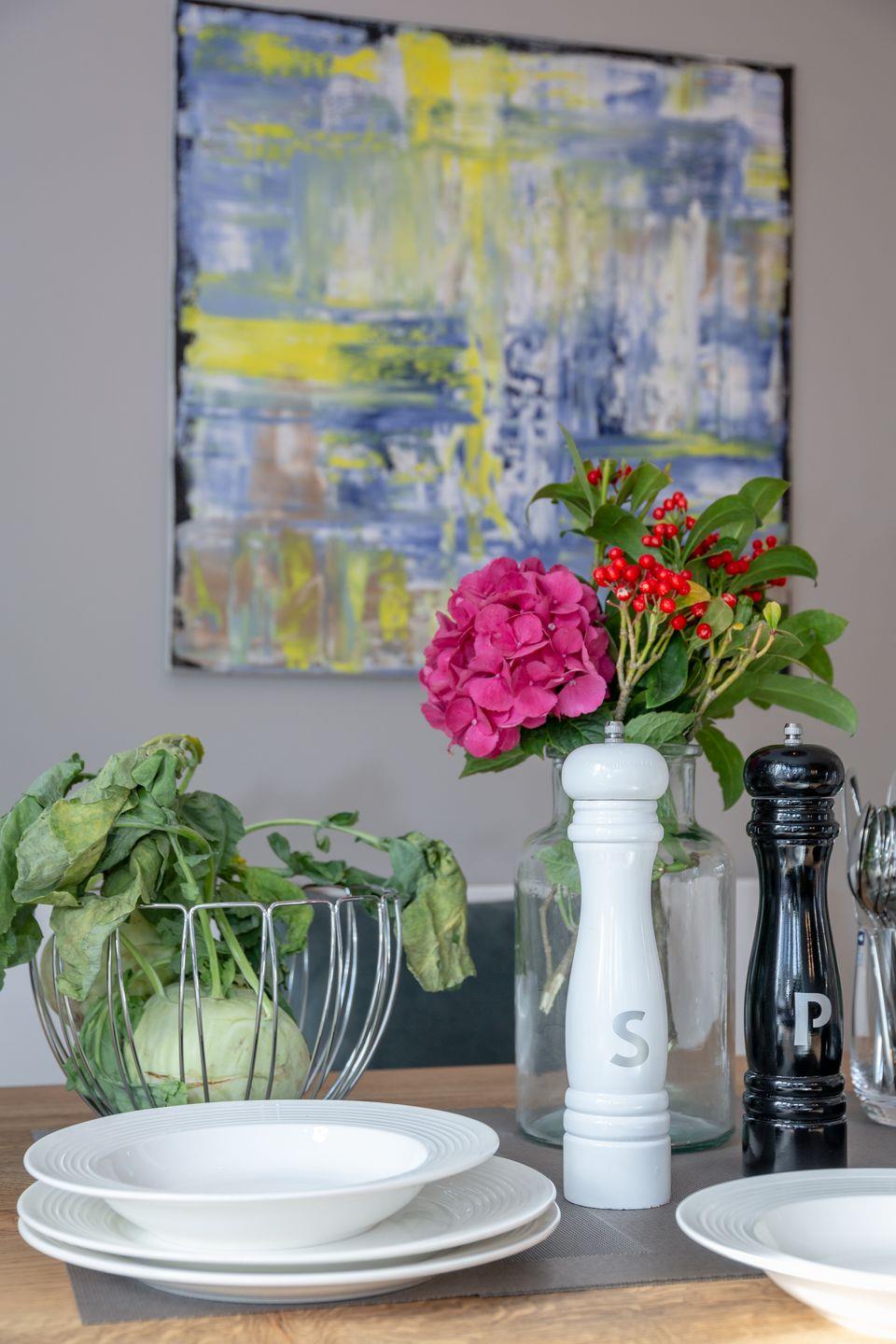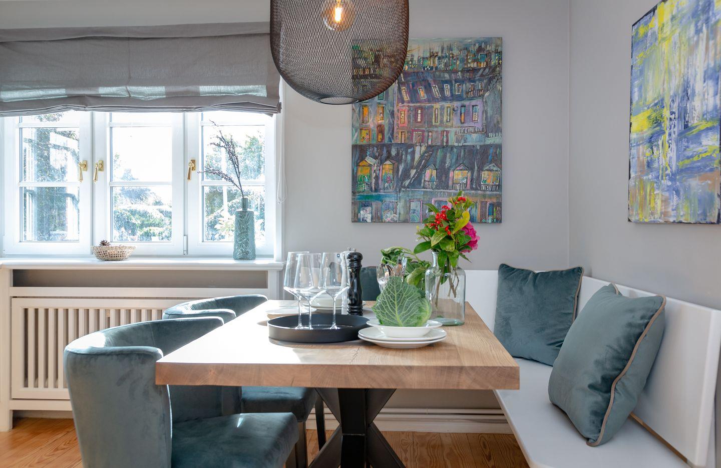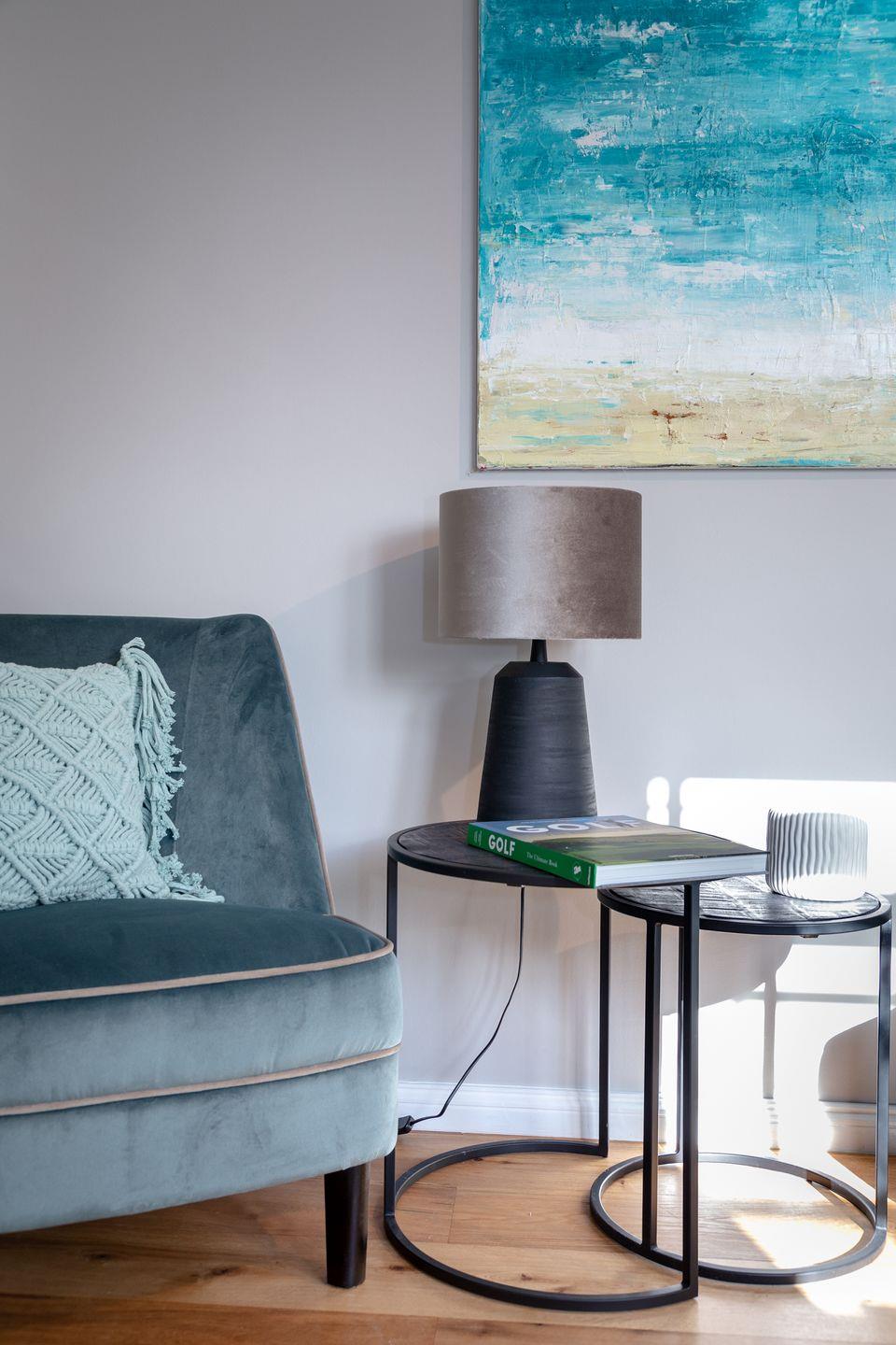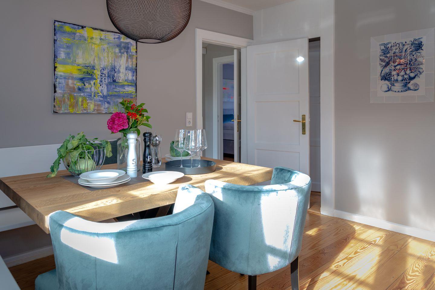 Aus der Diele mit Garderobe heraus werden Sie vom großzügigen und lichtdurchfluteten Wohnbereich empfangen. Das Sofa und die Sessel laden zum Lesen, Entspannen und Verweilen ein. Von der Diele gelangen Sie in das Badezimmer mit Doppelwaschtisch, Dusche und WC sowie in die vollausgestattete Küche mit Cerankochfeld, Toaster, Kaffeefiltermaschine sowie Nespresso-Maschine, Koch- und Tischset.