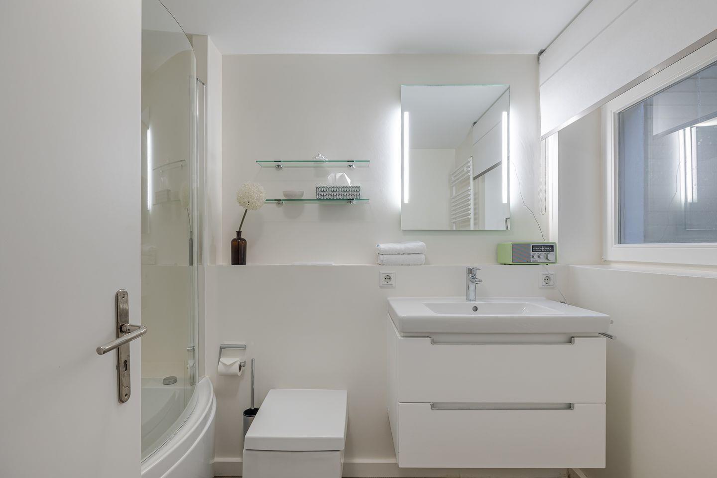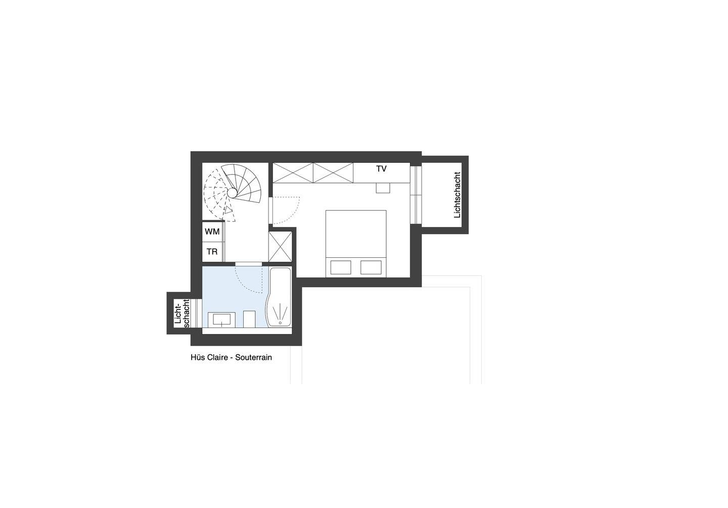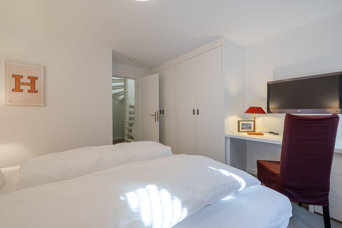 Im Obergeschoss wie im Souterrain erwarten Sie jeweils ein Schlafzimmer für 2 Personen mit bequemen Doppelbetten, TV-Geräten und jeweils eigenem Badezimmer für größtmöglichen Komfort. Im Obergeschoss befindet sich zudem ein kleiner, ruhiger Arbeitsplatz mit Schreibtisch.