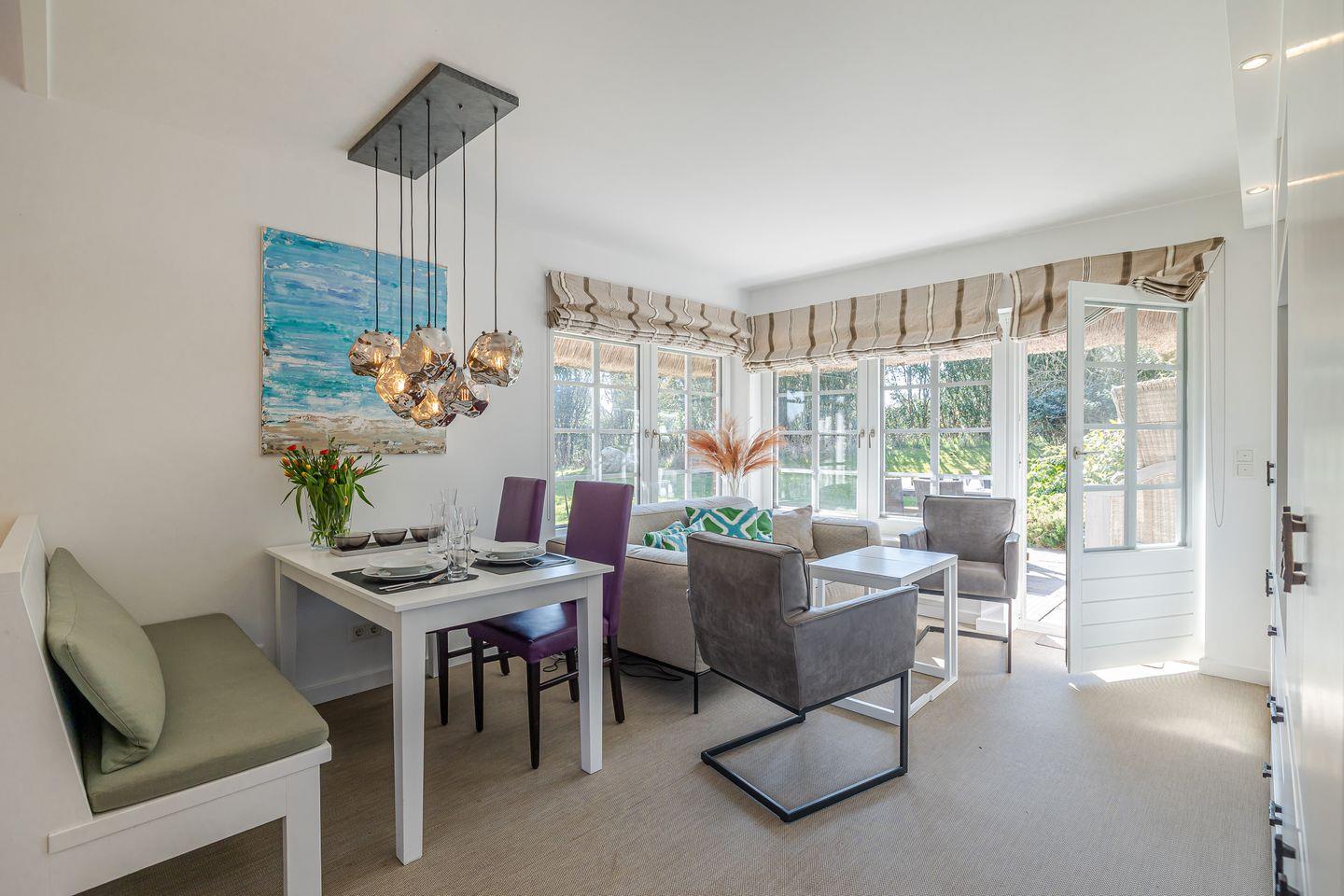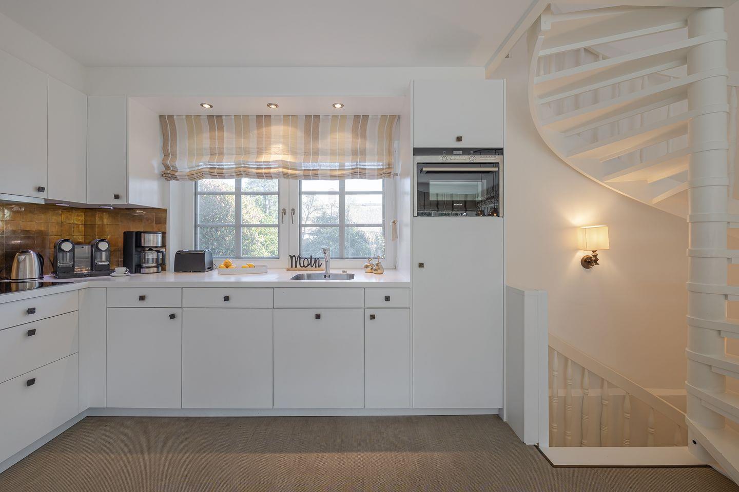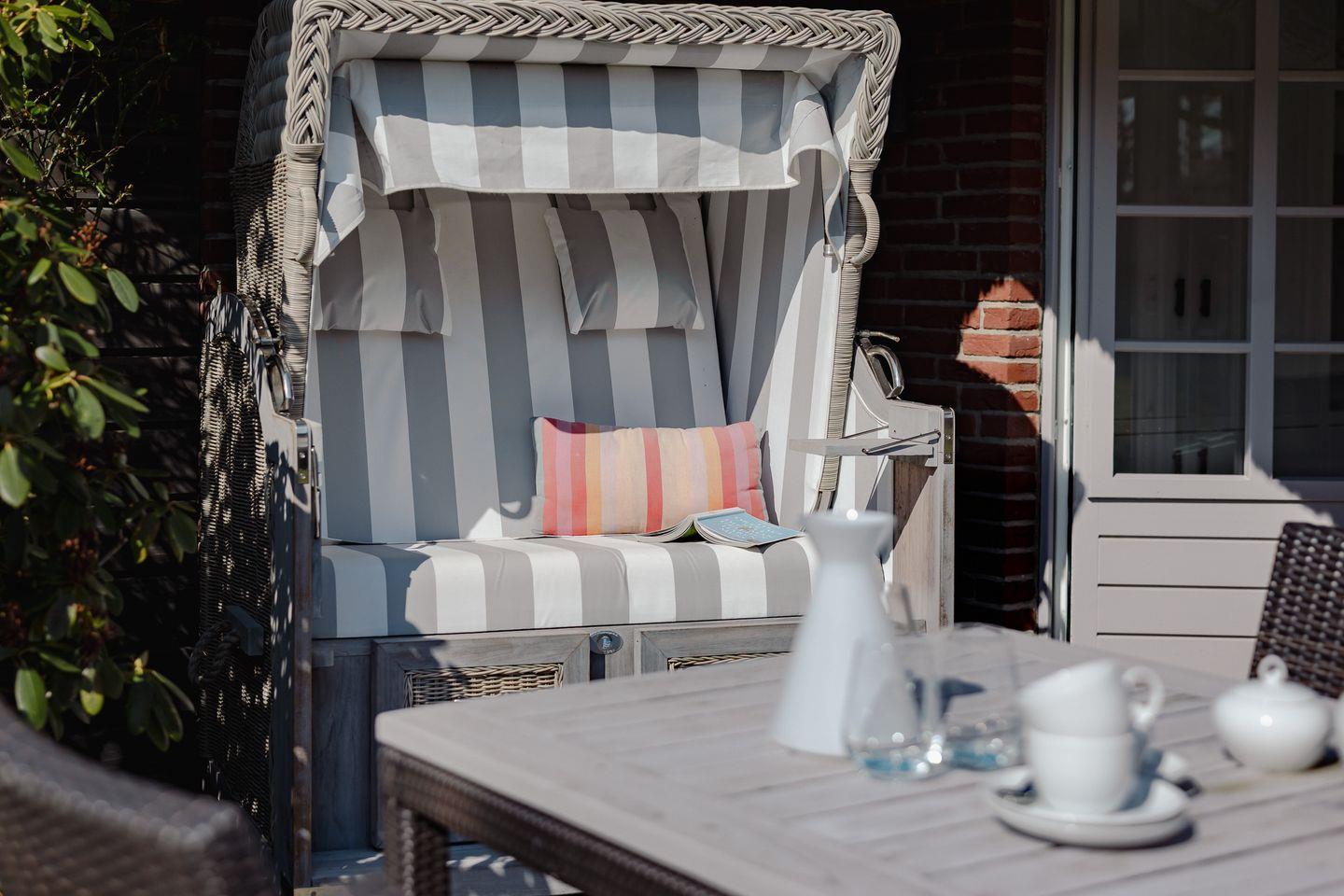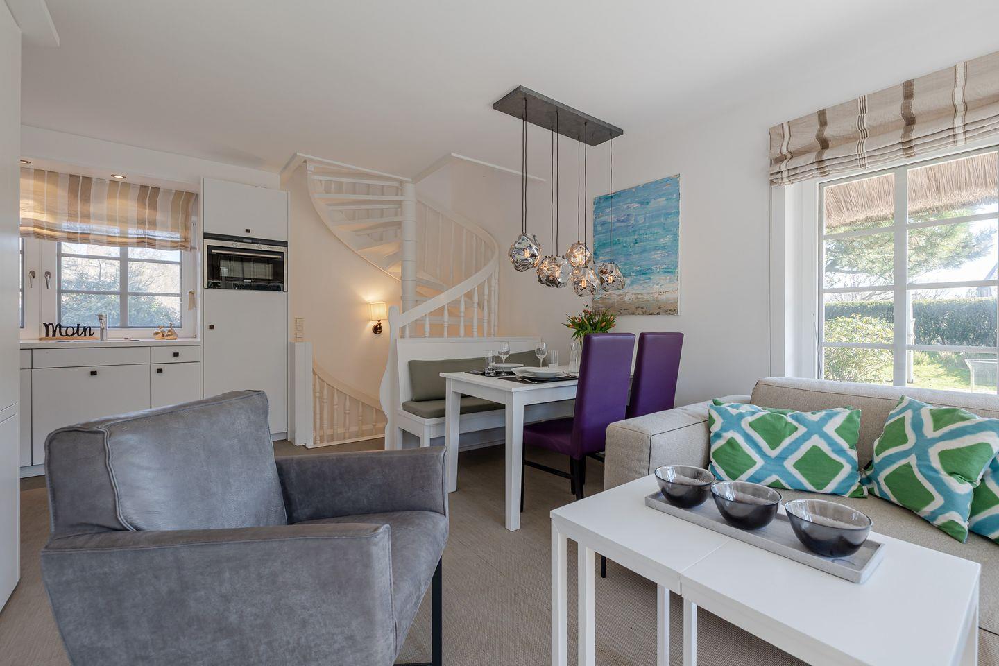 Im Erdgeschoss werden Sie vom Garderoben-Bereich in die voll ausgestatte Küche eingeladen. Die Küche ist mit einer Nespresso-Maschine sowie mit einer Kaffeefltermaschine ausgestattet. Von der Küche blicken Sie in den gemütlich gestalteten Wohn-/Essbereich. Dort erwarten Sie ein ausziehbarer Esstisch mit Sitzbank und Stühlen sowie eine einladende Sofa-Ecke mit traumhaftem Gartenblick. Von dort gelangen Sie in den ruhigen Garten, wo sie die Sonne genießen können, ob beim Kaffee am Terrassentisch oder beim Lesen im Strandkorb.