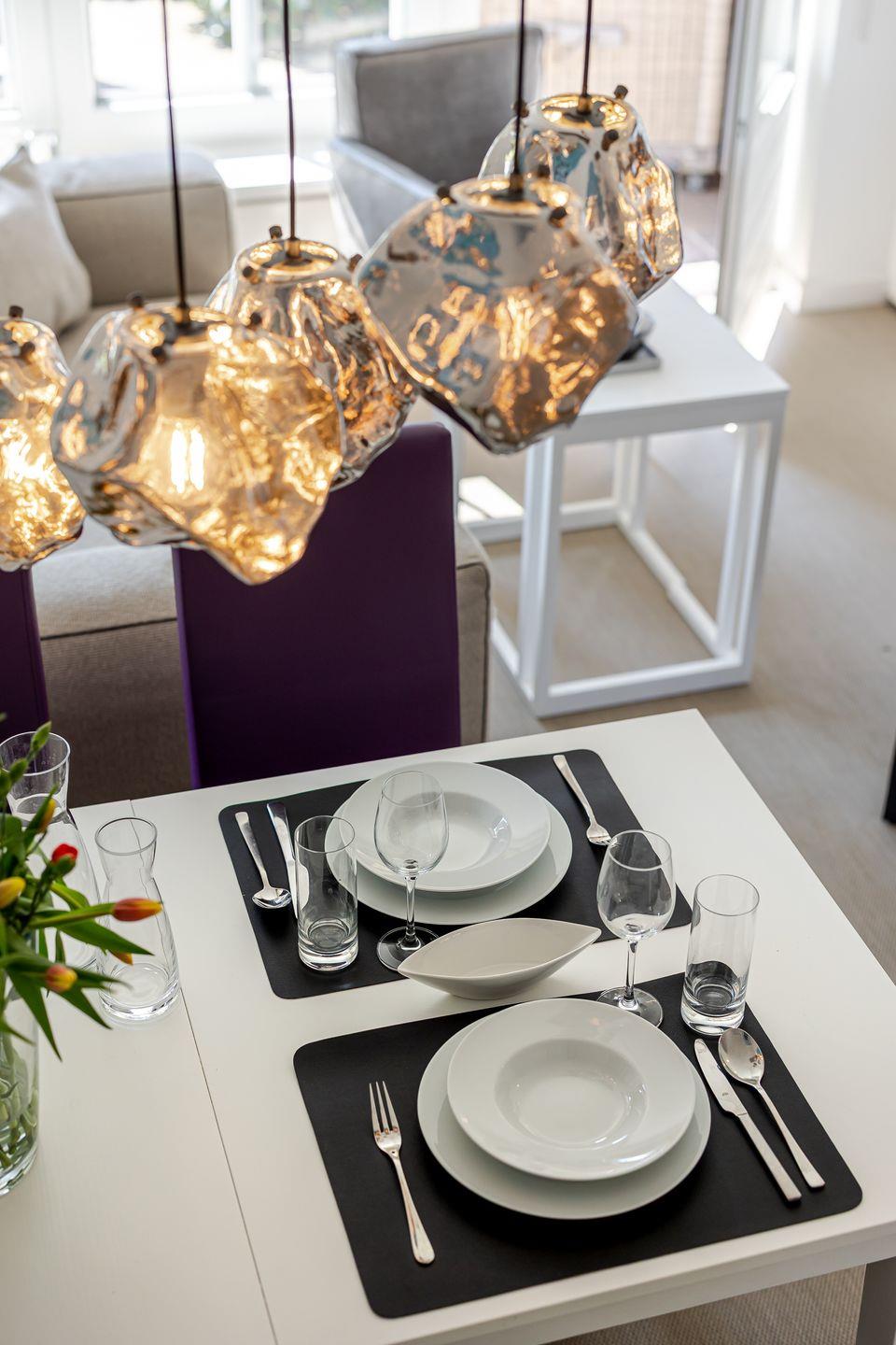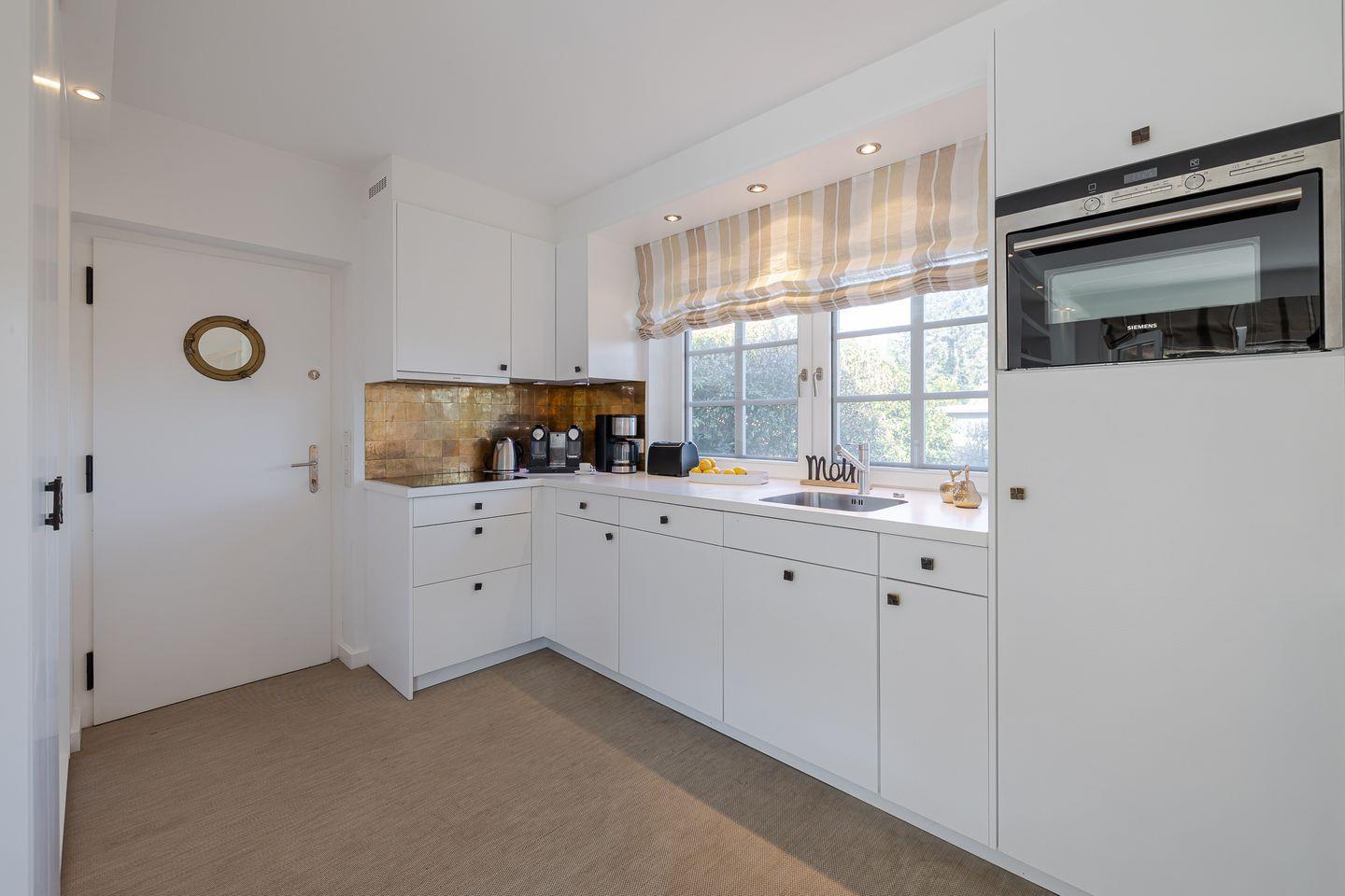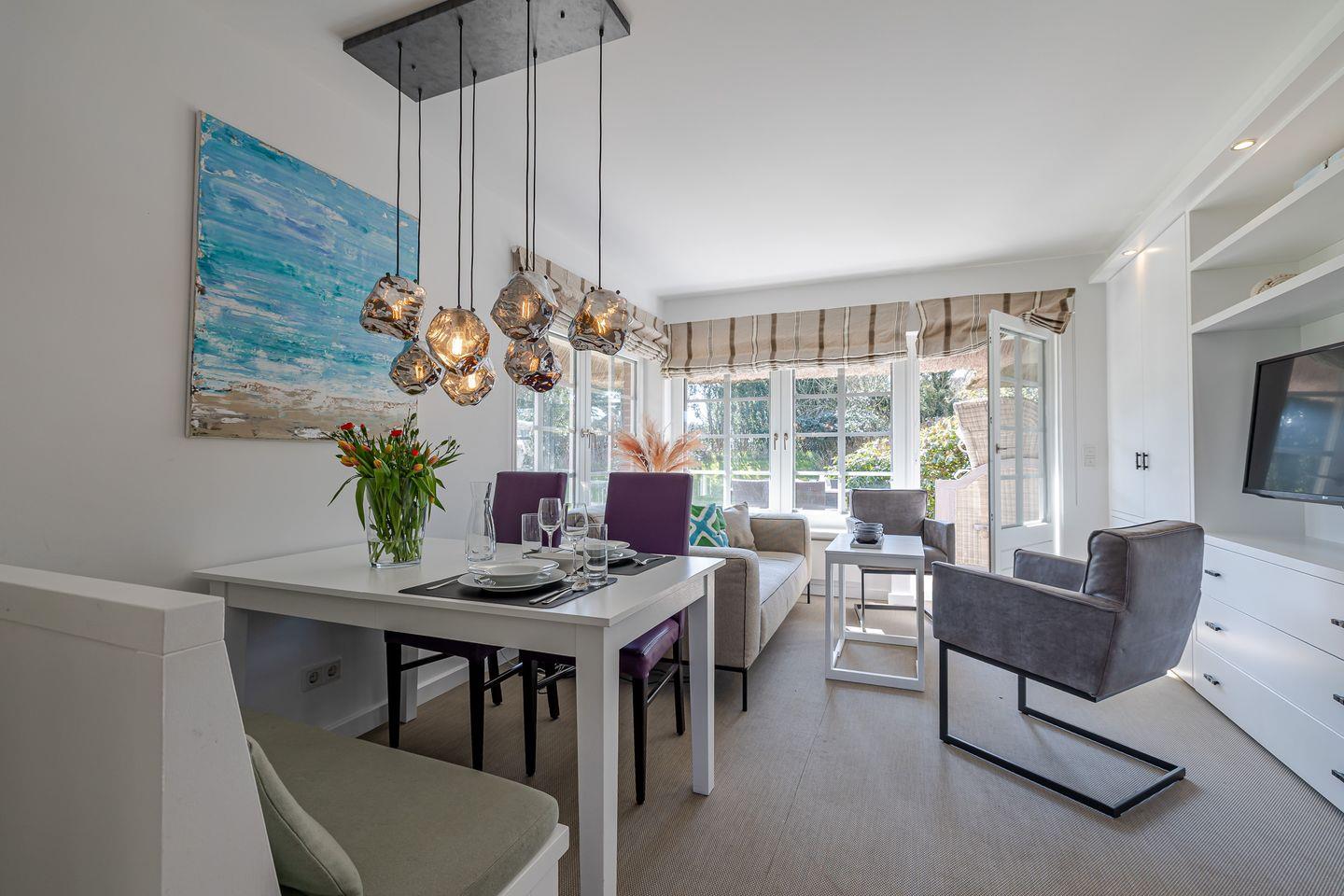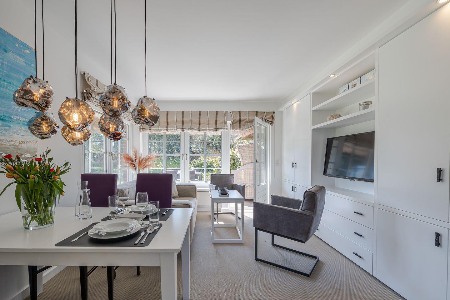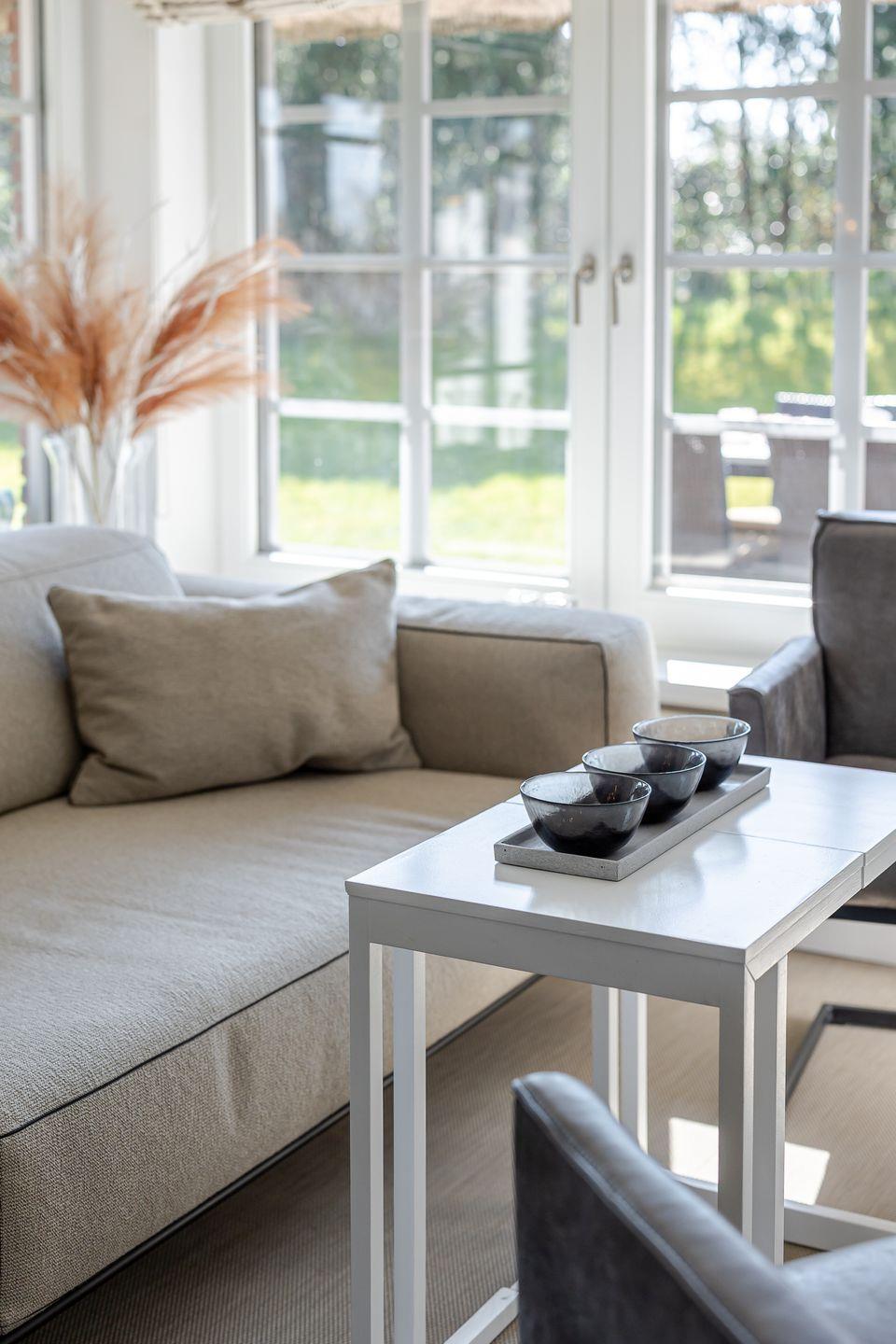 Im Erdgeschoss werden Sie vom Garderoben-Bereich in die voll ausgestatte Küche eingeladen. Die Küche ist mit einer Nespresso-Maschine sowie mit einer Kaffeefltermaschine ausgestattet. Von der Küche blicken Sie in den gemütlich gestalteten Wohn-/Essbereich. Dort erwarten Sie ein ausziehbarer Esstisch mit Sitzbank und Stühlen sowie eine einladende Sofa-Ecke mit traumhaftem Gartenblick. Von dort gelangen Sie in den ruhigen Garten, wo sie die Sonne genießen können, ob beim Kaffee am Terrassentisch oder beim Lesen im Strandkorb.