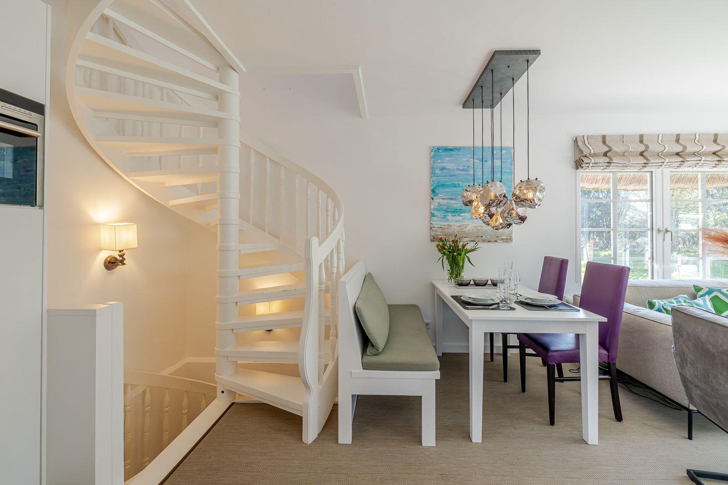 Die Wendeltreppe im Wohn-/Esszimmer verbindet alle Bereiche miteinander.