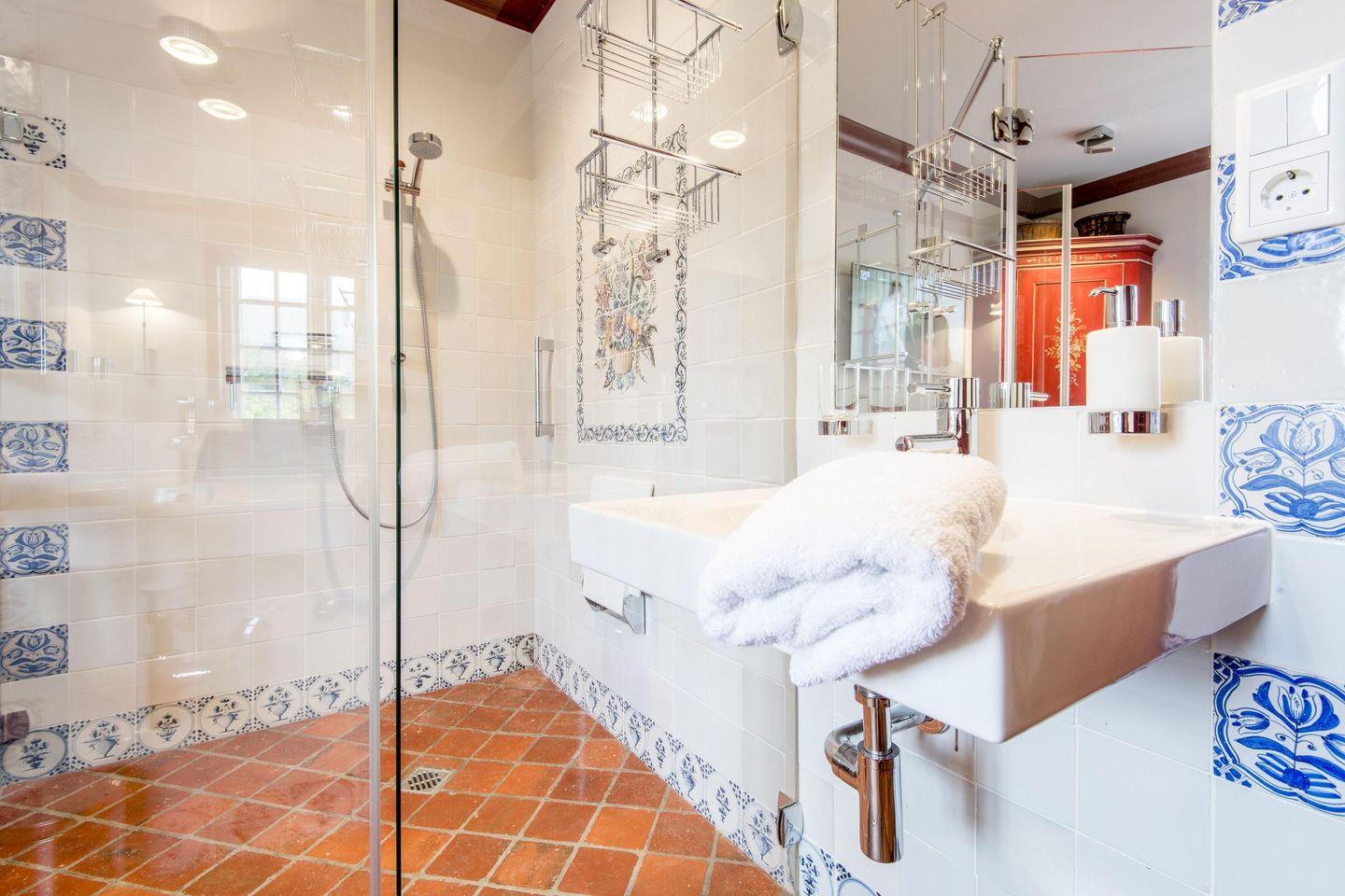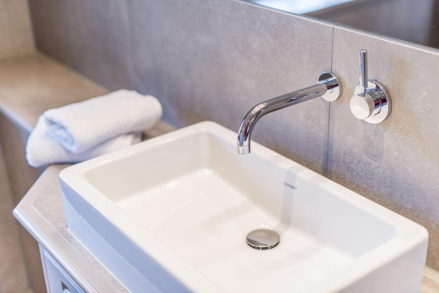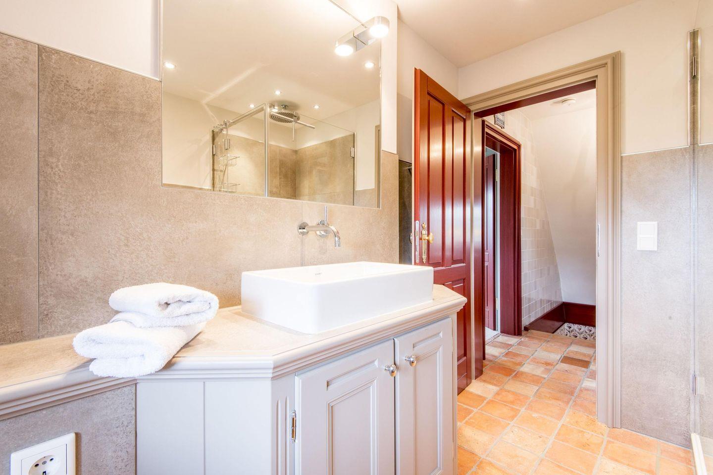 Das Haus verfügt im OG über ein hochmodernes Bad mit Tageslicht, bodengleicher Dusche und Handtuchwärmer. Im EG finden Sie eine zweite, barrierefreie Dusche und ein Waschbecken. Ein separates Gäste-WC sorgt für zusätzlichen Komfort.