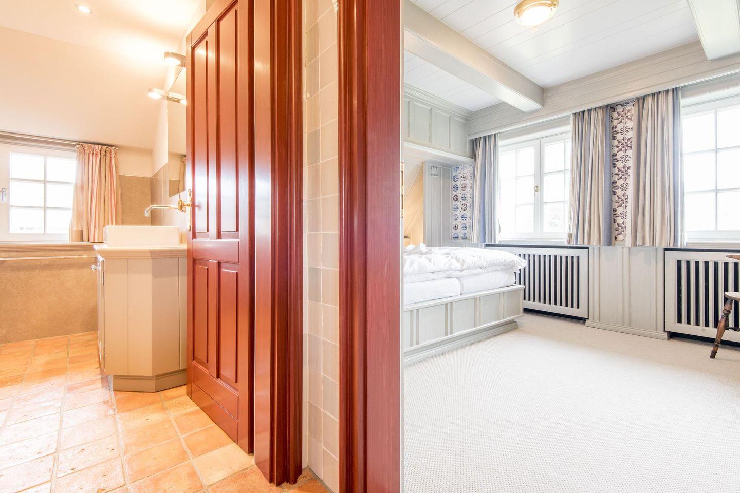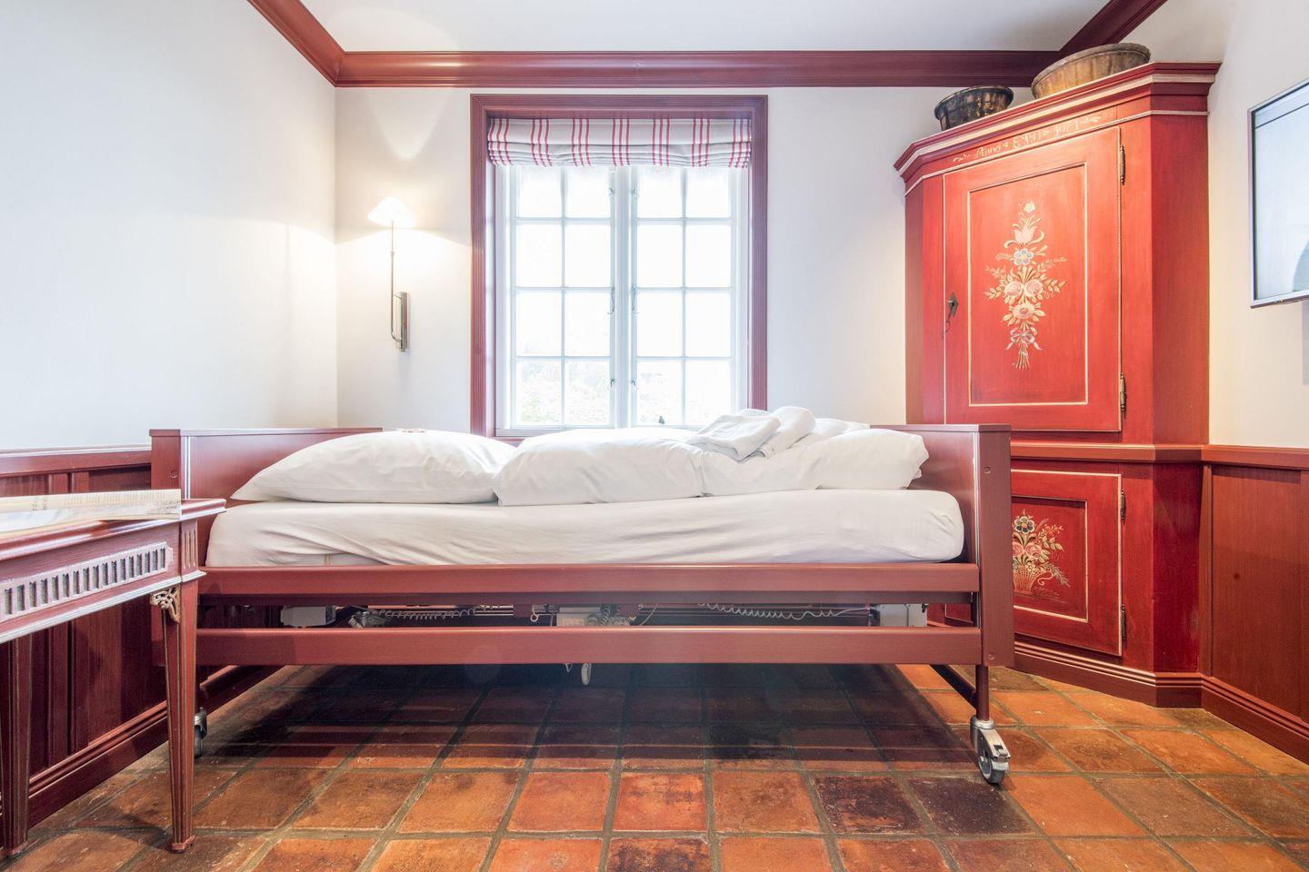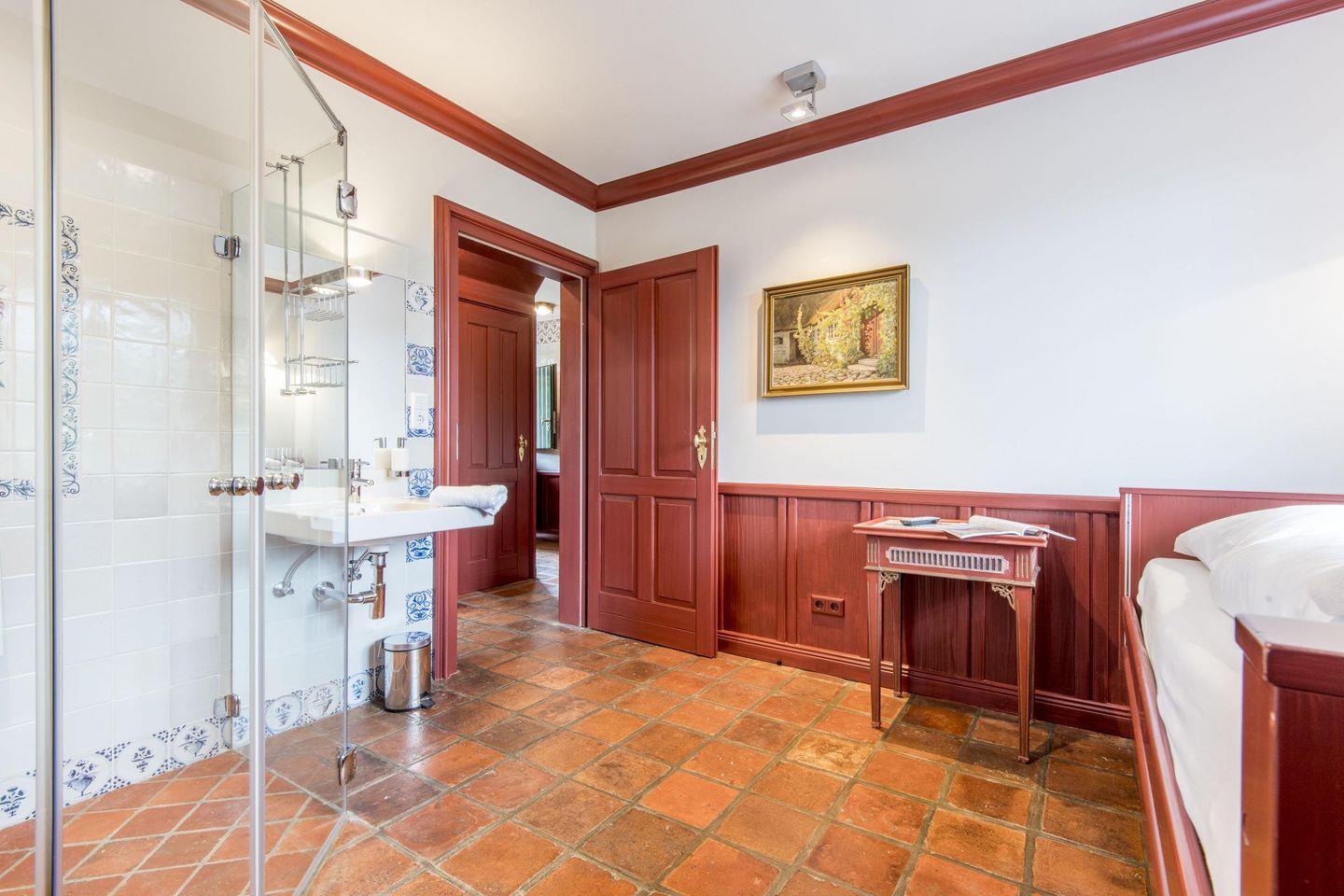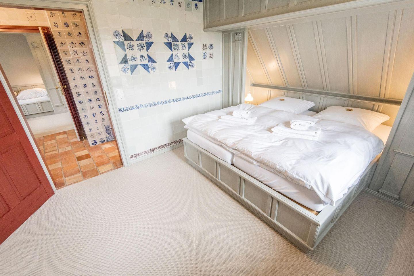 Das Friesenhaus bietet drei komfortable Schlafzimmer, die ideal auf die Bedürfnisse der Gäste abgestimmt sind. Das erste Schlafzimmer ist mit einem großzügigen Doppelbett (180x200 cm) ausgestattet und verfügt über typisch friesische Tischlereinbauten, die ausreichend Stauraum bieten und die gemütliche Atmosphäre des Raums unterstreichen. Das zweite Schlafzimmer hält mit seinen zwei Einzelbetten (je 90x200 cm) und den hochwertigen Einbauten ebenfalls eine entspannte und stilvolle Rückzugsmöglichkeit bereit. Im dritten, barrierefreien Schlafzimmer steht ein bequemes Einzelbett (90x200 cm) bereit und es bietet direkten Zugang zu einer eigenen, barrierefreien Dusche mit Waschbecken.
