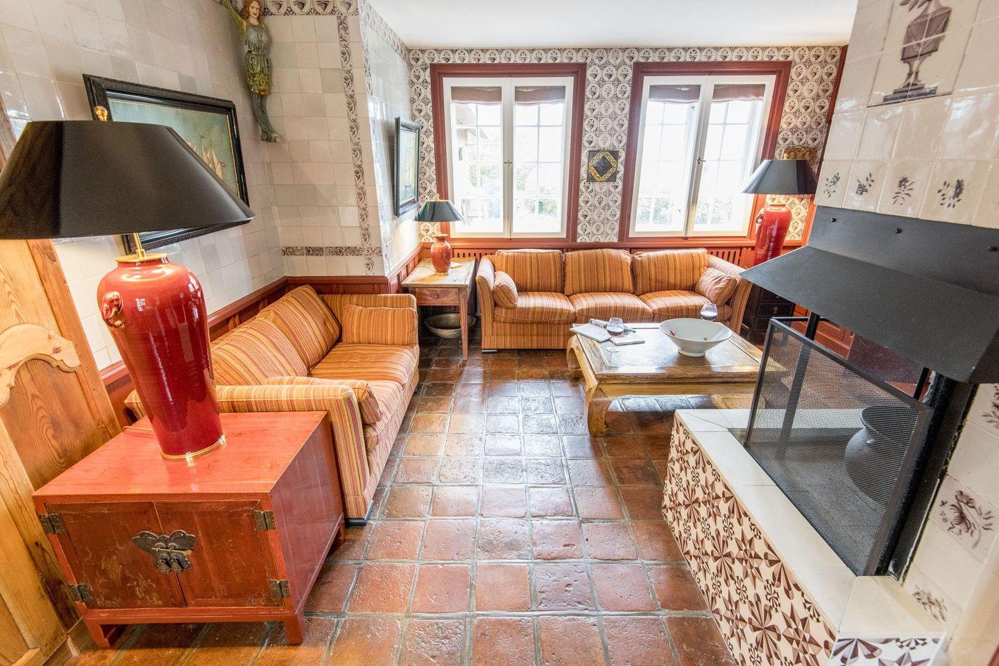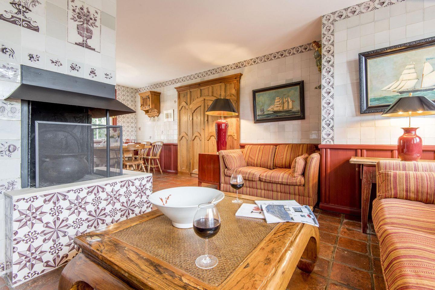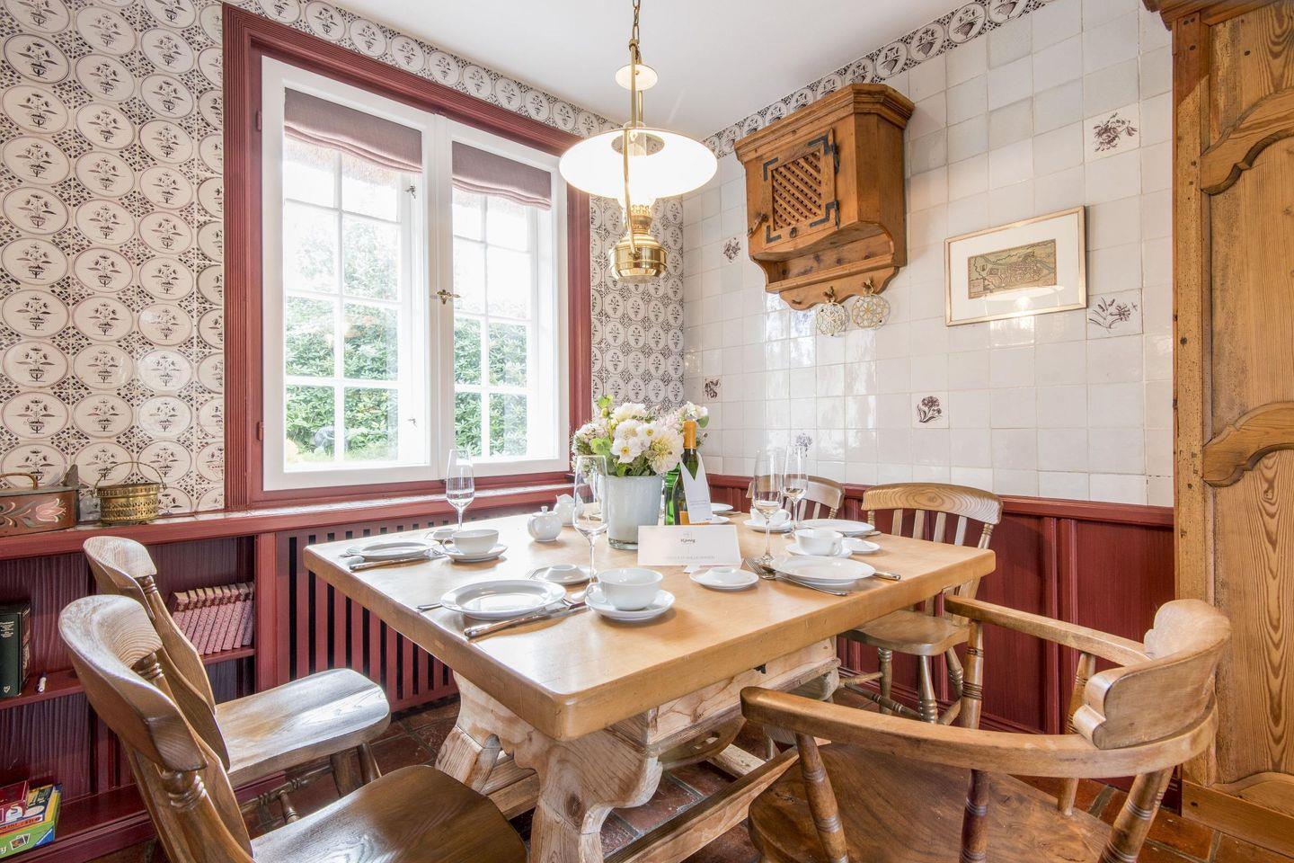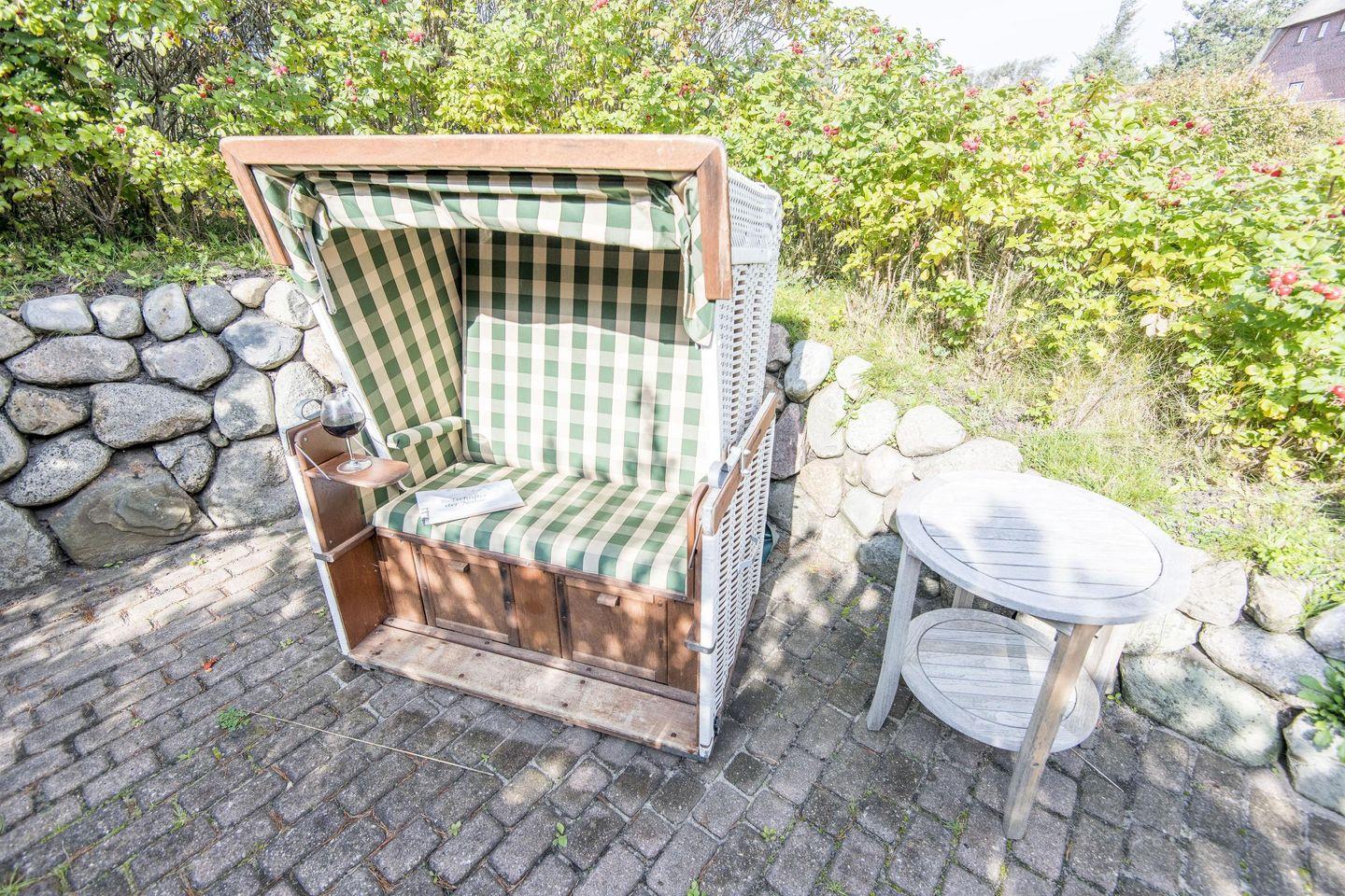 Im gemütlichen Wohn-/Essbereich lädt eine Sitzecke mit TV zum Verweilen ein und der rustikale Esstisch bietet Platz für gesellige Stunden mit Familie und Freunden. Die Wände sind mit original Delfter Kacheln verziert und Kunstgegenstände aus aller Welt verleihen Pidder Lüng ein ganz besonderes Flair. Genießen Sie den ersten Kaffee am Morgen in frischer Sylter Luft auf bequemen Gartenstühlen direkt neben der typisch friesischen Klönschnack-Tür mit Blick in den einmaligen Garten Mit etwas Glück werden Sie sogar vom Rehwild der Insel begrüßt. In der Sonnenkuhle finden Sie weitere Gartenmöbel und einen Strandkorb.