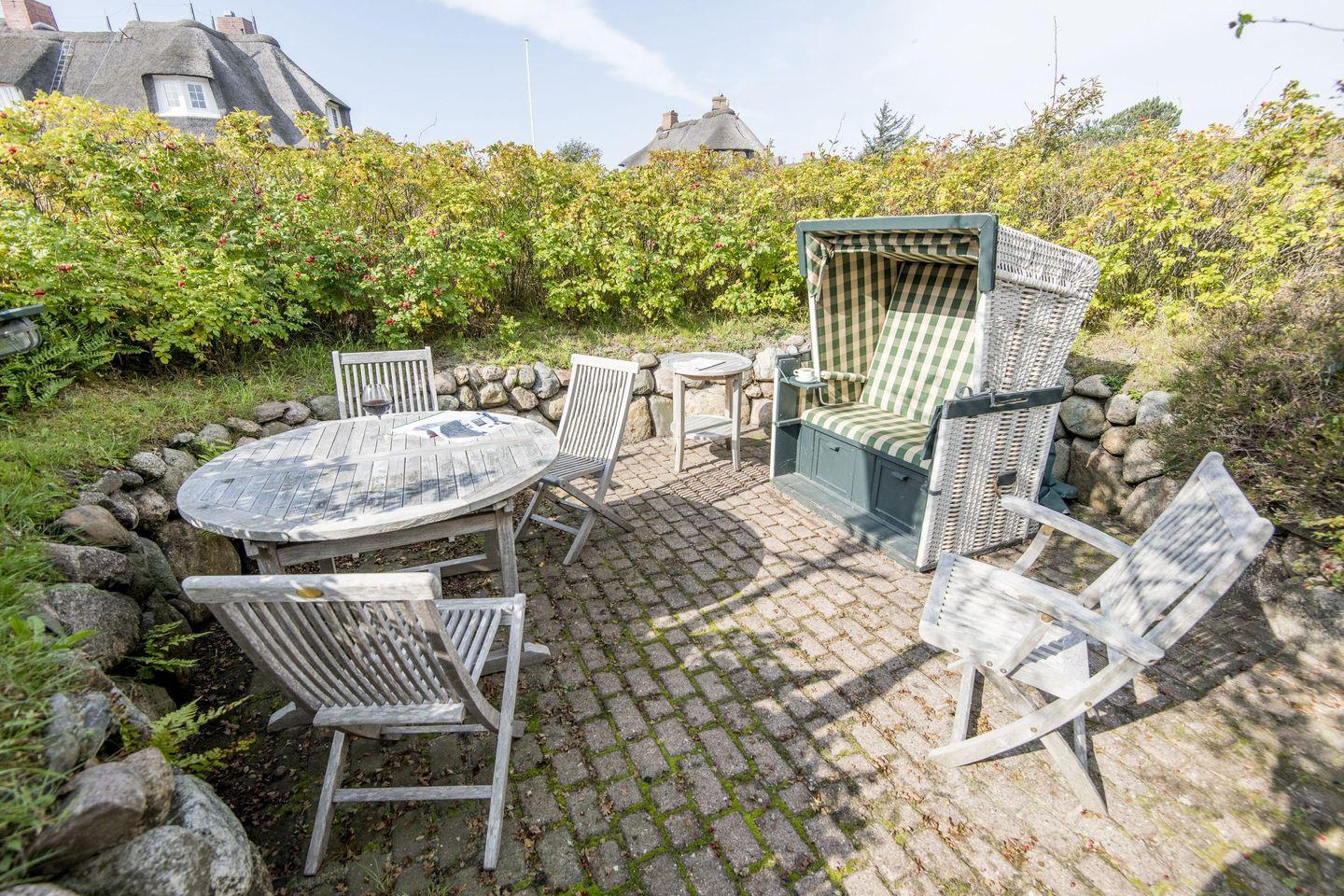 Auf der sonnigen Terrasse können Sie im Strandkorb die Meeresluft genießen und den Blick ins Grüne schweifen lassen – ein idealer Ort für ruhige Stunden im Freien oder ein Frühstück im Garten.