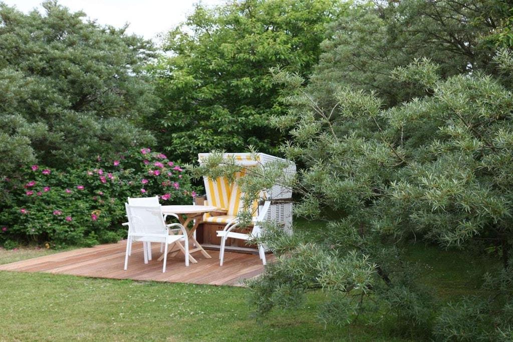 Vores feriehus ligger i hjertet af det gamle Kampen på en stor, solrig grund. Huset i frisisk stil med stråtag er opdelt i fire boligenheder. Mere information på vores hjemmeside: schroeders-haus-kampen.de Vores ferielejlighed 1A, sydøstvendt, ca. 80 m², er egnet til 2-3 personer. Stueetagen har en stor stue-spisestue (ca. 42 m²) med et integreret køkken, udstyret med alle moderne bekvemmeligheder (varmluftovn, emhætte, opvaskemaskine, mikrobølgeovn, Nespresso osv.). En komfortabel trætrappe fører op til øverste etage, hvor der er et soveværelse med dobbeltseng (smart-tv) og et soveværelse med to enkeltsenge, samt et moderne badeværelse med toilet og et opbevaringsrum. Stue- og spisestuen er udstyret med smart-tv, stereoanlæg, DVD- og Blu-ray-afspiller.