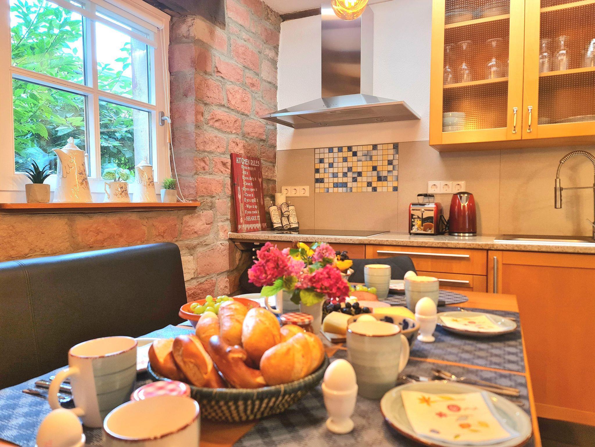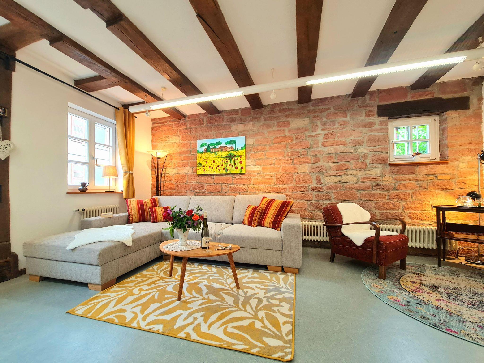 Das stilvolle Fachwerk Apartment mit seinen charmanten Balken und der offenen Natursteinwand in Wohnzimmer und Küche, bietet dir eine hochwertige Ausstattung mit Platz für 6 Gäste. Damit du dich so wohl fühlst wie zu Hause halten wir für dich alle Annehmlichkeiten bereit.