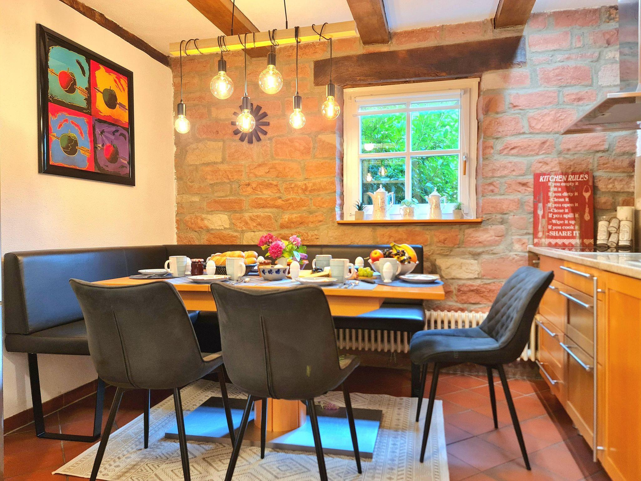 Wir vermieten Euch ein stilvoll gestaltetes und modern eingerichtetes Fachwerkhaus mit 3 separaten Ferienwohnungen für insgesamt bis zu 16 Personen zum Relaxen und Urlauben mit eigenen Parkplätzen. Ihr seid mitten in der Stadt Kandel und könnt den Ortskern und alle wichtigen Geschäfte fußläufig erreichen. Vom Bahnhof sind wir ca. 700 m entfernt. Karlsruhe und das Dt. Weintor sind ca. 15 - 20 km entfernt.