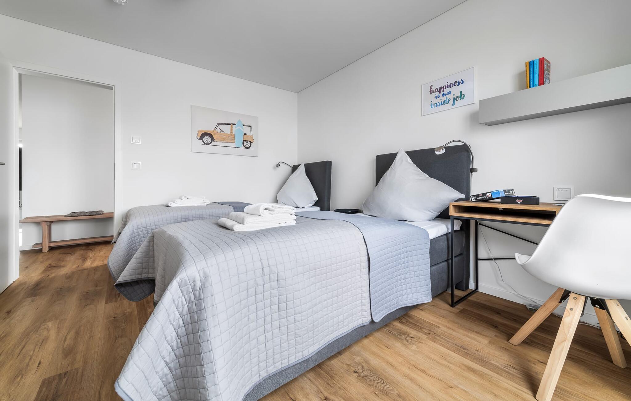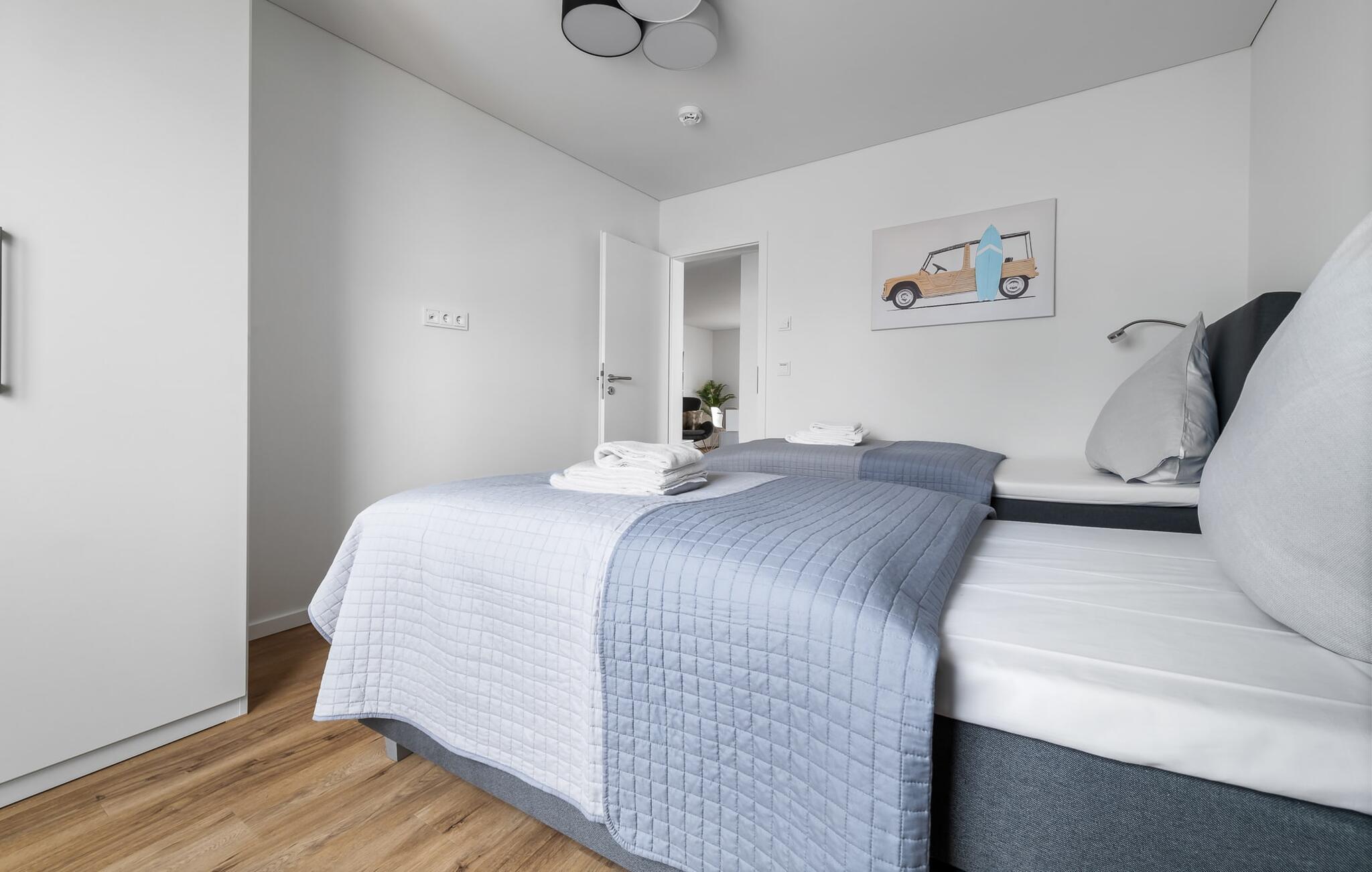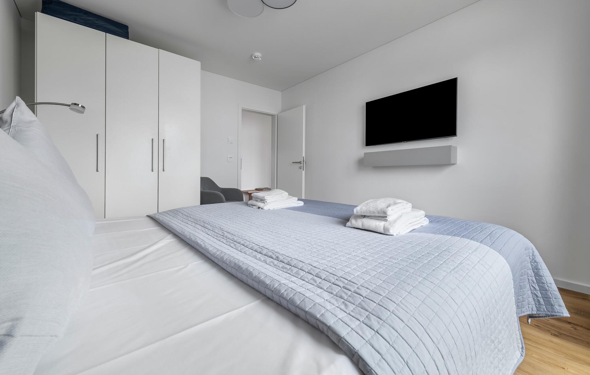 Afslapningsområdet består af to soveværelser. Det første soveværelse har en dobbelt boxmadrasseng og et fladskærms-tv, mens det andet soveværelse har to enkeltsenge med boxmadras, perfekt til afslapning efter en begivenhedsrig dag. Der er også et lille arbejdsområde her, hvilket gør lejligheden ideel til at arbejde hjemmefra. Begge soveværelser kan mørklægges med plisségardiner og gardiner.