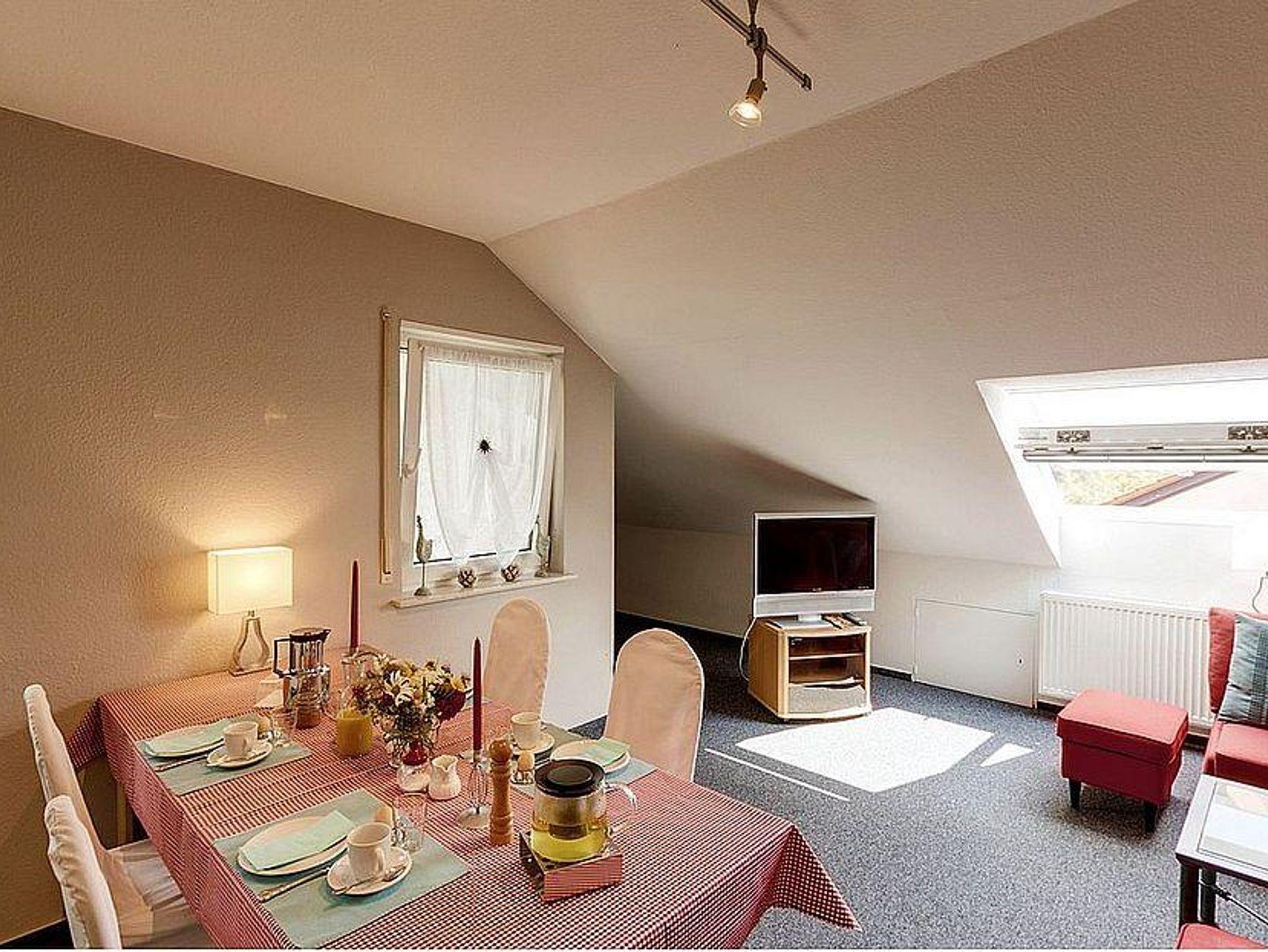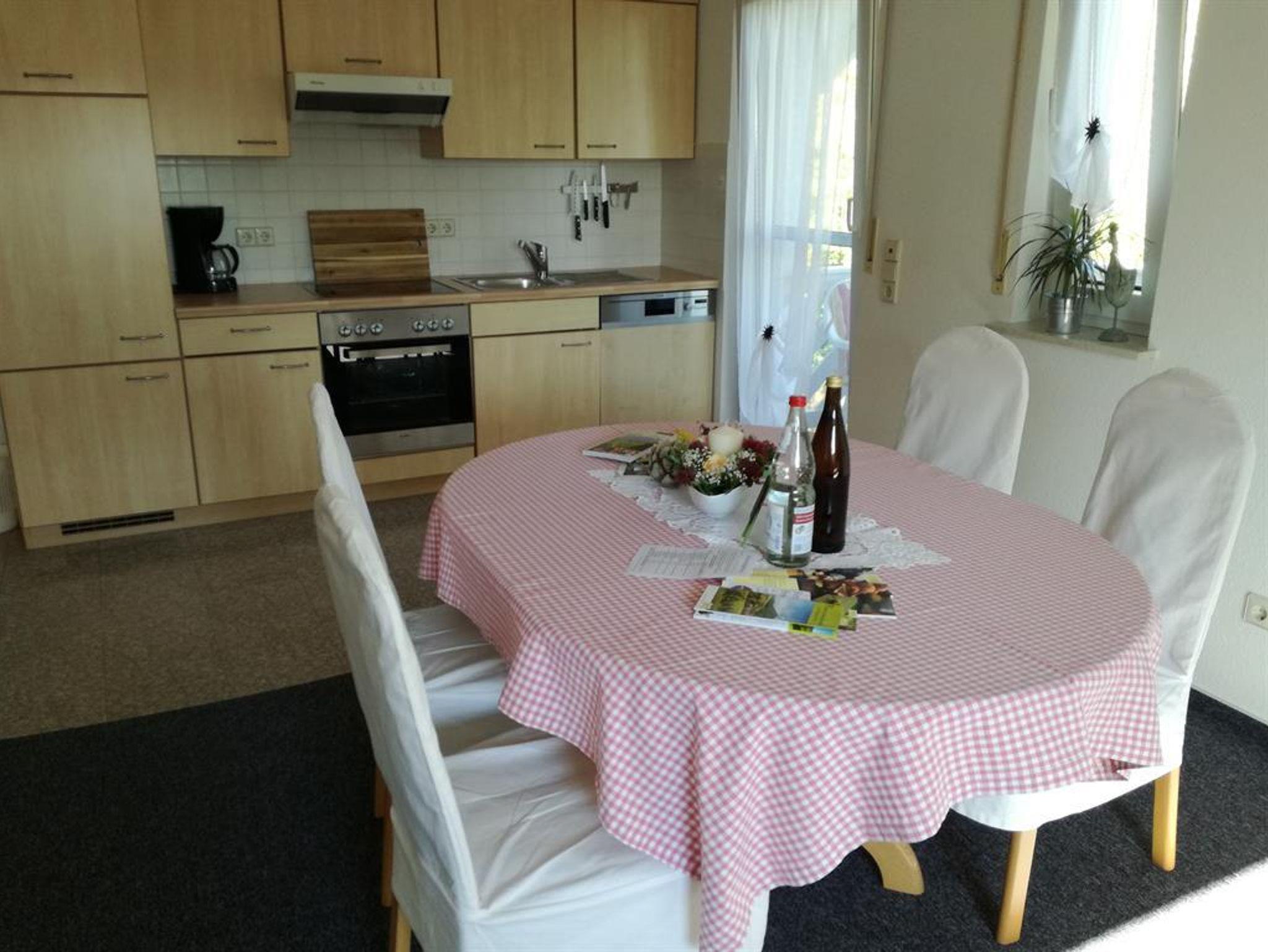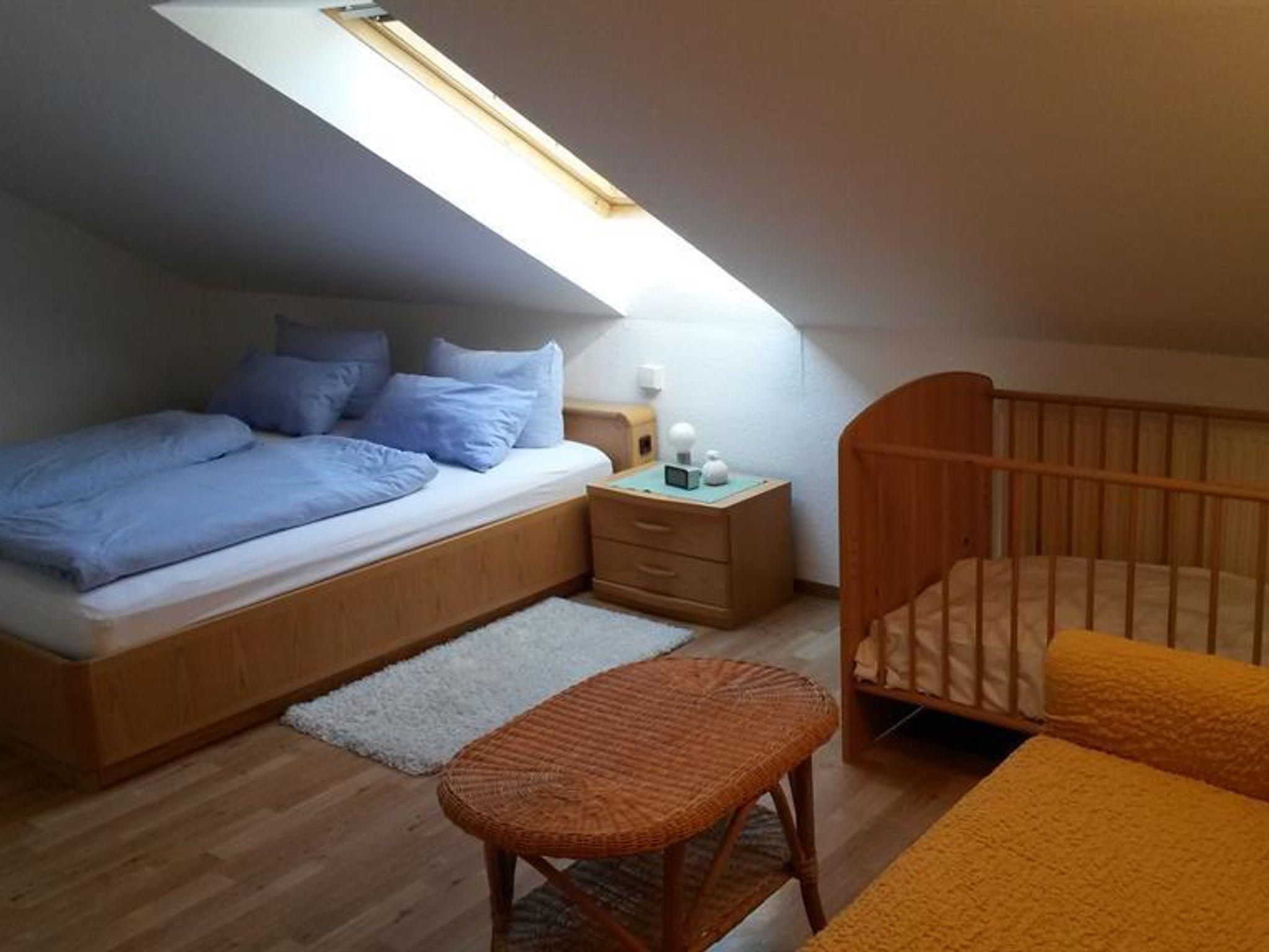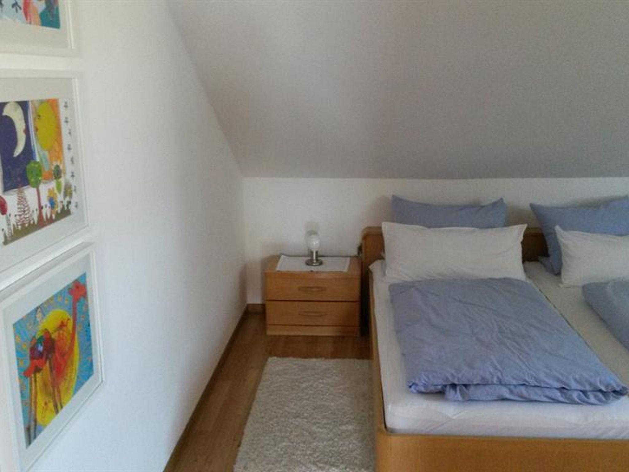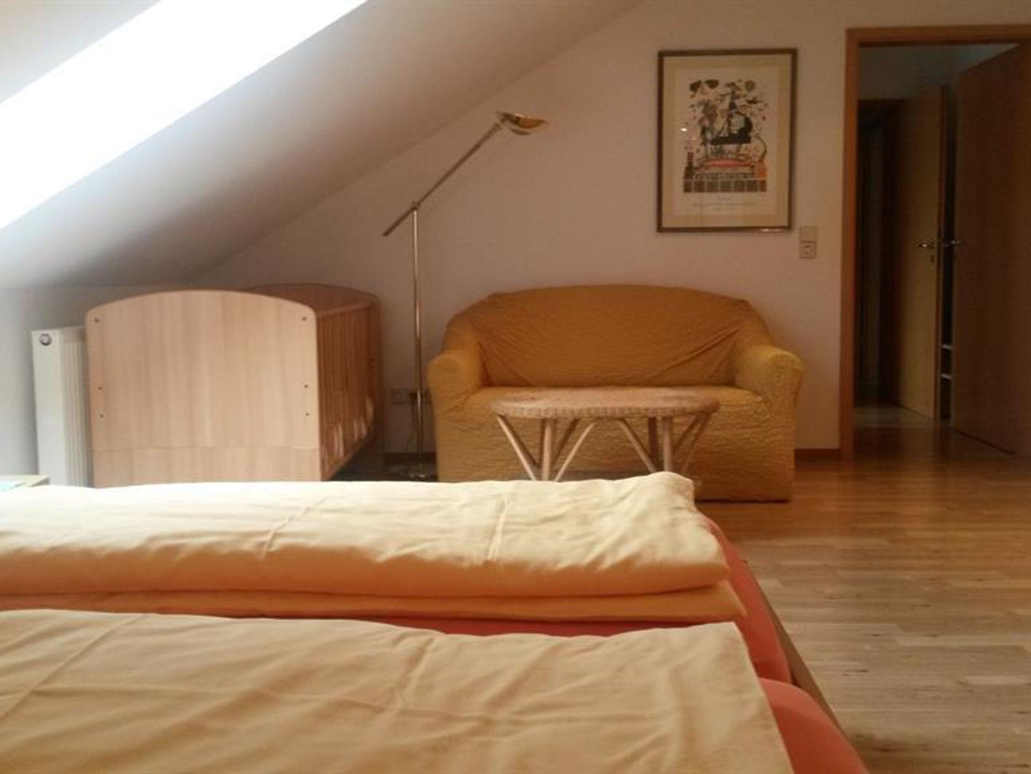 Die große Wohnung im 2. OG hat zwei separate Schlafzimmer mit eigenem Zugang. Das Bad liegt mittig und wird gemeinsam benutzt. Hinzu kommt ein großer Wohnraum mit voll ausgestatteter Küche, großem Essteisch und einer großen Couch mit Schlaffunktion. In einem der Schlafzimmer befindet sich eine zweite Schlafcouch. Kinderbetten können in beiden Schlafzimmern gestellt werden und können beigestellt werden. Zudem sind ein Wickeltisch und zwei Hochstühle vorhanden. Diese große Wohnung wird wegen der getrennten Schlafzimmer gerne von Familien oder gemeinsam reisenden Paaren genutzt. Der großzügige Wohnraum bietet bis zu acht Personen Platz, so dass man diesen auch zusammen mit z. B. einem Appartement als gemeinsamen Aufenthaltsraum nutzen kann. Die Küche im Wohnraum ist komplett (inkl. Spülmaschine) ausgestattet, eine Verpflegung auch von mehreren Personen ist ganz unproblematisch. Der Wohnraum ist mit Teppich ausgelegt, die Schlafzimmer haben einen wischbaren Boden. Genießen Sie Ihr Frühstück in der Morgensonne auf dem Balkon, von dem man einen schönen Blick auf den Garten (aber auch auf die Kinder auf dem Spielplatz) hat.