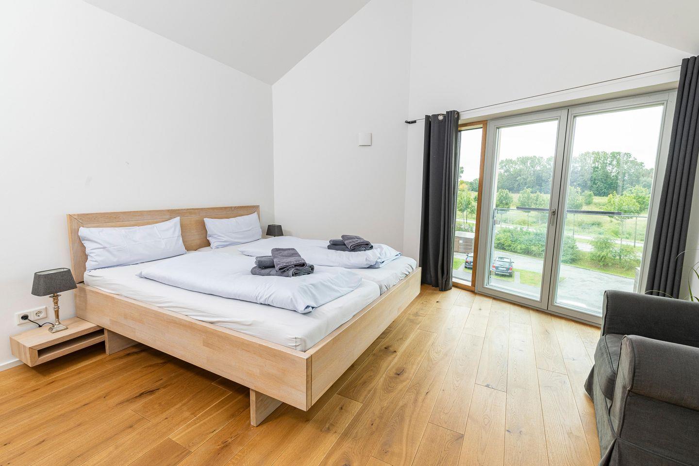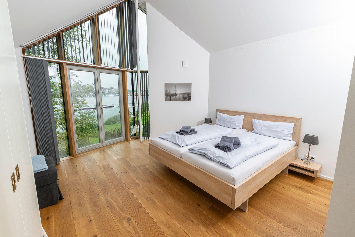 Auf ca. 102 m² finden bis zu 4 Personen bequem Platz. Die Wohnung verfügt über zwei Schlafzimmer, Fußbodenheizung, eine voll ausgestattete Küche, zwei moderne Duschbäder (en suite), ein zusätzliches WC, einen Balkon mit Blick auf die Schlei, und ein geräumiges Wohnzimmer. Hier erwarten Sie Annehmlichkeiten wie Spülmaschine, Trockner und Waschmaschine für Ihren Komfort.