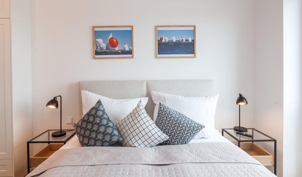 Die Wohnung bietet Schlafmöglichkeiten für drei Personen (eine vierte Person ist auf Anfrage möglich). Die Schlafzimmer sind mit Doppelbetten der Größe 2x 80x200 cm und 140x200 cm ausgestattet. Darüber hinaus befinden sich Kleiderschränke in den Schlafräumen und einer verfügt zusätzlich über ein Fernsehgerät.