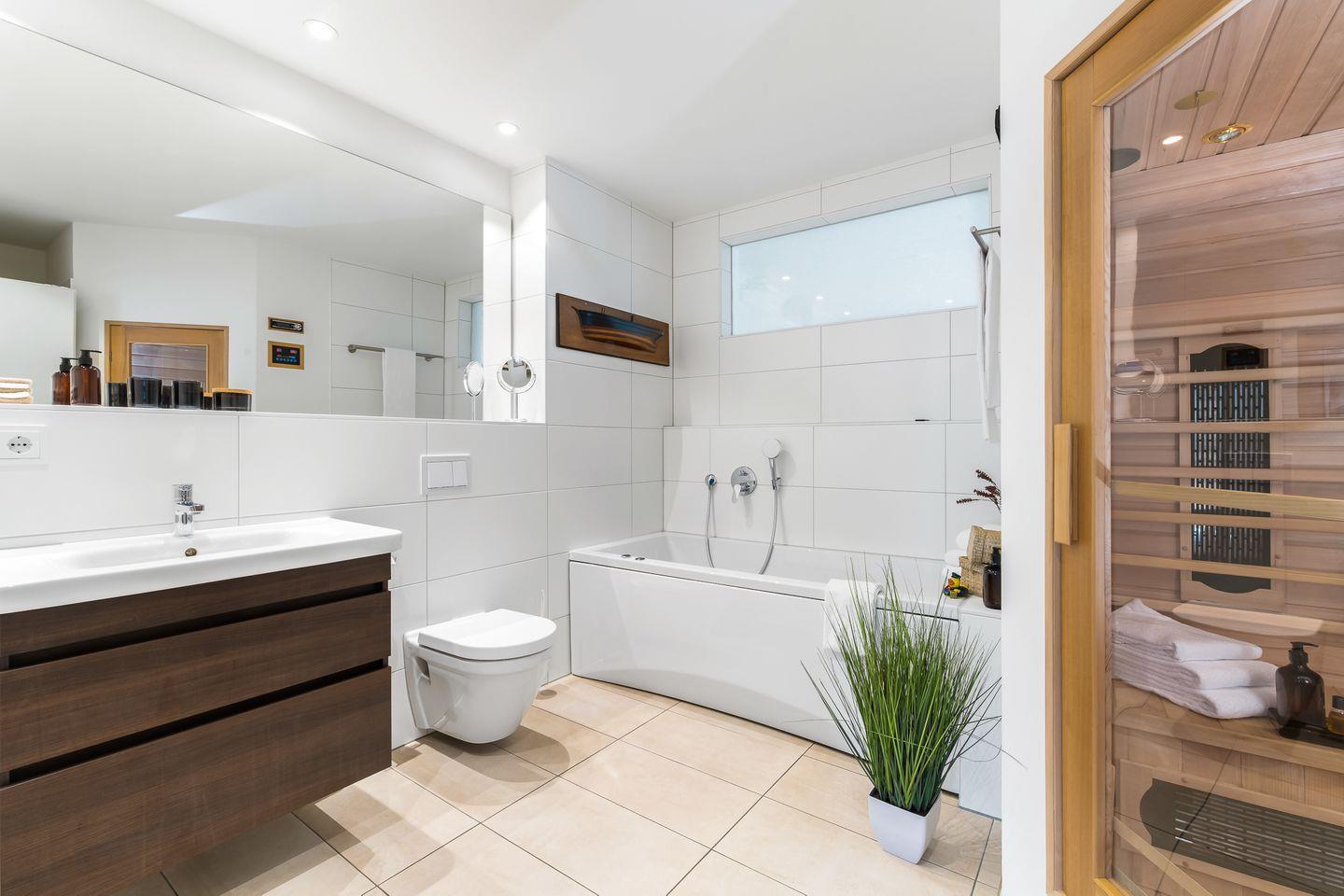 Nach einem langen Strandspaziergang locken die kleinen Oasen der Entspannung: Die Infrarot-Wärmekabine mit Soundsystem oder die sprudelnde Whirlwanne schenken wohltuende Momente. Dazu sorgt die Fußbodenheizung das ganze Jahr hindurch für wohlige Wärme.