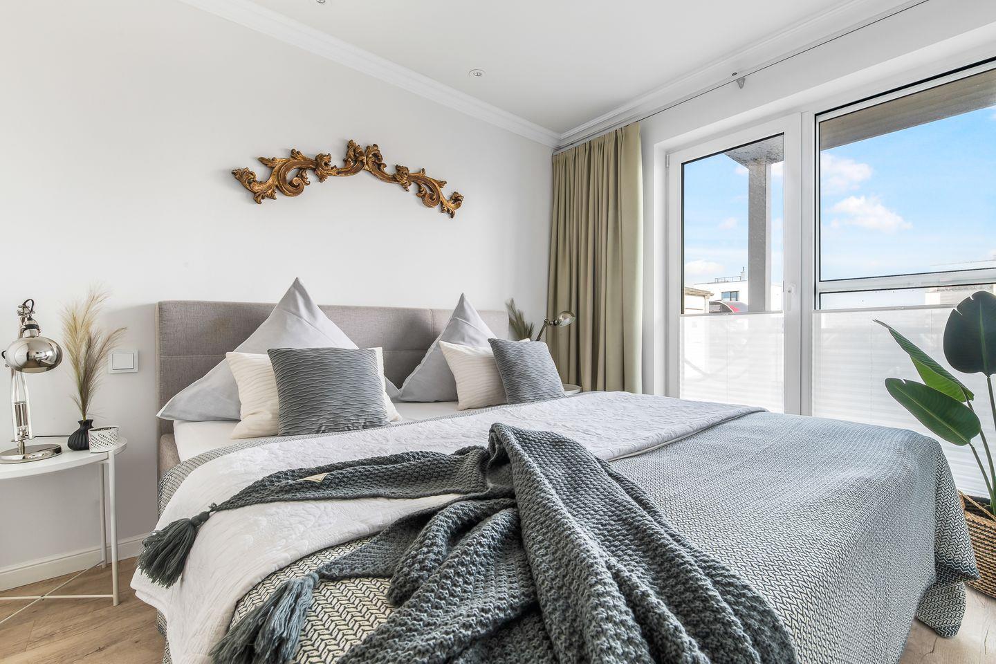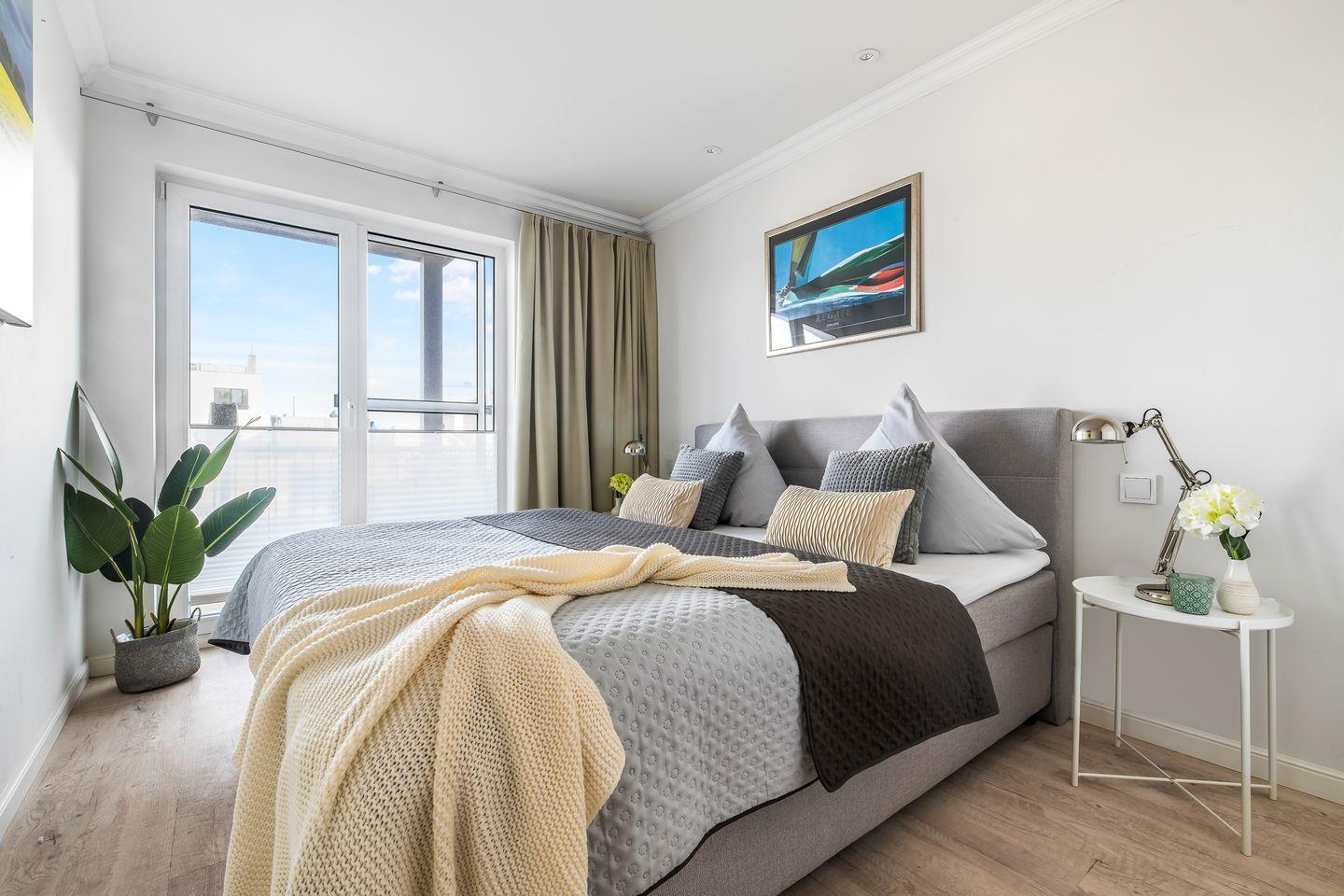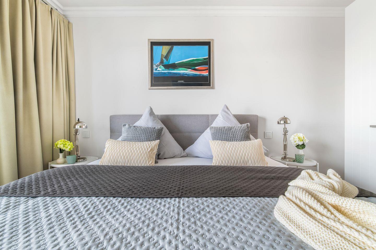 Die beiden Schlafzimmer sind jeweils mit komfortablen Boxspringbetten ausgestattet und bieten direkten Zugang zur zweiten Terrasse. Hier endet der Tag so friedlich, wie er begonnen hat: Mit dem sanften Rauschen des Hafens im Hintergrund.