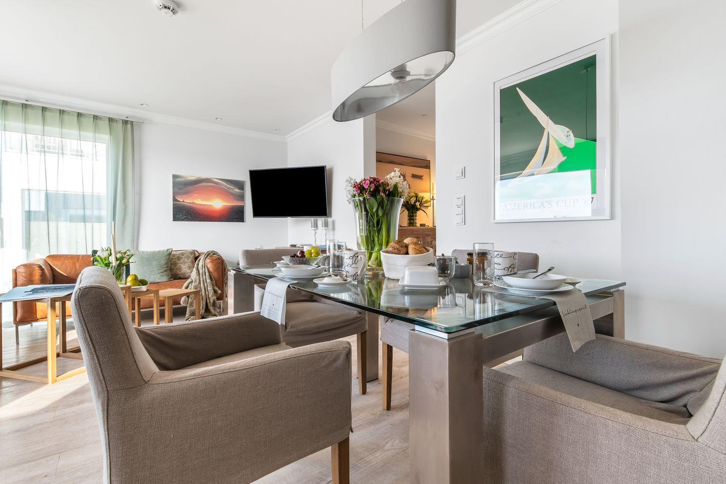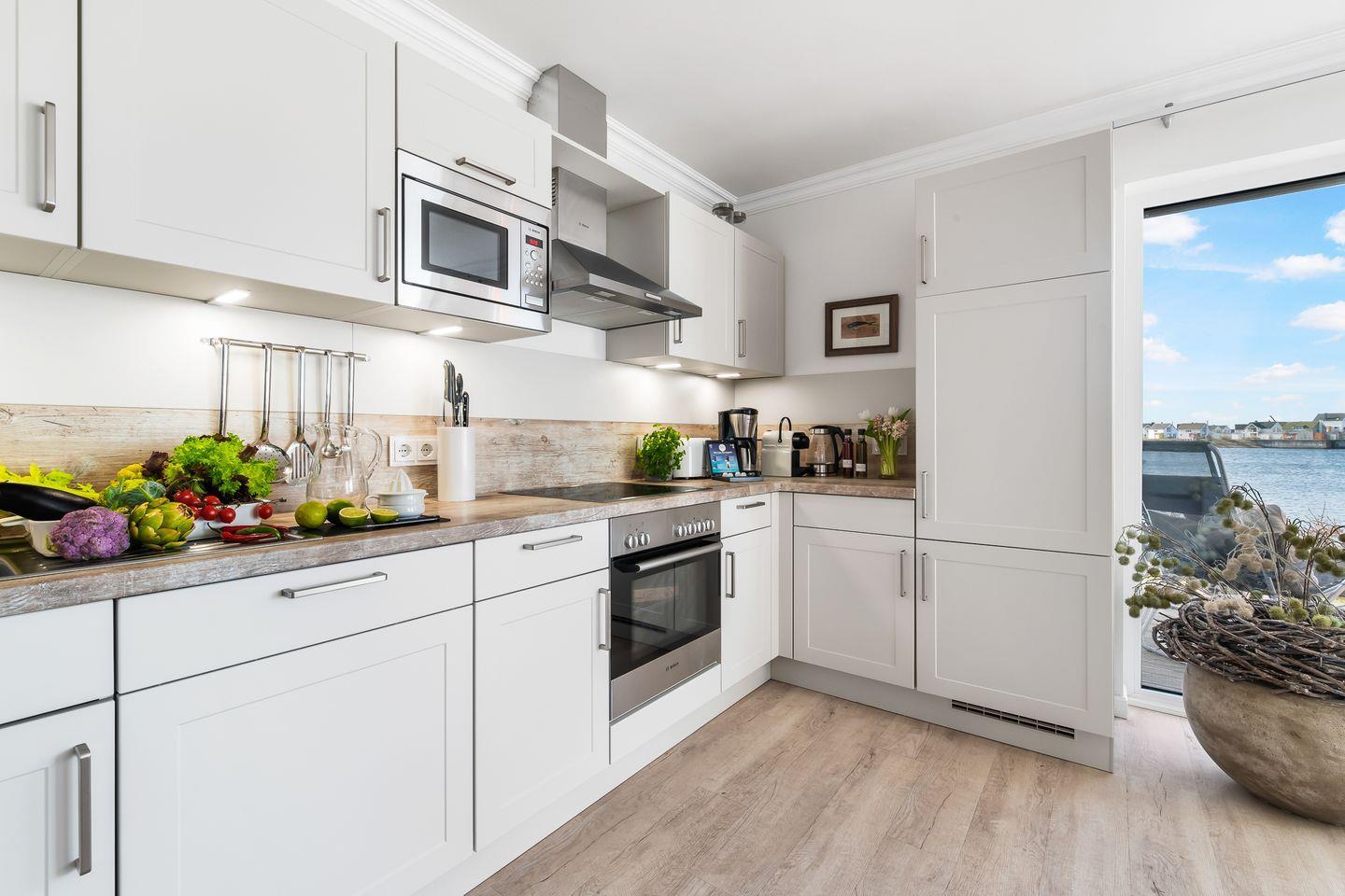 Die bodentiefen Fenster im Wohn-Essbereich holen das Panorama direkt ins Herz der Wohnung. Morgens wärmt die erste Sonne die Südterrasse, während sanfte Wellen am Kai schaukeln. Abends spiegelt sich das Licht der untergehenden Sonne im Wasser – dazu ein Glas Wein und das sanfte Hafenkino vor der Tür.
