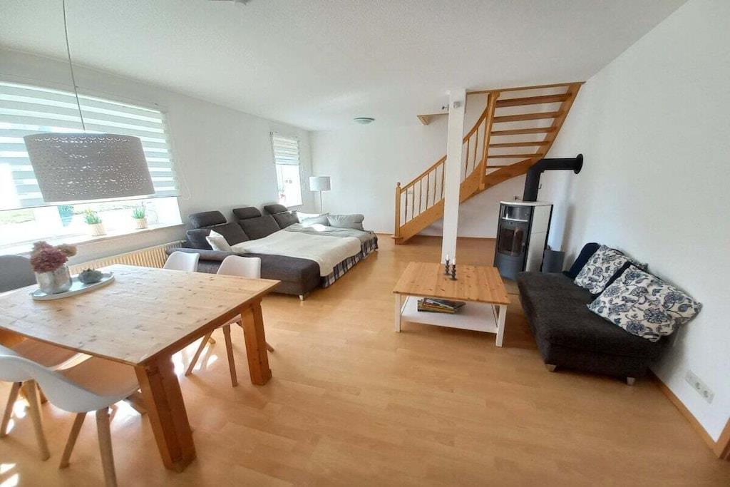 Stueetage: (entre(, , varme), Køkken(, tekøkken, kakkelovn, kogeplade, elkedel, brødrister, komfur, kaffemaskine, ovn, grill, mikrobølgeovn, opvaskemaskine , køleskab, fryser, varme), stue / spisestue(Fjernsyn, Fjernsyn, spisebord, kakkelovn, varme), guest toilet(, toilet, håndvask, varme), pulterkammer(, vaskemaskine, strygebræt, strygejern, tørreskab)) Loft: (soveværelse(, , enkeltsovesofa, dobbeltseng), soveværelse(, enkeltseng, enkeltseng), badeværelse(, toilet, badekar, bruser, håndvask)) , , , garage, Internetadgang, Førstehjælp, vaskemaskine, varme, parkering, strygebræt, strygejern, tørreskab