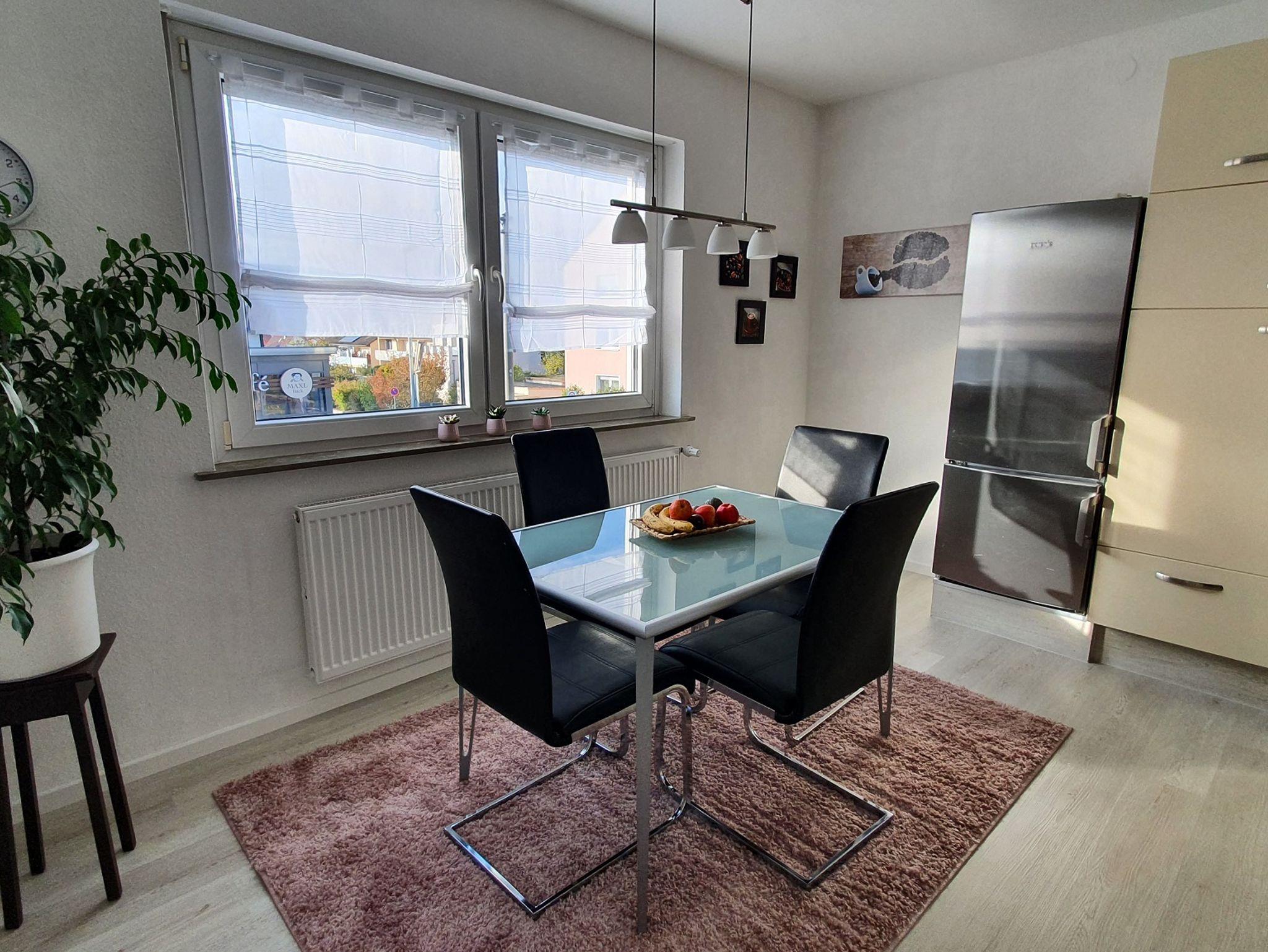 Unsere Ferienwohnung mit großem Balkon befindet sich im 1. Stock eines Zweifamilienhauses in der Siedlung von Karlstadt. Sie wohnen in einer gemütlich eingerichteten, mit allem Komfort ausgestatten 85 qm großen Wohnung für 2-4 Personen. Sie verfügt über 1 Schlafzimmer mit einem 190cm x200cm großem Doppelbett und einem großen Kleiderschrank. Ein weiteres Schlafzimmer mit einem 140cm breiten Bett, Schrank, Tisch und zwei Hocker. Das Wohnzimmer ist mit einer Schrankwand, SAT-TV und kostenlosem W-LAN eingerichtet. Die komplett ausgestattete Küche mit Geschirrspüler, Kühlgefrierkompination, Einbauherd mit Backofen, Mikrowelle, Wasserkocher, Toaster, lässt keine Wünsche offen. Das Badezimmer mit ebenerdiger Dusche und WC, großem Spiegelschrank Föhn und Handtücher stehen zu Verfügung. Ein separates kleines Zimmer mit Klappsofa und Kinderreisebett stehen wenn benötigt bereit. Die Wohnung verfügt über einen 30qm großen Balkon mit überdachter Sitzecke. Einen Parkplatz am Haus können sie kostenfrei nutzen.