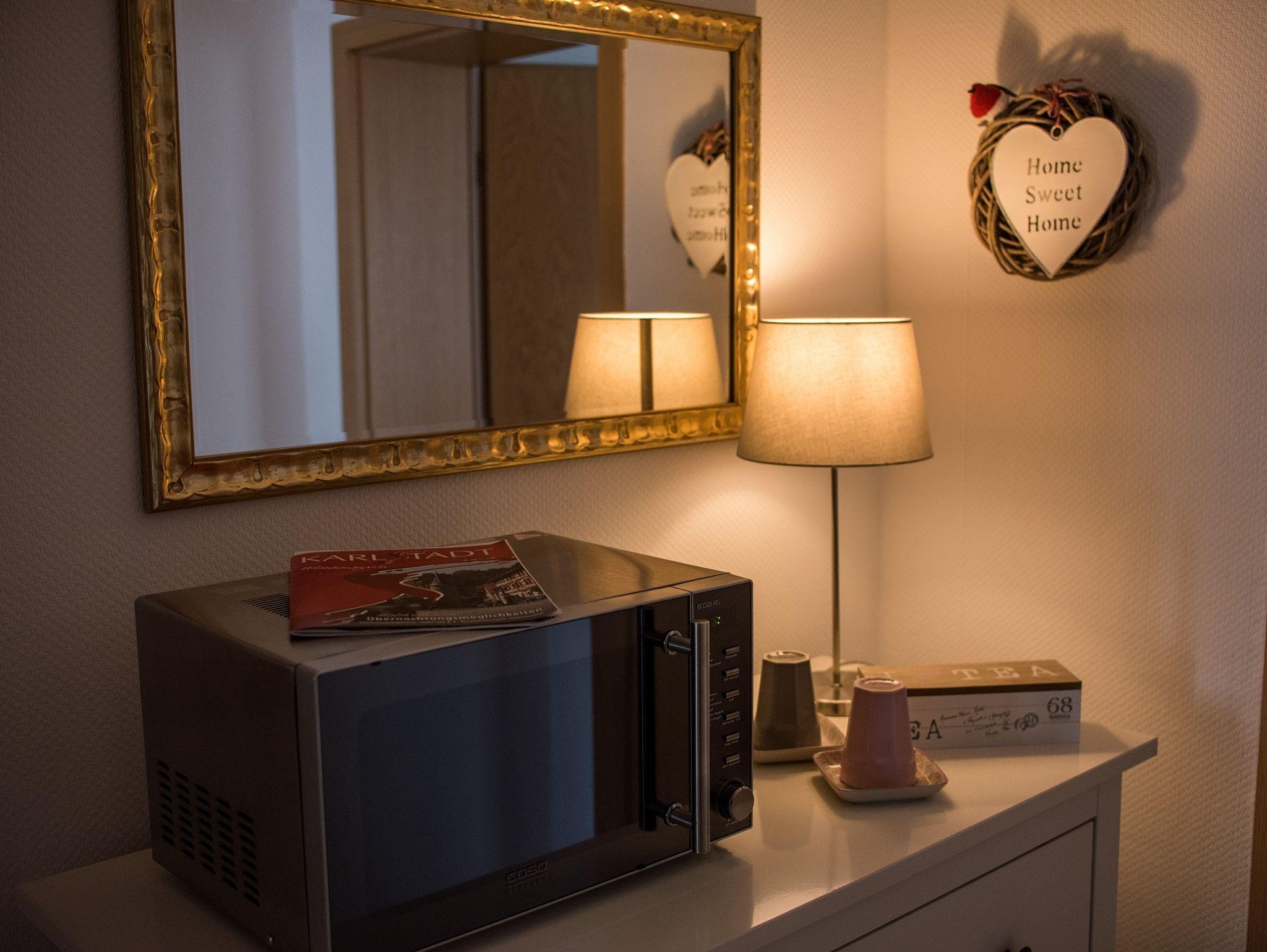 Die Zimmer sind mit TV, W-LAN, Geschirr und Handtüchern für 2 Personen ausgestattet. Weiterhin finden Sie einen Kühlschrank, Mikrowellen-/Backkombination und Wasserkocher vor.
