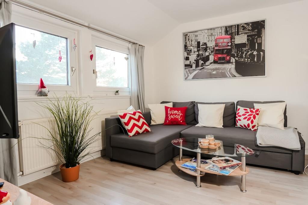 På anden sal venter en 50 kvm stor lejlighed med 3 værelser, 2 soveværelser, en stue og et fuldt udstyret køkken med spiseplads. Et lyst badeværelse med vindue og badekar med bruser fuldender ferieoplevelsen.