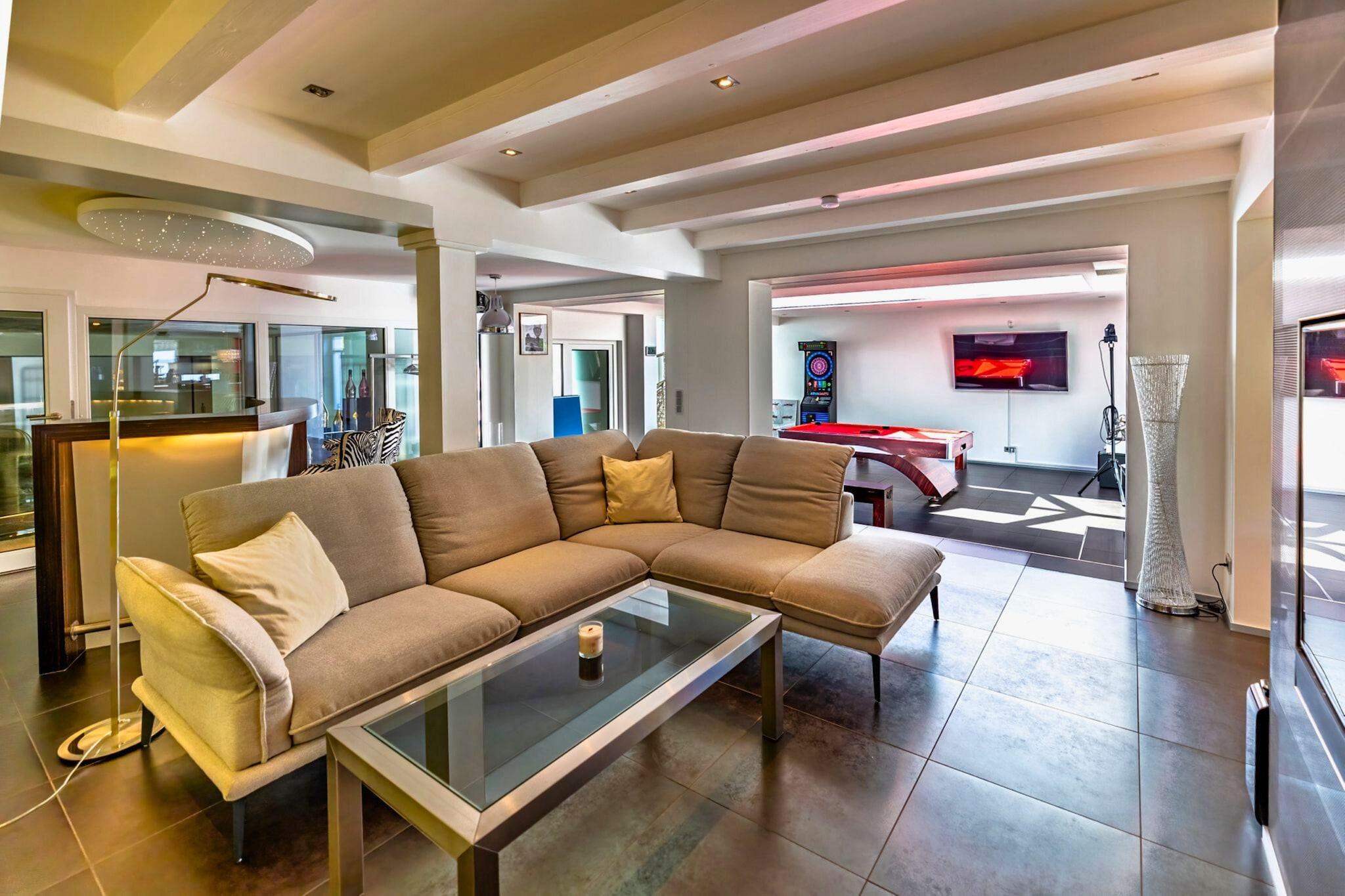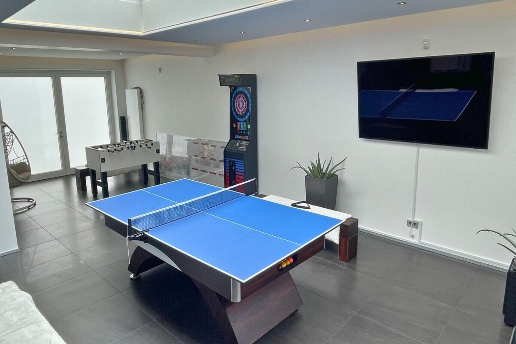 Kælderetage: (Stue(Fjernsyn, sofahjørne, bar), Køkken(spisebord(10 personer), elkedel, brødrister, komfur, kaffemaskine, espressomaskine, ovn, mikrobølgeovn, opvaskemaskine , køle-fryseskab), Soveværelse med badeværelse(dobbeltseng, bruser, håndvask, toilet, føntørrer), Soveværelse med badeværelse(dobbeltseng, bruser, håndvask, toilet, føntørrer), opholdsrum(legeredskaber, bordtennisbord, dart, biljard), barneseng, barnestol, føntørrer) tørretumbler, vaskemaskine, terrasse, cykelopbevaring, havemøbler, grill, parkering, Ladestation til el-biler