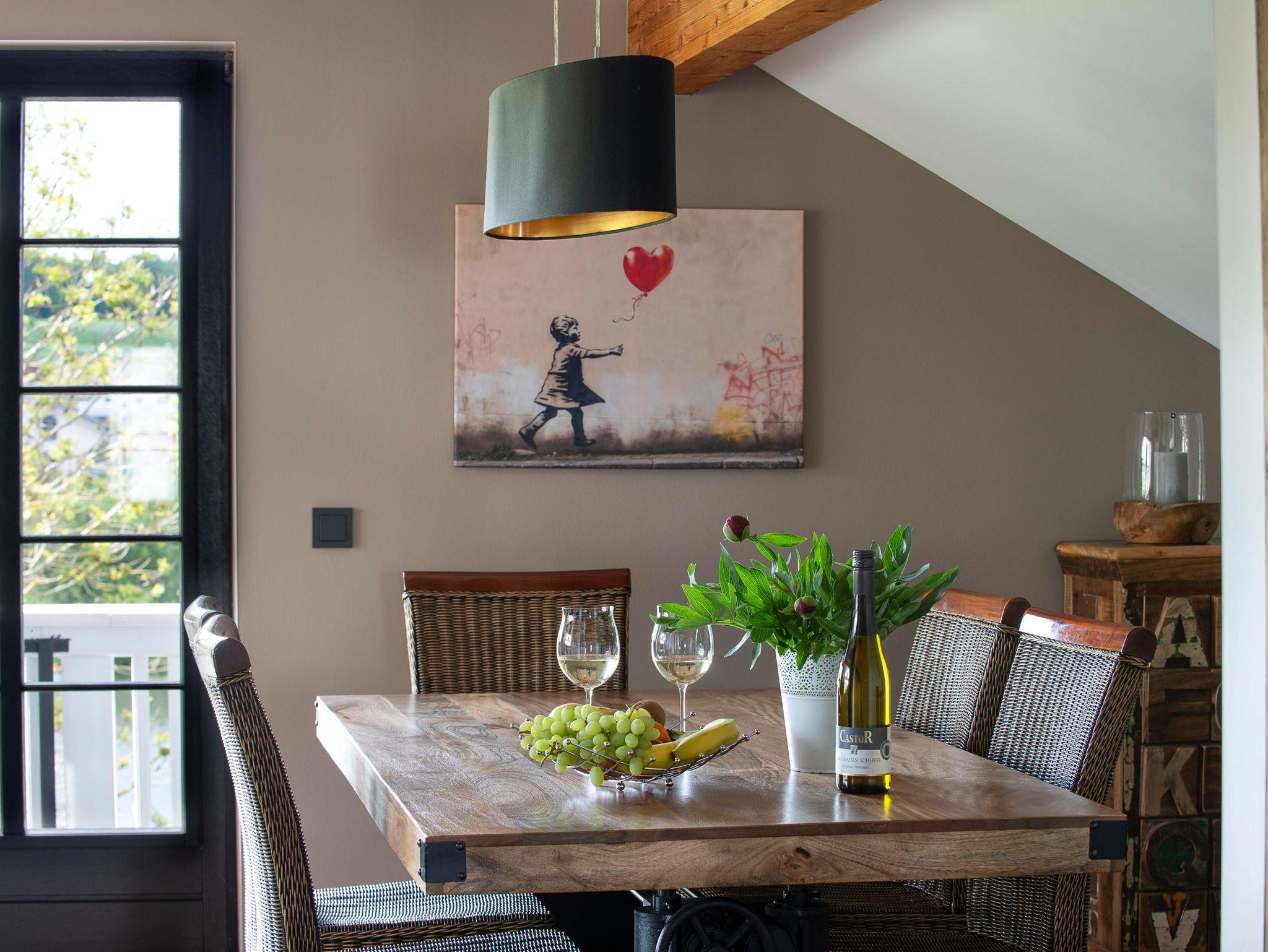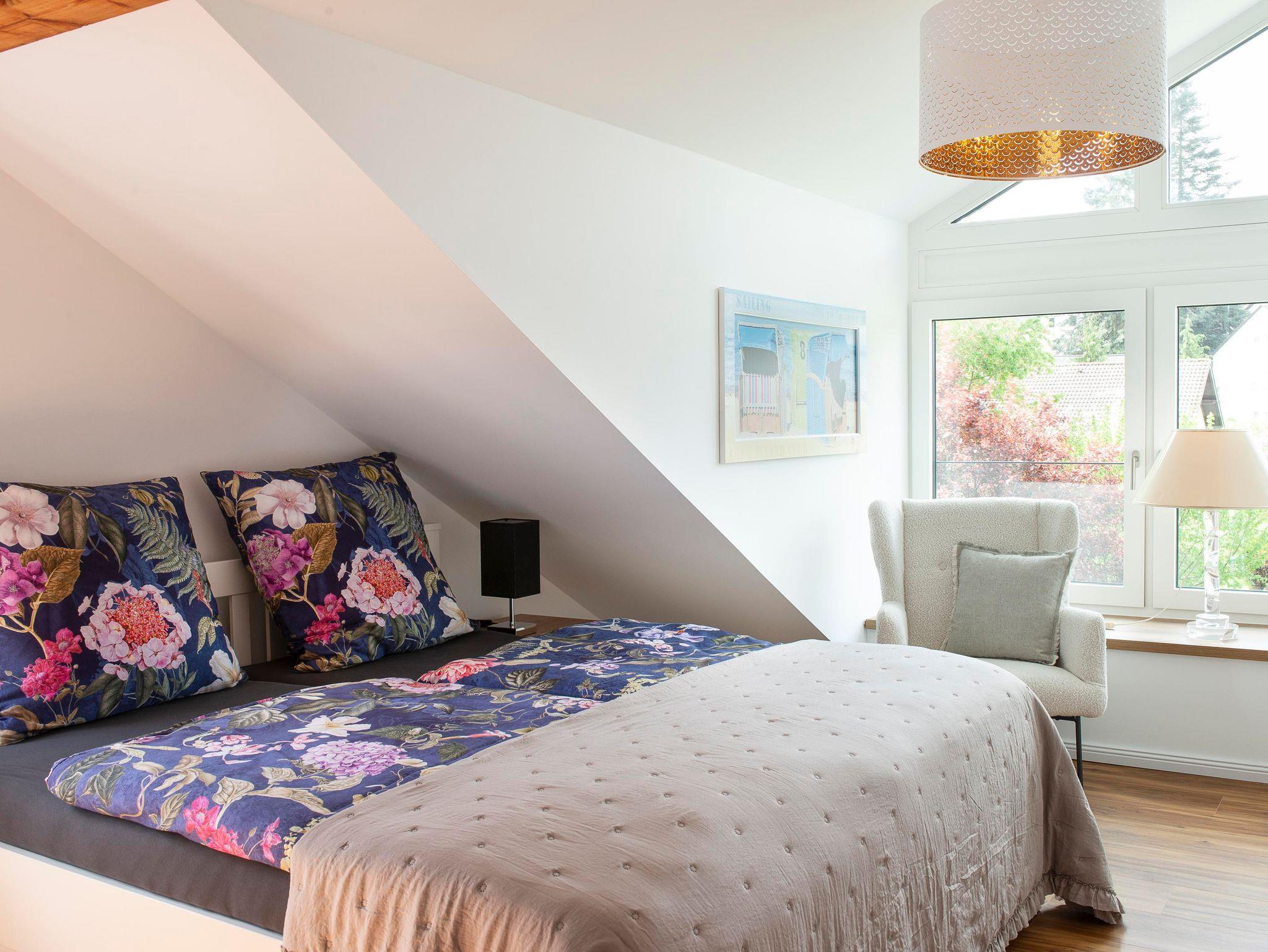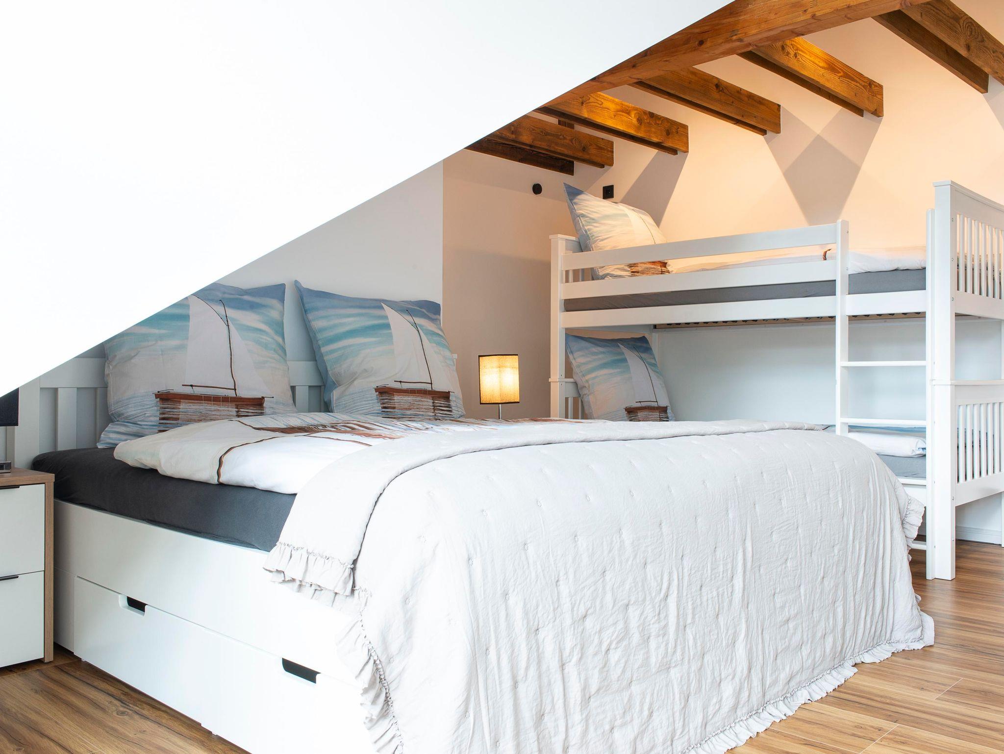 Die Ferienwohnung befindets ich im Dachgeschoss des Wohnhauses mit drei großen Gauben, 120 m² groß einschließlich Balkon zur Seeseite, usbau komplett neu in 2023/2024. Die Einrichtung ist ebenso neu, geschmackvoll und außergewöhnlich. Ein gemütliches Wohnzimmer mit integriertem Esszimmer, Ofen, Smart TV und Spielecke lädt zum Entspannen ein. Zwei Schlafzimmer mit je Doppelbett (180x200) und Etagenbett (90x200) zur Gartenseite sorgen für eine erholsame Nachtruhe. Die voll ausgestattete Küche verfügt über eine Spülmaschine, Backofen/Magnetron und zwei Kaffeemaschinen (Filter und Coffee Kapseln), Bad/WC/Dusche, Waschmaschine und Trockner, Treppenhaus mit Garderobe und überdachter Balkon.