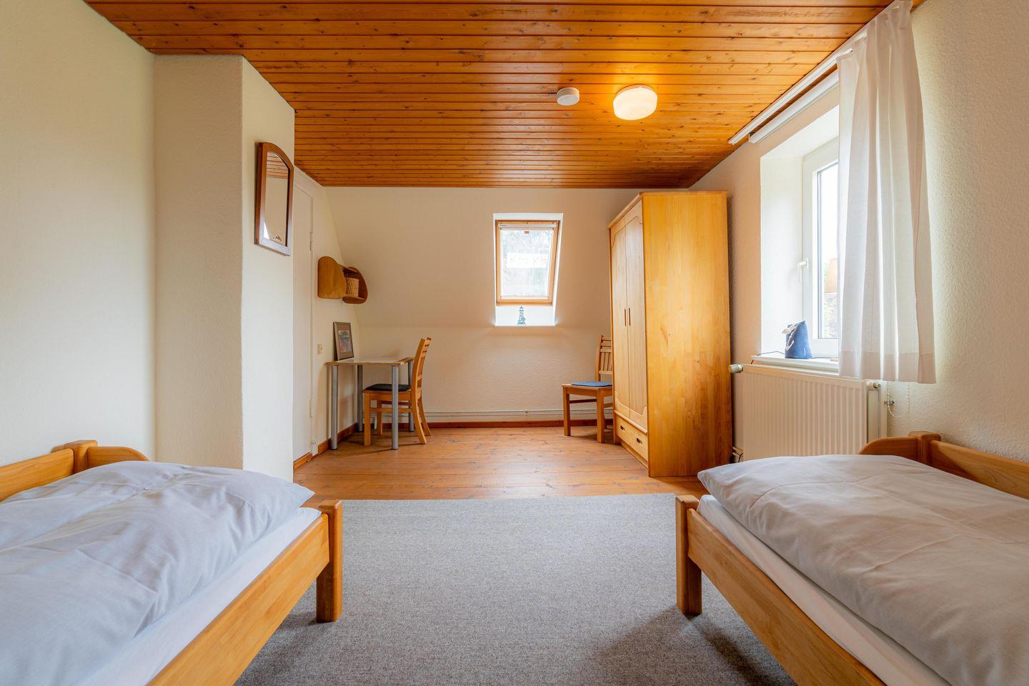 Schlafzimmer mit 2 Einzelbetten (80 x 200 cm), Kleiderschrank, kleiner Schreibtisch für HomeOffice.