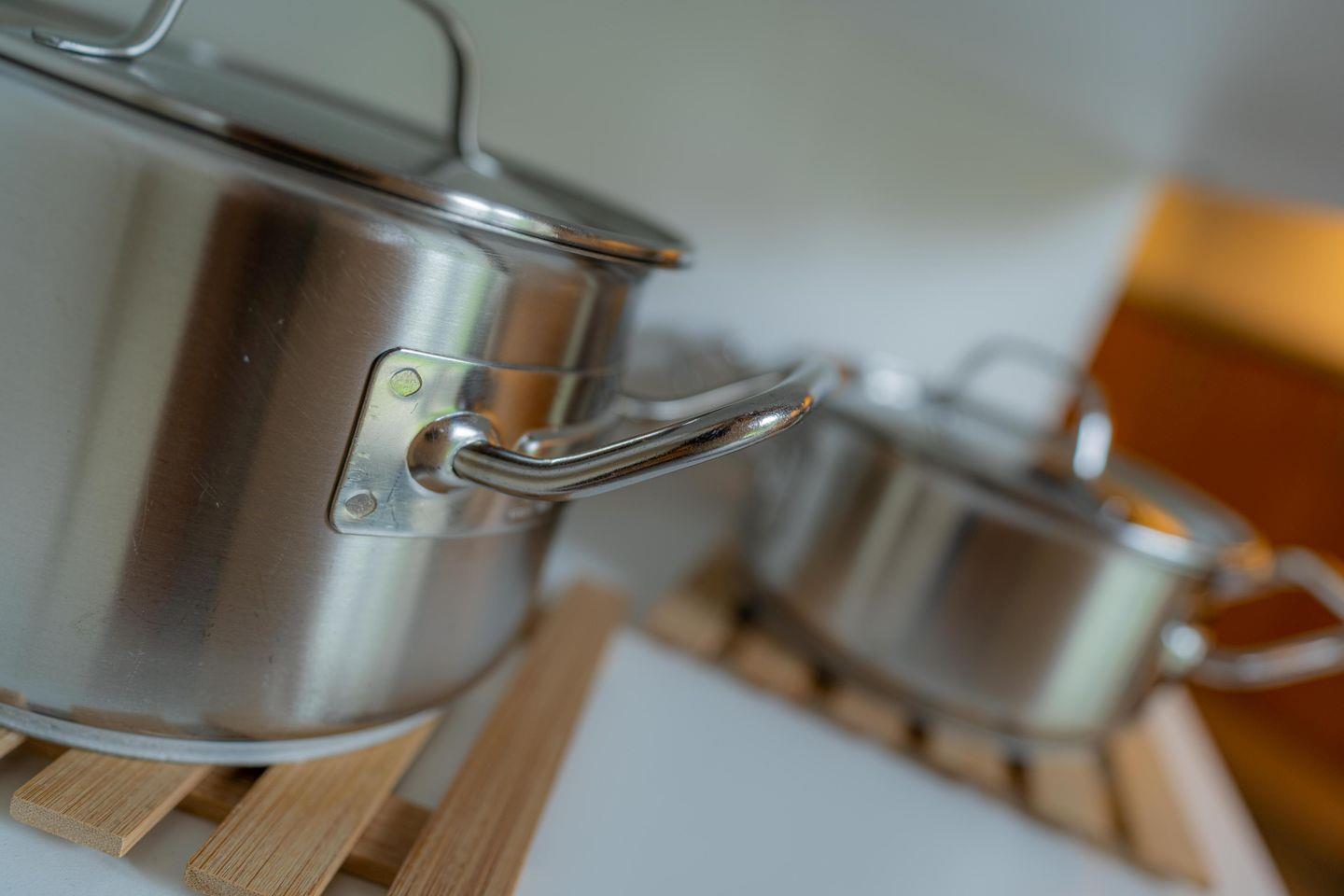 Küche mit Cerankochfeld, Dunstabzugshaube, Geschirrspülmaschine, Mikrowelle und großem Minibackofen.