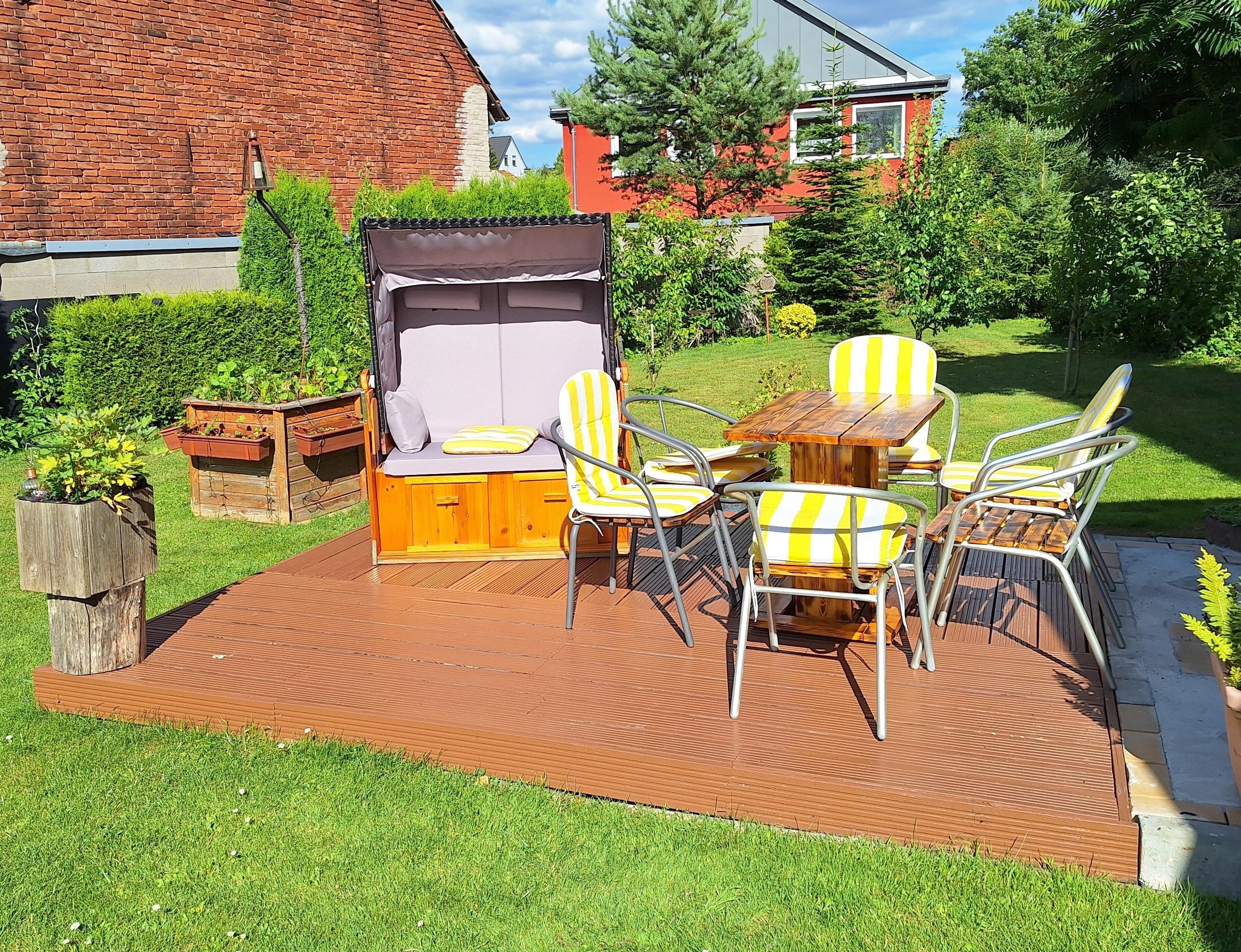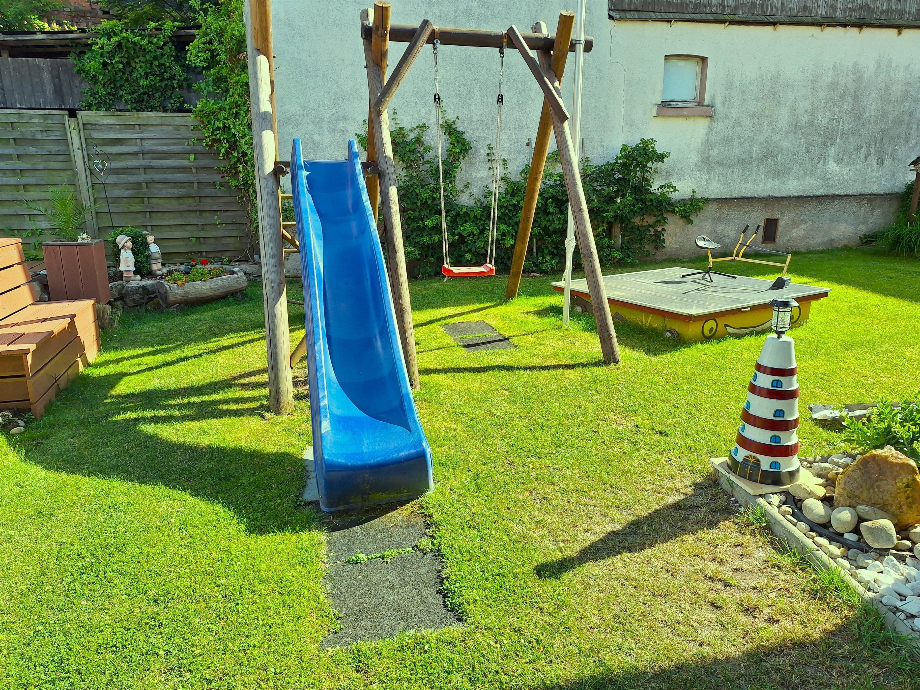 Für unsere kleinen Gäste ist ein Spielplatz mit Rutsche, Schaukel und Sandkasten mit Bagger angelegt. Ein Teich mit vielen Fischen und einem Steg grenzt an unserem Grillhaus. Gartenmöbel, Sonnenliegen, eine große Hängematte und verschiedene Wasserspielsachen bieten wir zur Nutzung an. Wir wohnen sehr ruhig, so dass Ihre Entspannung und Erholung gesichert ist.