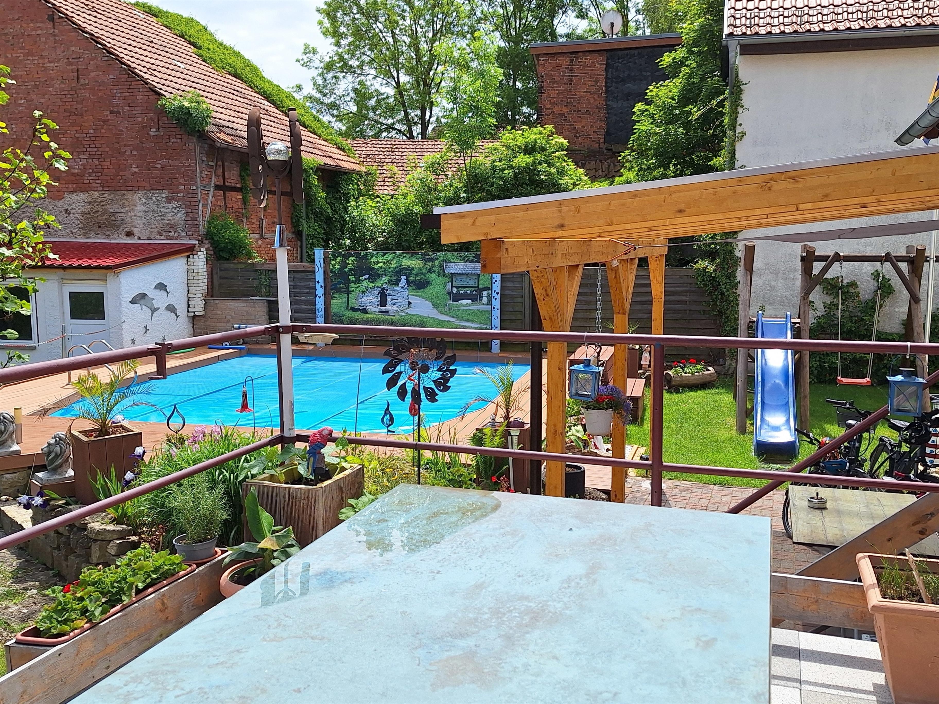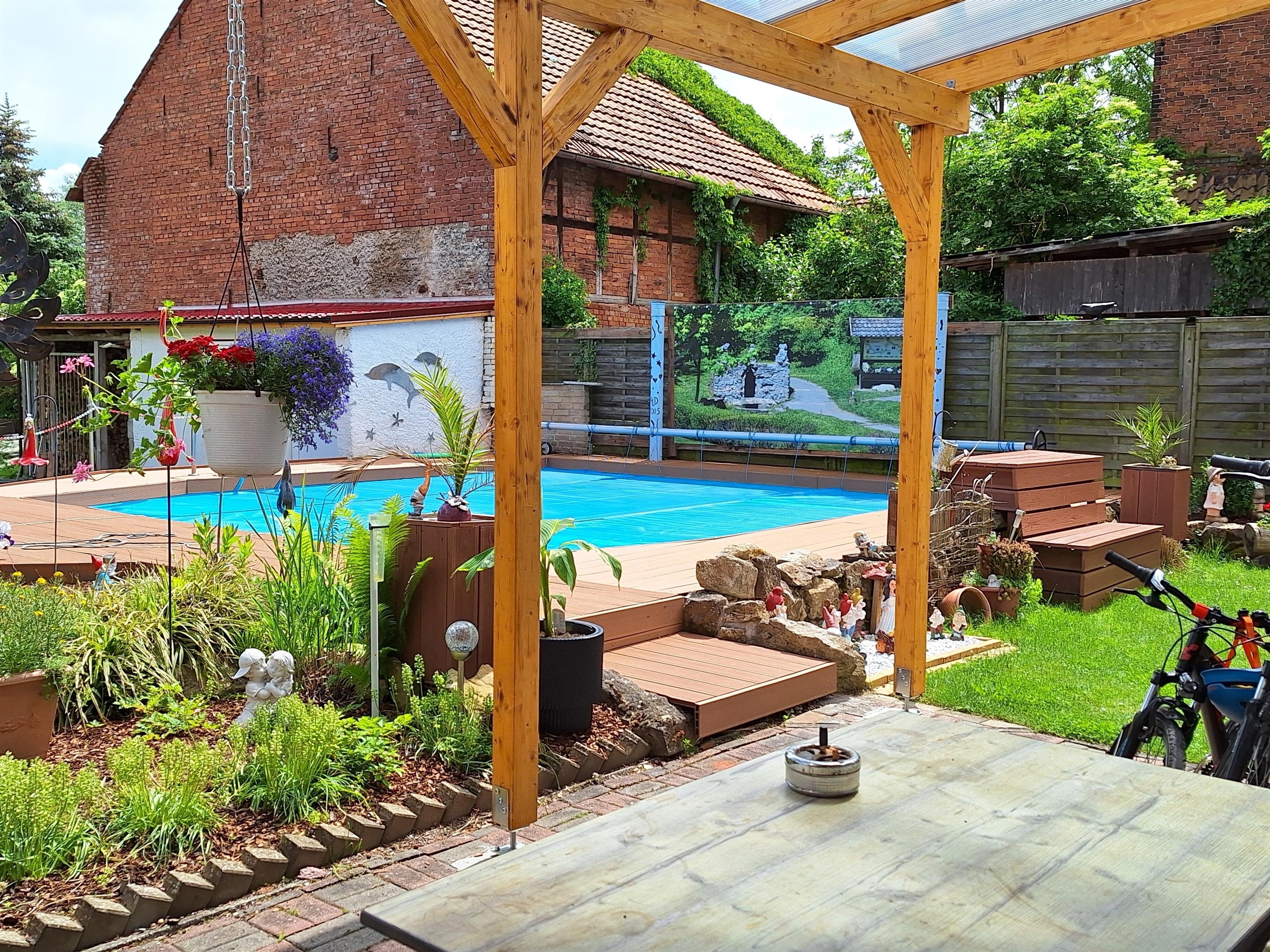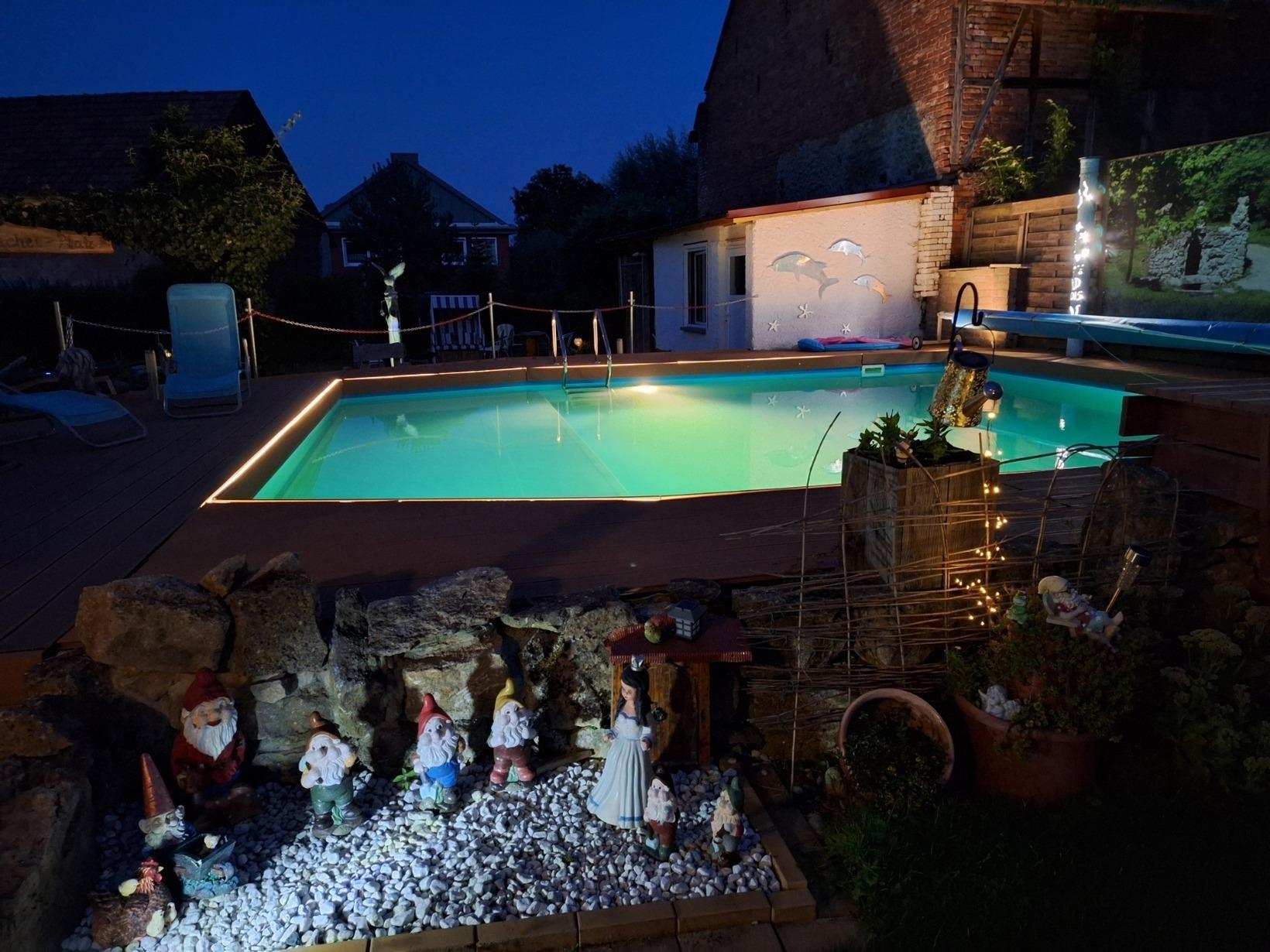 Im Garten finden unsere Gäste einen großen solarbeheizten Pool in 3 verschiedenen Tiefen. Ein Grillhaus mit Kamin ist Garant für wunderschöne Stunden zum Tagesausklang. Der Garten wird in der Nacht besonders romantisch beleuchtet.