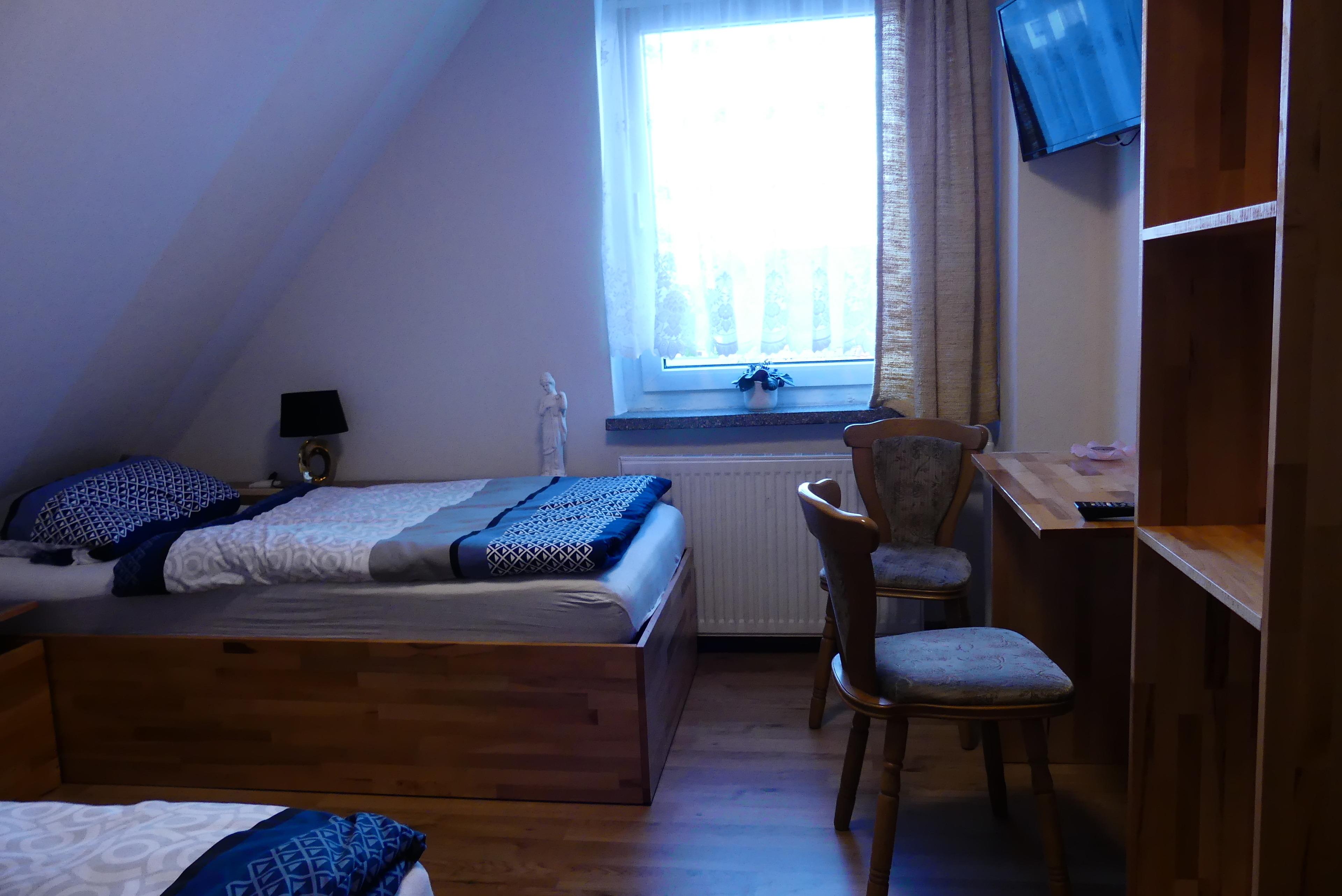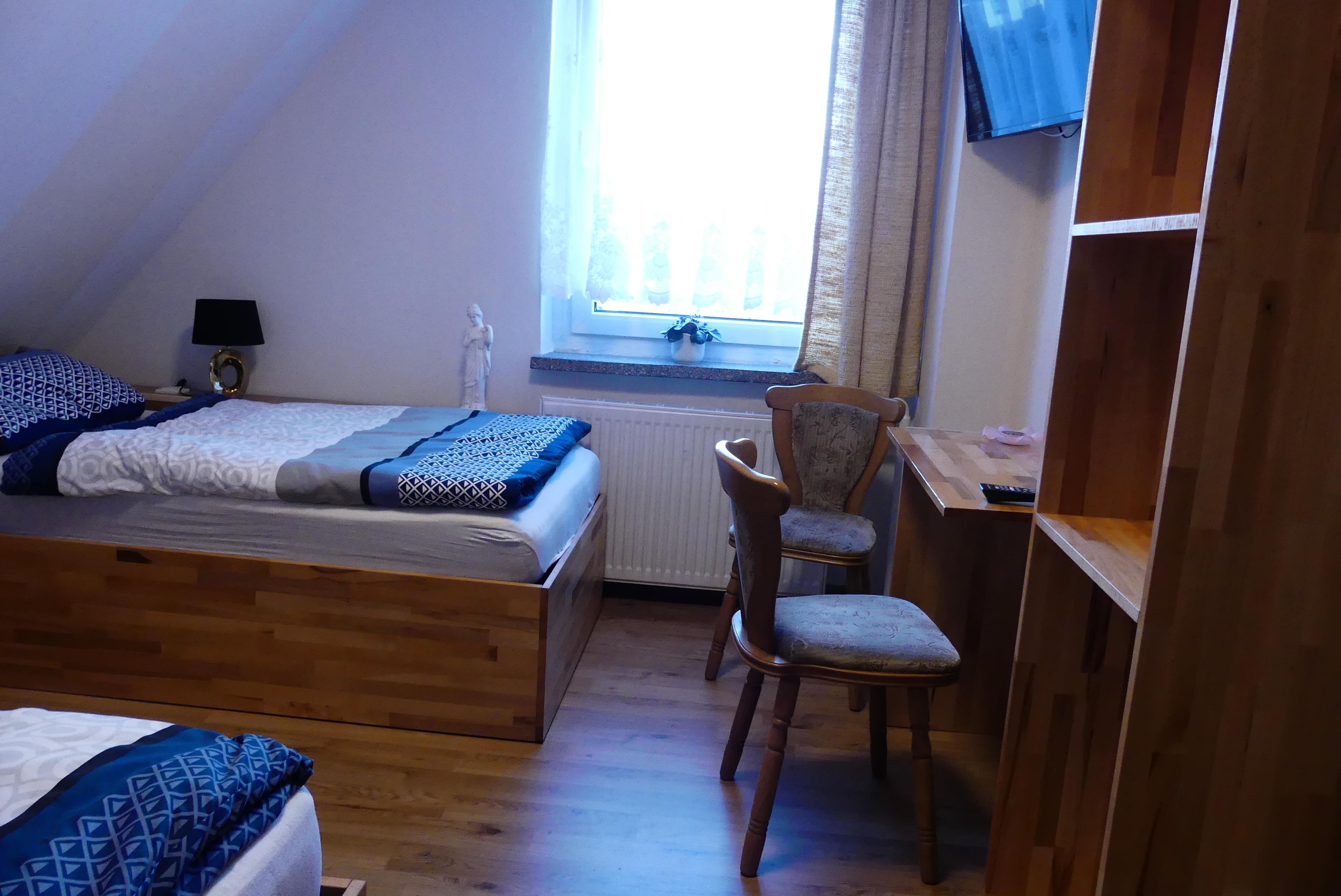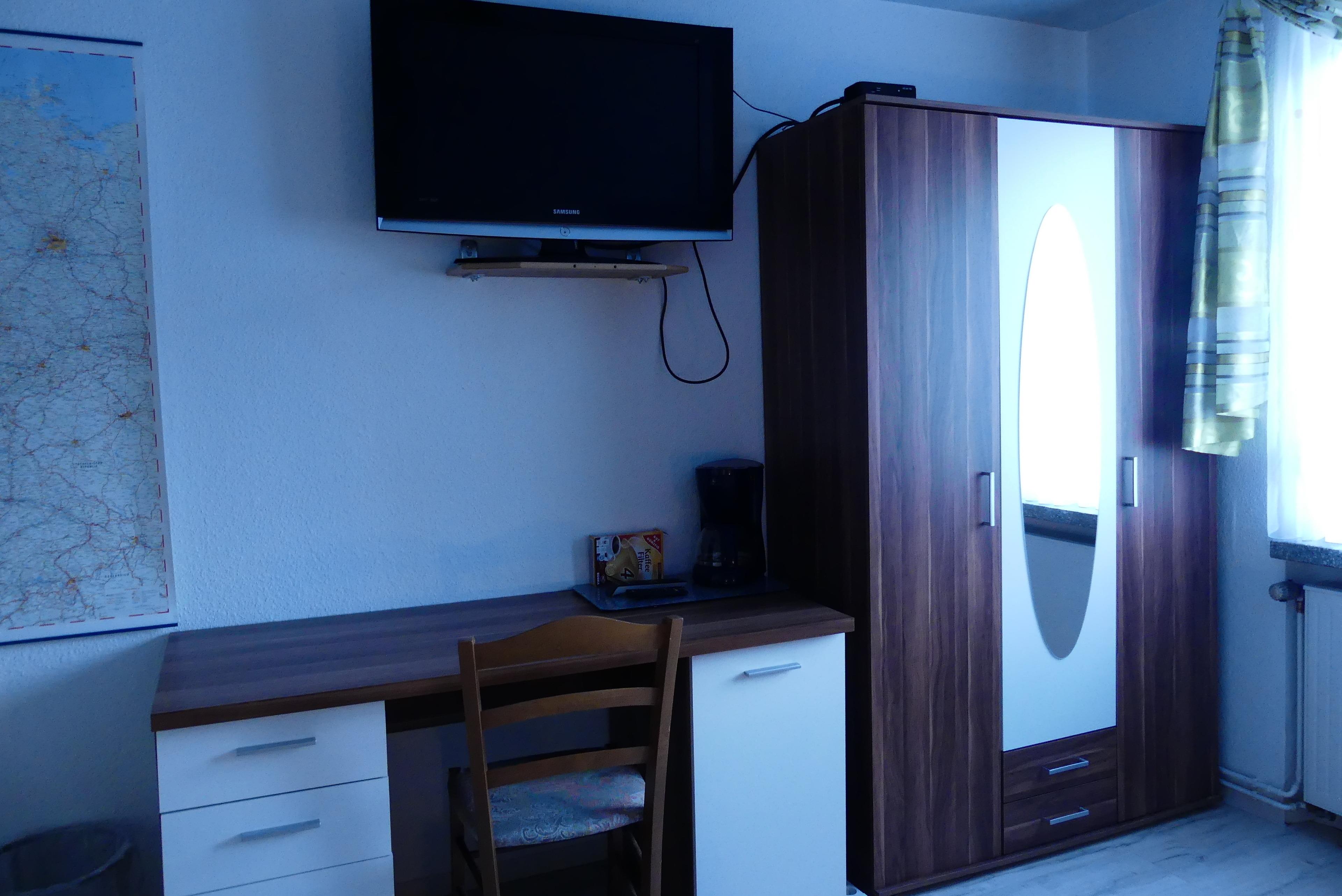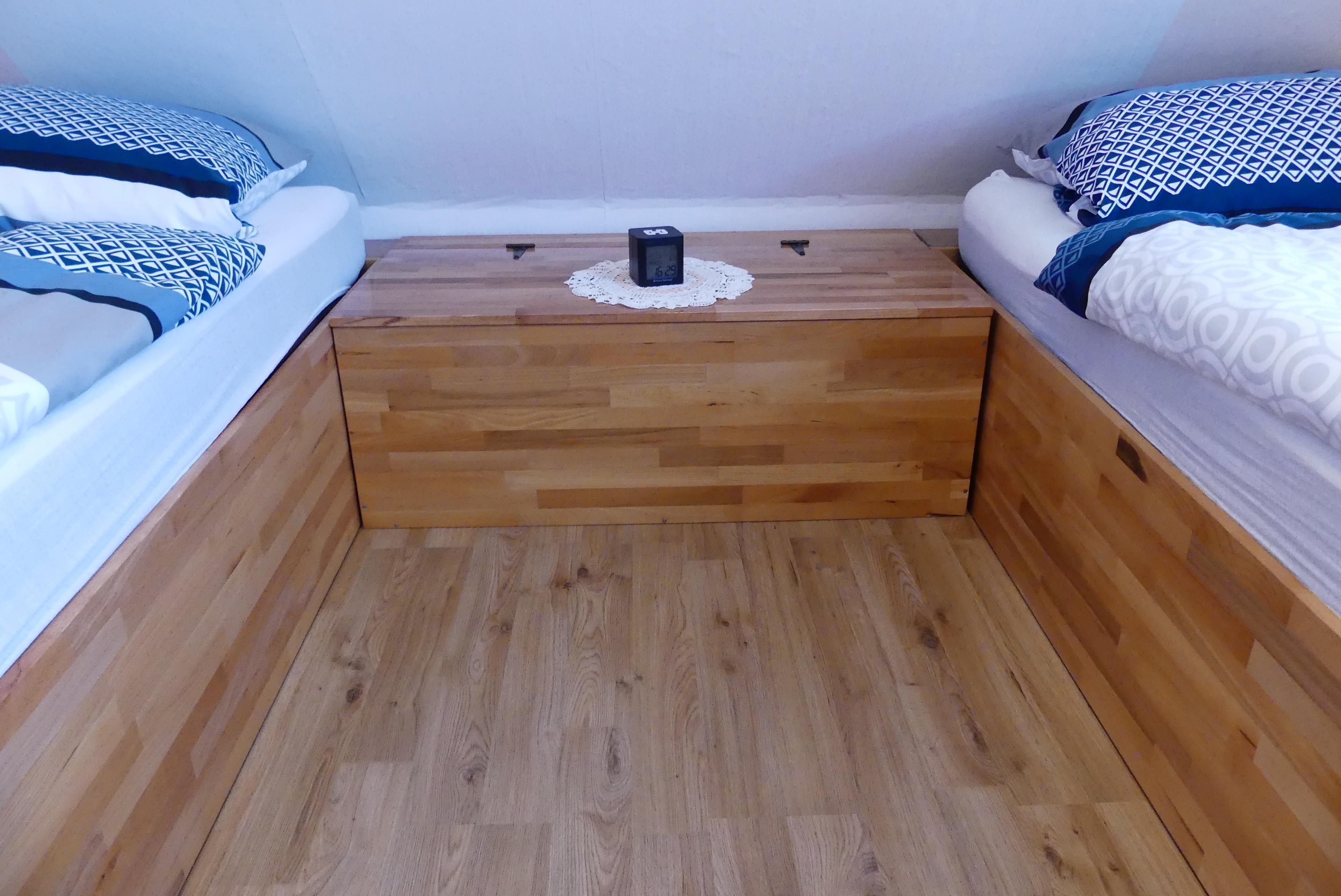 Wir haben ein Schlafzimmer mit 2 Einzelbetten, ein weiteres Schlafzimmer mit 2 Einzelbetten und im großen Wohnbereich (60 Quadratmeter) stehen 2 Einzelbetten und Eßecke und Cautschecke. In jedem Raum befinden sich ein Flachbildfernseher und ein Schreibtisch.