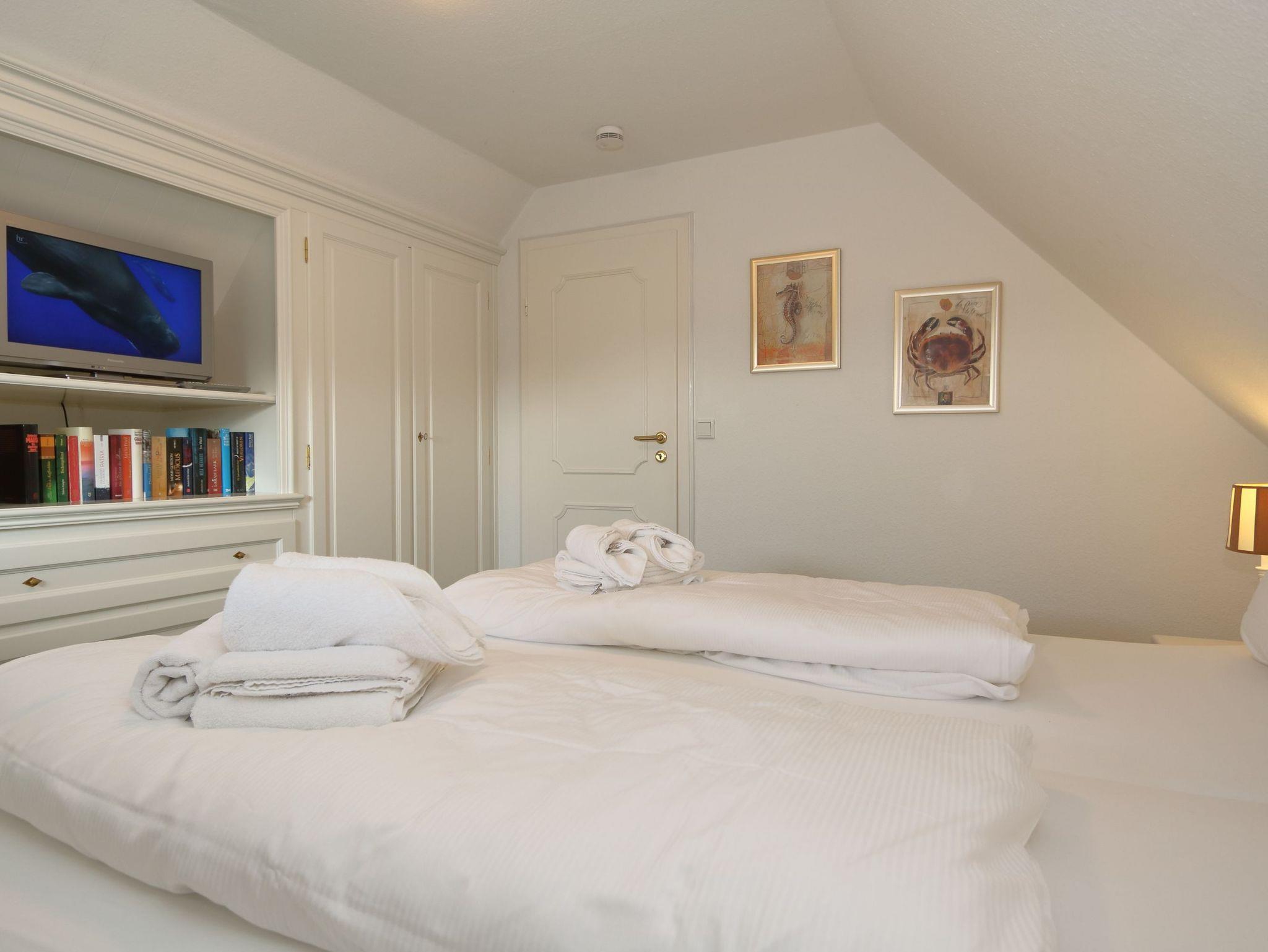 Das Appartement ist komplett renoviert und mit hochwertigen Tischleieinbauten ausgestattet. Im großzügigen Wohnzimmer stehen die Couchgarnitur und der Essplatz, WLAN ist vorhanden. Außerdem ist hier die Küchenzeile. Vom Essplatz hat man einen weiten Blick über Wiesen. Auch das Watt kann man vom Wohnzimer aus sehen. Zwei Schlafzimmer mit Doppelbetten sind vorhanden. In dem Duschbad mit Fenster steht auch die Waschmaschine. Zum Appartement gehört ein eigener Gartenanteil mit den entsprechenden Gartenmöbeln und Strandkorb.