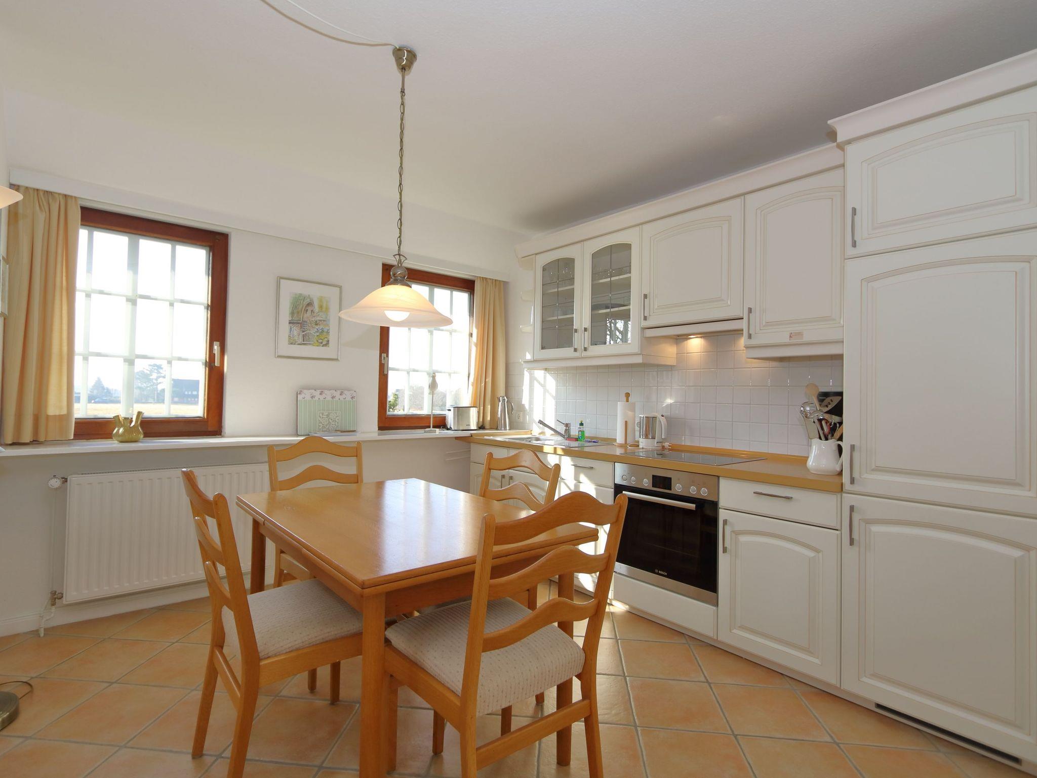 Das Appartement befindet sich in sehr ruhiger Lage in einem Reetdachhaus im Obergeschoss. Das Haus steht in unmittelbarer Nähe zum Watt. Vielfältige Einkaufsmöglichkeiten und Gastronomie befinden sich im Ort.