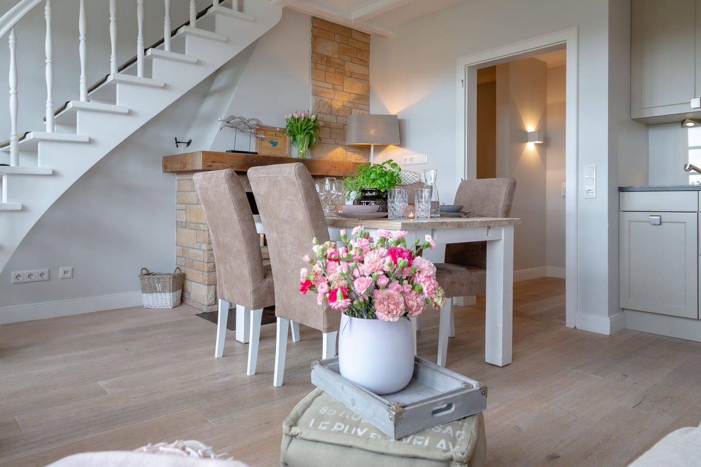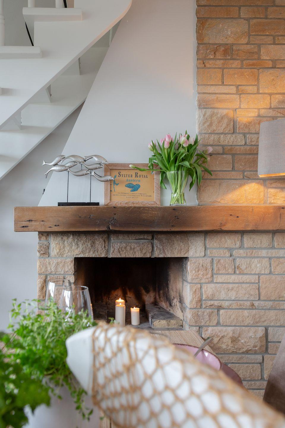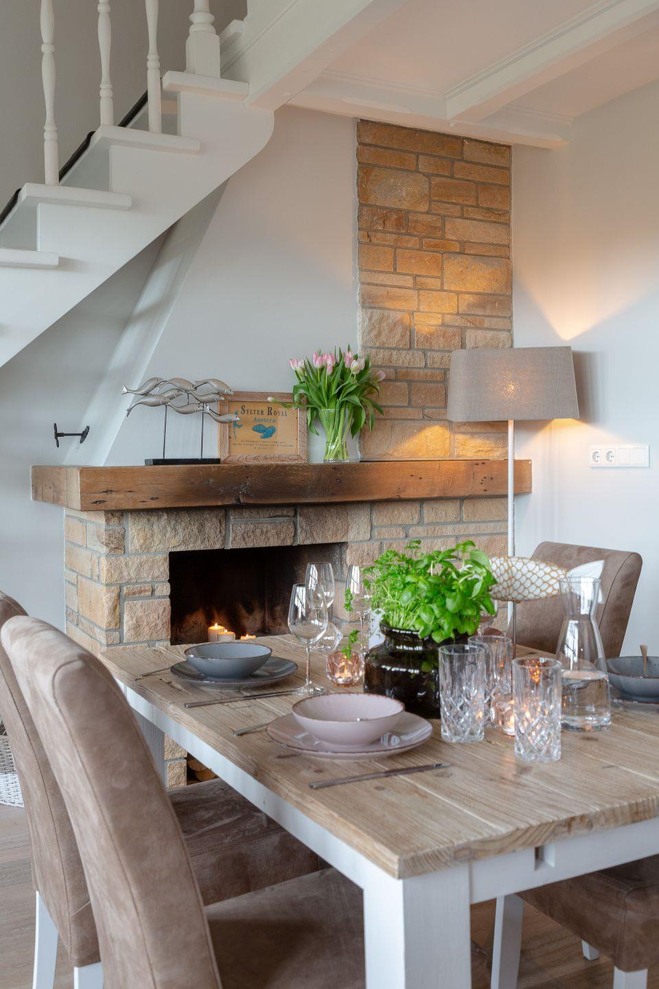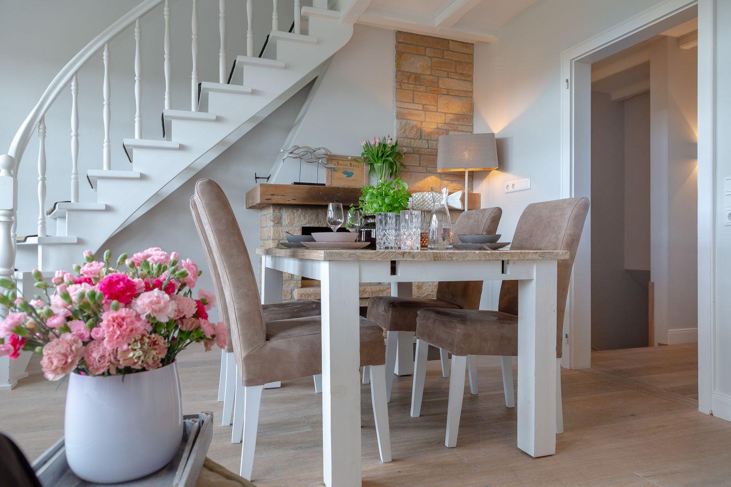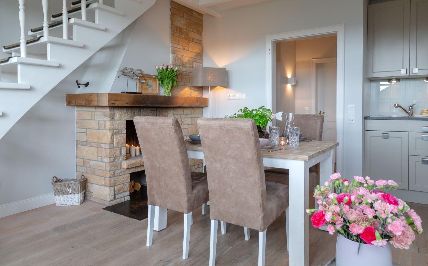Der offene Wohnbereich mit stilvollem Kamin lädt zu geselligen Stunden mit Familie oder Freunden ein. Die modern ausgestattete Küche mit Filterkaffeemaschine macht gemeinsames Kochen zum Vergnügen und den großzügigen Essplatz zum beliebten Treffpunkt.