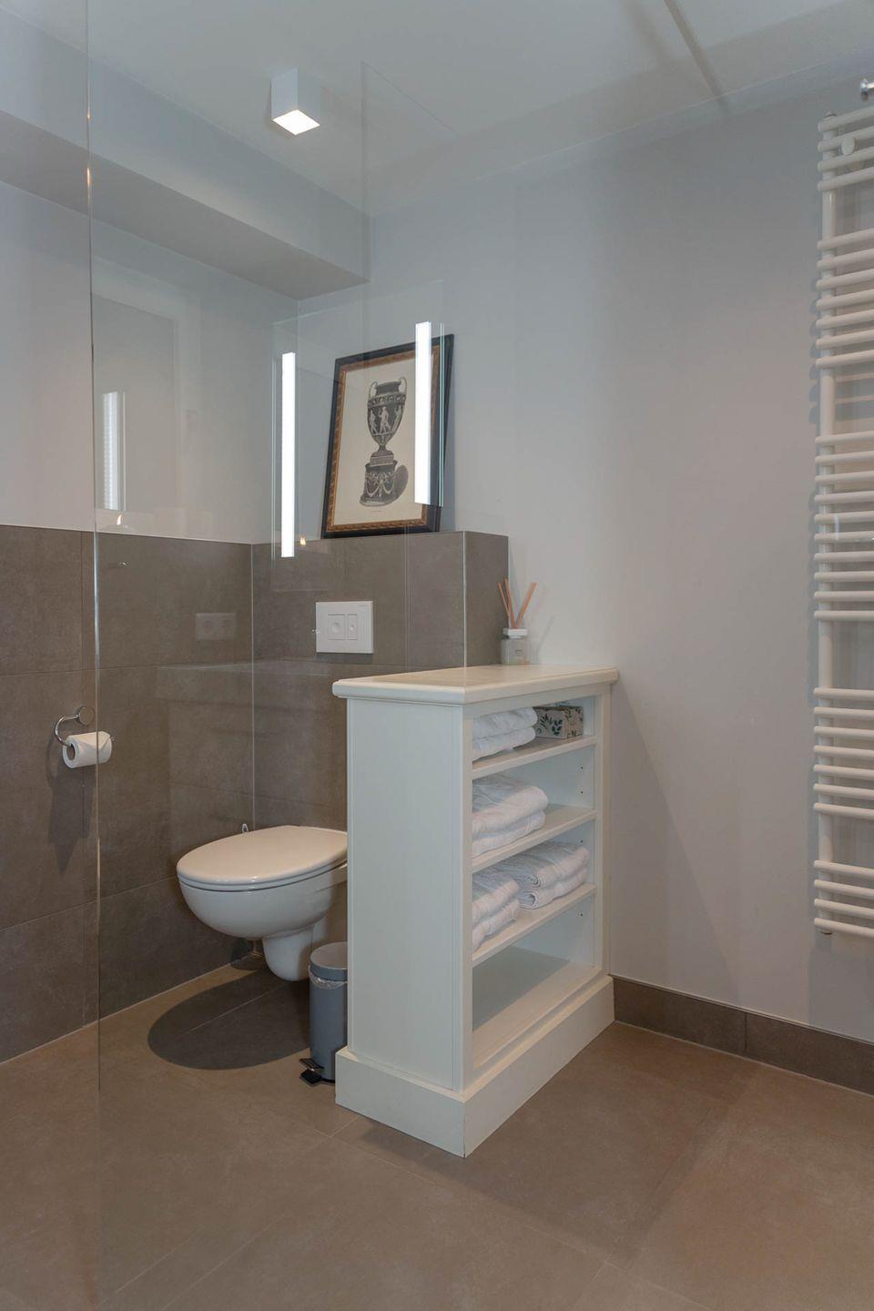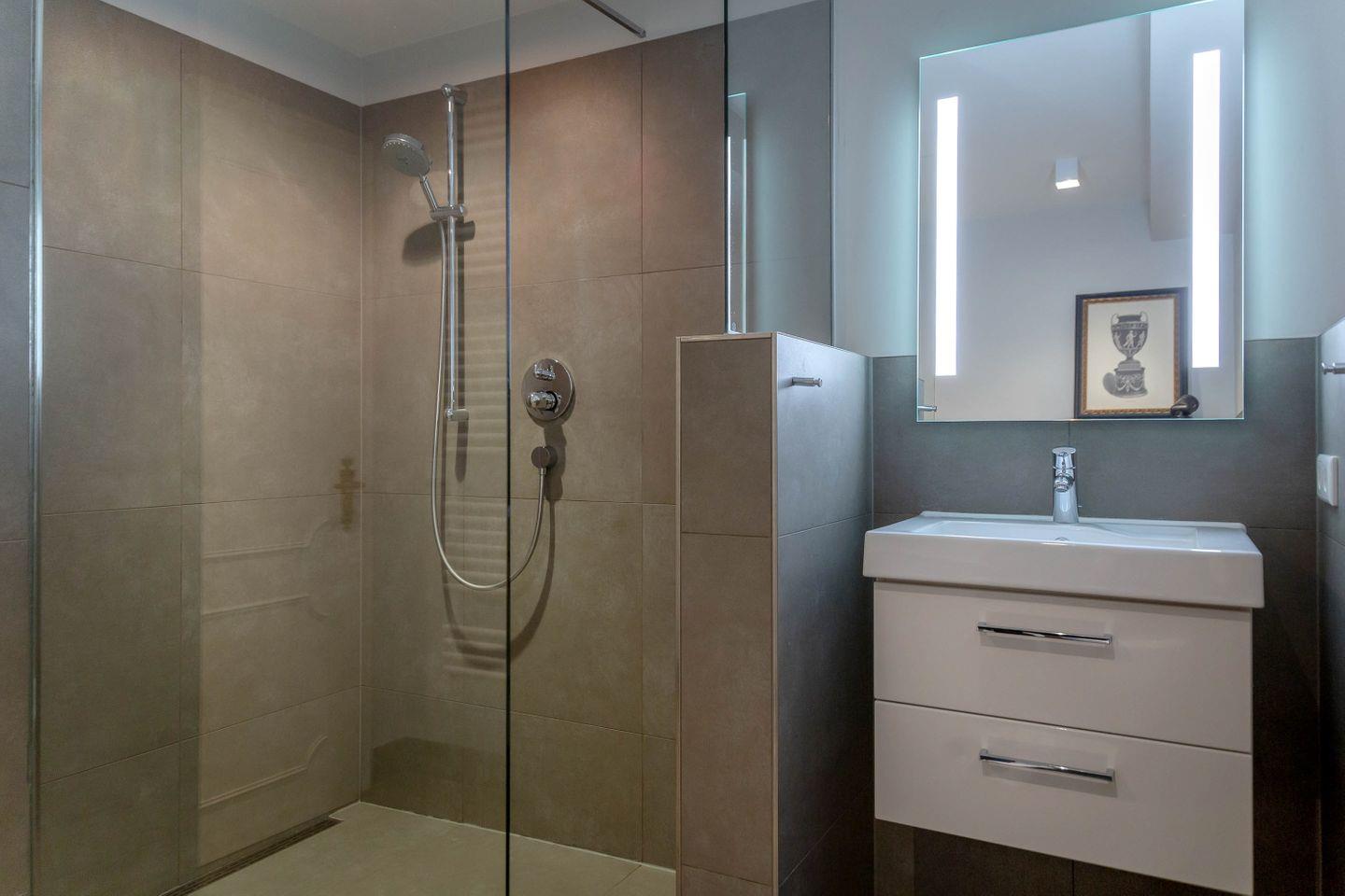 Im modernen Badezimmer erwartet Sie eine bodengleiche Dusche sowie praktische Annehmlichkeiten wie Waschmaschine, Trockner und Föhn.