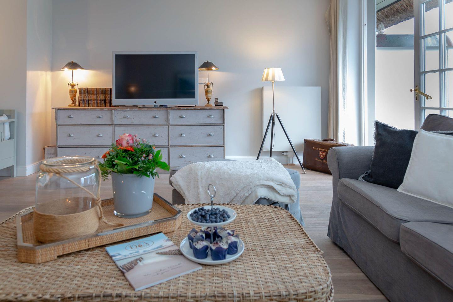 Traumhafte Reetdachwohnung „Ellerweih“ (90 m²) für 2 Personen, nah am idyllischen Watt in Keitum. Komfortables Schlafzimmer, modernes Bad mit Dusche, Küche mit Filterkaffeemaschine, WLAN, Waschmaschine, Trockner. Eigene Terrasse mit Strandkorb zum Entspannen. Hunde herzlich willkommen. Eigener Parkplatz. Nichtraucher-Domizil.