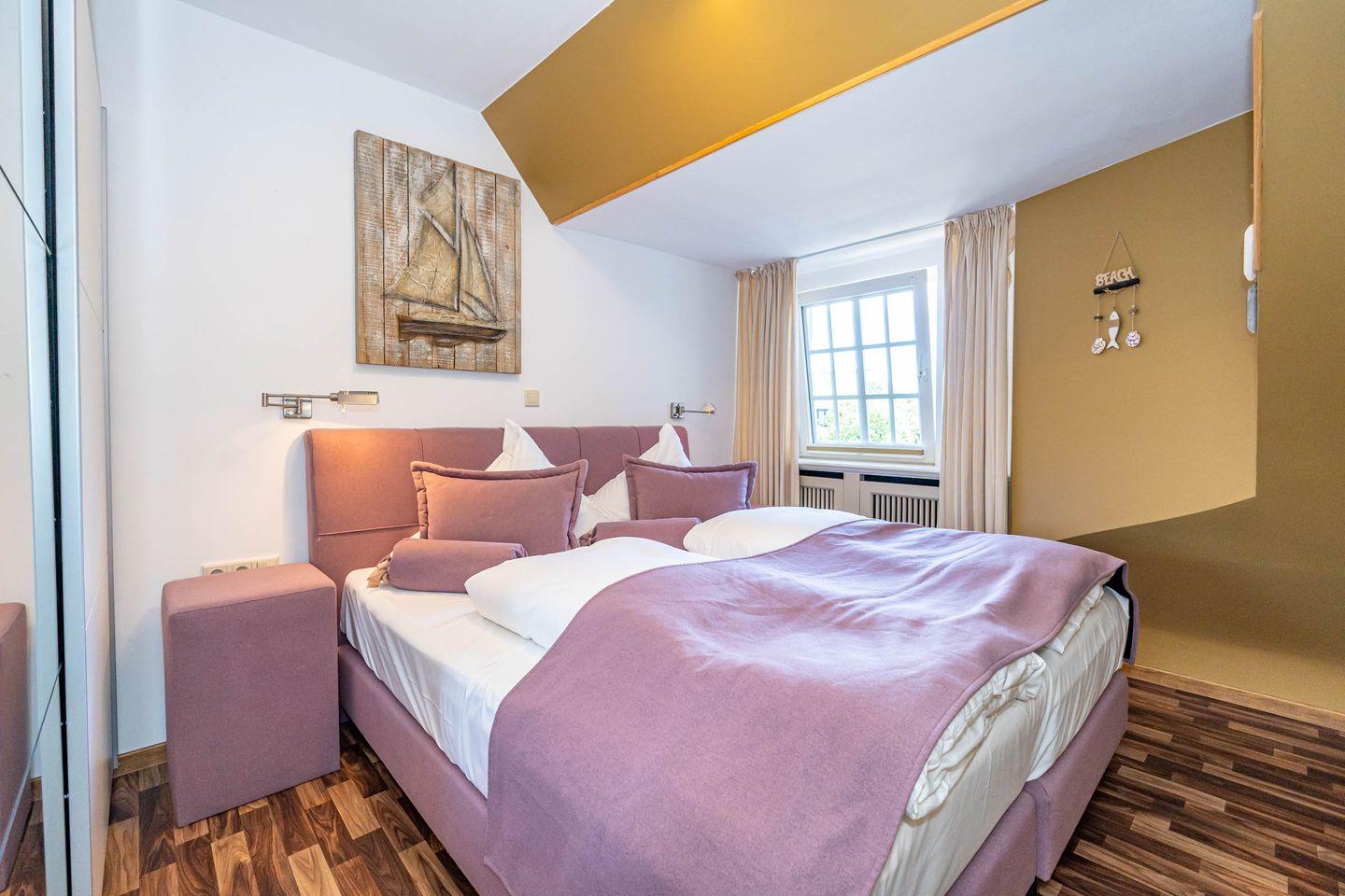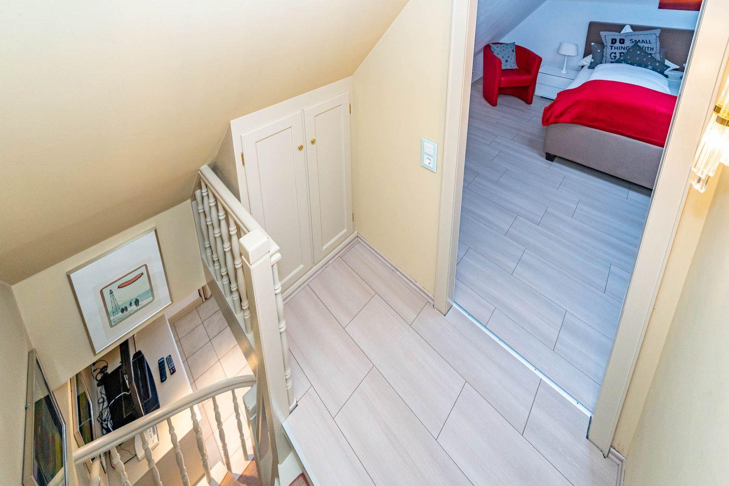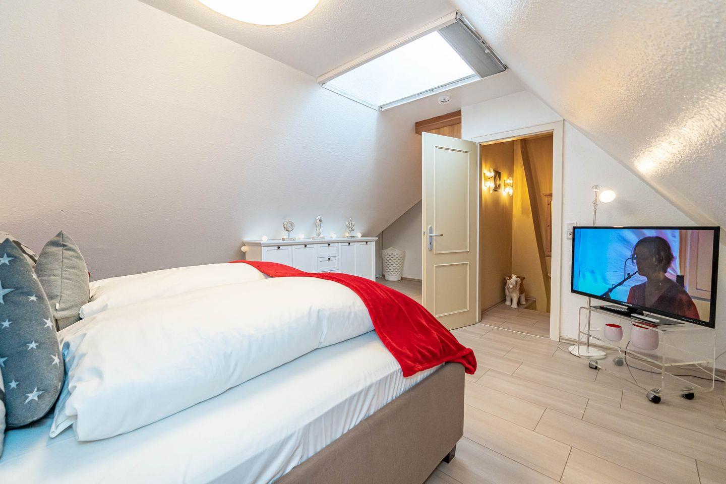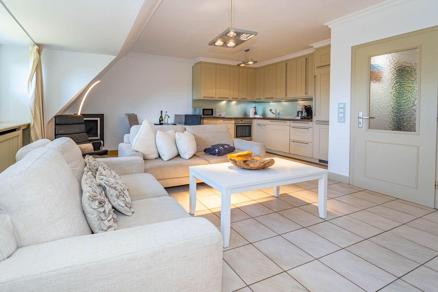 Die Ferienwohnung ist hell und freundlich eingerichtet und befindet sich im 1 OG. Zentraler Raum ist das Wohnzimmer mit offener Küche. Der Wohnbereich mit Sofa und Flatscreen bietet viel Raum und lädt Sie zu gemütlichen Abenden ein. Die vollausgestattete Küche offeriert alles, was Sie als Urlauber zum Kochen brauchen: Herd mit Ceranfeld und Backofen, Mikrowelle, Spülmaschine, Waschtrockner, Kaffeemaschine, Wasserkocher und Toaster. Im Schlafzimmer befindet sich neben dem Schrank mit genügend Stauraum ein hochwertiges Boxspringbett (180x200 cm) sowie ein Flatscreen. Ein Wannenbad mit Duschwand befindet sich ebenfalls auf dieser Etage. Über eine Treppe zum Obergeschoss erreichen Sie ein weiteres Schlafzimmer. Dort erwarten Sie ein weiteres komfortables Boxspringbett (180x200 cm) und ein ebenfalls ein Flatscreen. Unseren Gästen steht ein Waschtrockner in der Wohnung kostenlos zur Verfügung. Eine gemütliche Sonnenkuhle im Gemeinschaftsgarten mit Ihrem eigenen Strandkorb lädt zum Verweilen ein. Hier können Sie in der windgeschützten Sonnenkuhle Ihre Urlaubszeit genießen. Direkt neben dem Haus ist ein PKW Stellplatz für Sie reserviert. Fahrradständer befinden sich auf der Anlage. Ihren kleinen Hund können Sie gerne nach Anmeldung mitbringen (10,- € pro Tier/Tag). Bitte beachten Sie, dass diese Ferienwohnung eine Nichtraucherwohnung ist.