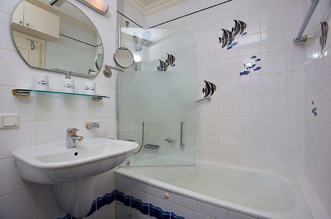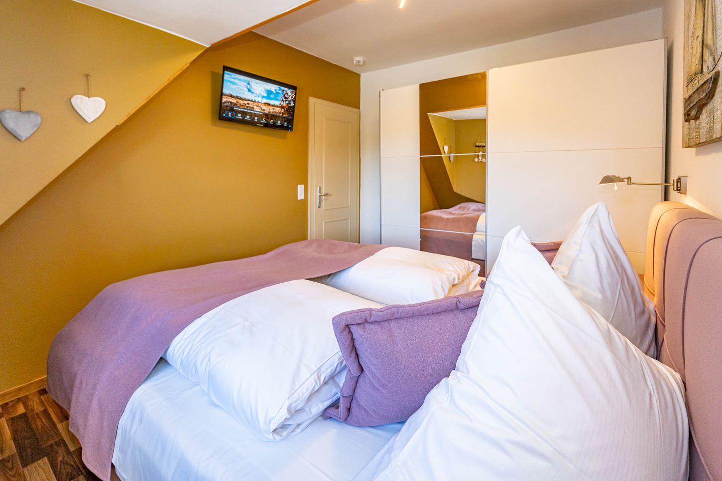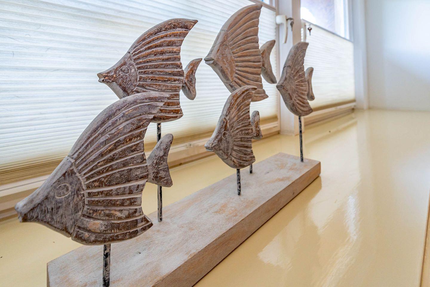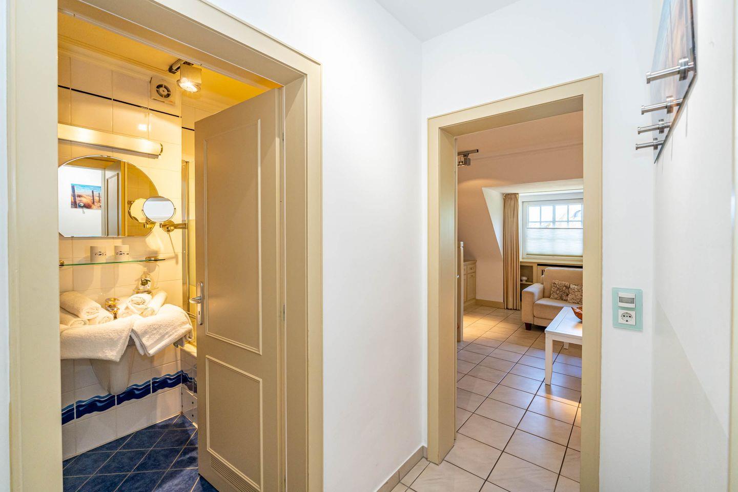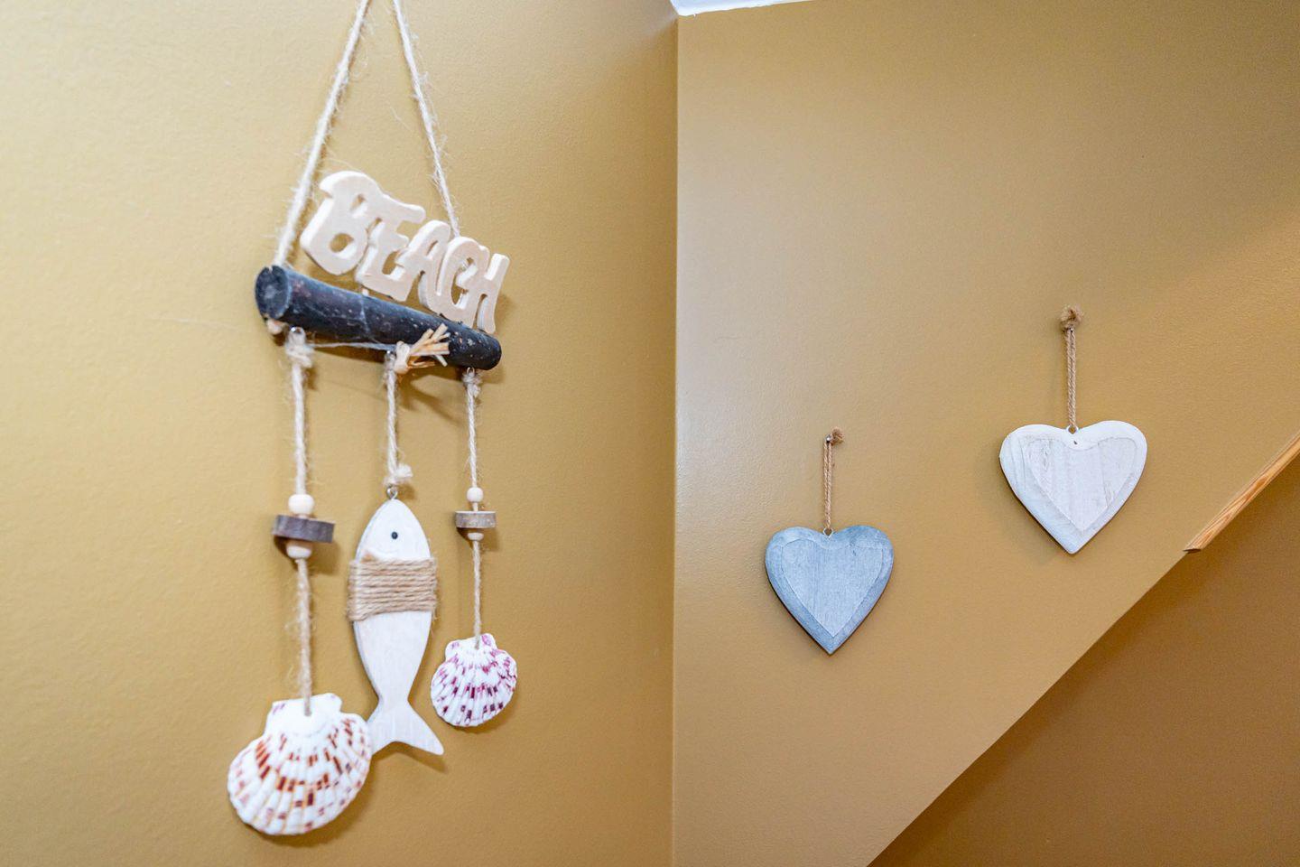 Die Ferienwohnung ist hell und freundlich eingerichtet und befindet sich im 1 OG. Zentraler Raum ist das Wohnzimmer mit offener Küche. Der Wohnbereich mit Sofa und Flatscreen bietet viel Raum und lädt Sie zu gemütlichen Abenden ein. Die vollausgestattete Küche offeriert alles, was Sie als Urlauber zum Kochen brauchen: Herd mit Ceranfeld und Backofen, Mikrowelle, Spülmaschine, Waschtrockner, Kaffeemaschine, Wasserkocher und Toaster. Im Schlafzimmer befindet sich neben dem Schrank mit genügend Stauraum ein hochwertiges Boxspringbett (180x200 cm) sowie ein Flatscreen. Ein Wannenbad mit Duschwand befindet sich ebenfalls auf dieser Etage. Über eine Treppe zum Obergeschoss erreichen Sie ein weiteres Schlafzimmer. Dort erwarten Sie ein weiteres komfortables Boxspringbett (180x200 cm) und ein ebenfalls ein Flatscreen. Unseren Gästen steht ein Waschtrockner in der Wohnung kostenlos zur Verfügung. Eine gemütliche Sonnenkuhle im Gemeinschaftsgarten mit Ihrem eigenen Strandkorb lädt zum Verweilen ein. Hier können Sie in der windgeschützten Sonnenkuhle Ihre Urlaubszeit genießen. Direkt neben dem Haus ist ein PKW Stellplatz für Sie reserviert. Fahrradständer befinden sich auf der Anlage. Ihren kleinen Hund können Sie gerne nach Anmeldung mitbringen (10,- € pro Tier/Tag). Bitte beachten Sie, dass diese Ferienwohnung eine Nichtraucherwohnung ist.