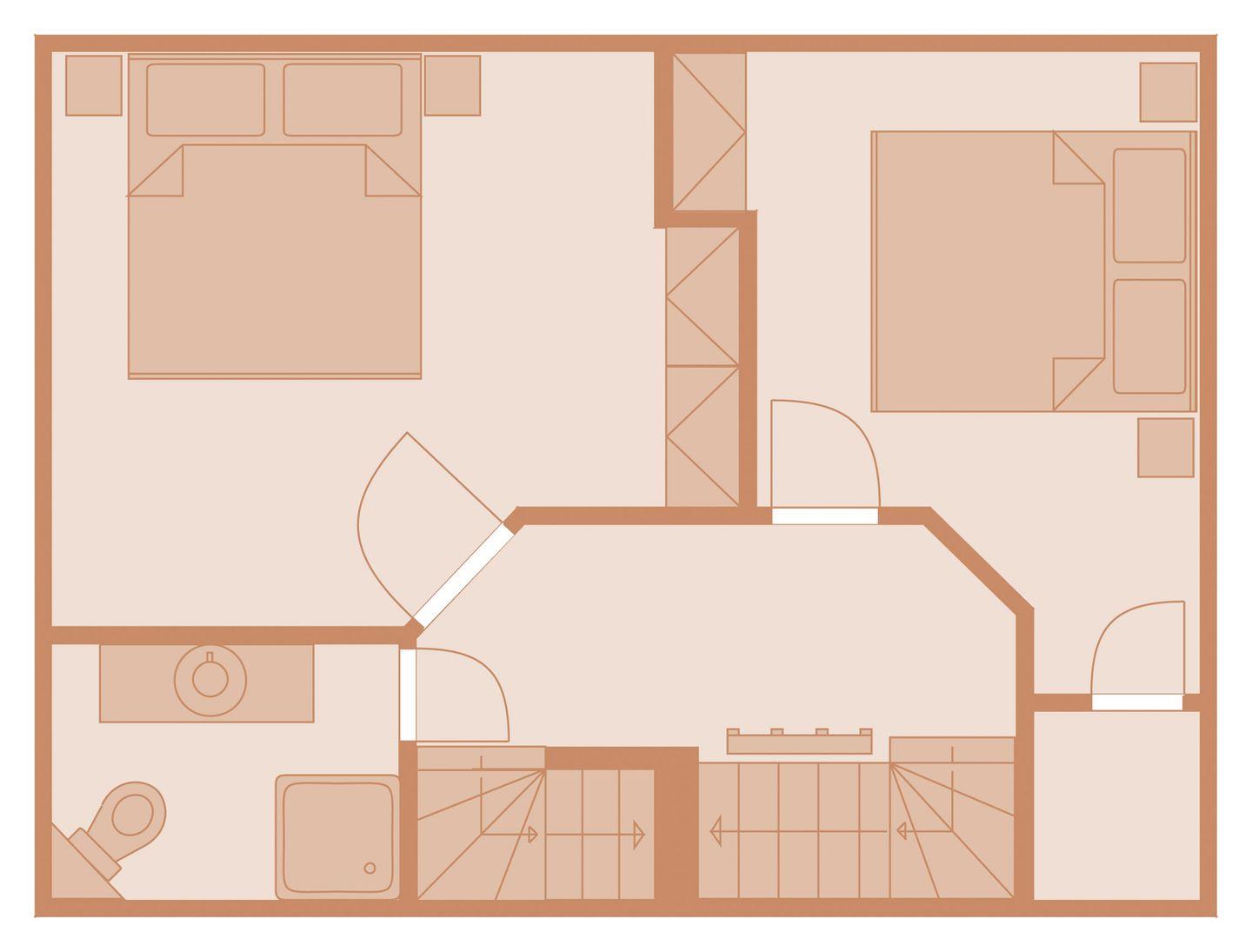 Obergeschoss: 1 Doppelzimmer mit TV, 1 Grandlitzimmer, Badezimmer mit Dusche und WC