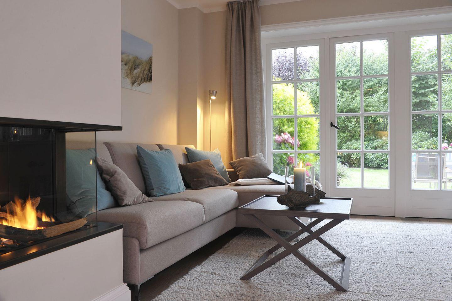 Erdgeschoss: Flur, Gäste-WC, komplett eingerichtete offene Küche mit Nespresso-Maschine, Wohnzimmer mit Esstisch, Gaskamin und TV, ruhiger, eingewachsener Garten mit West-Terrasse, Gartenmöbeln und Strandkorb