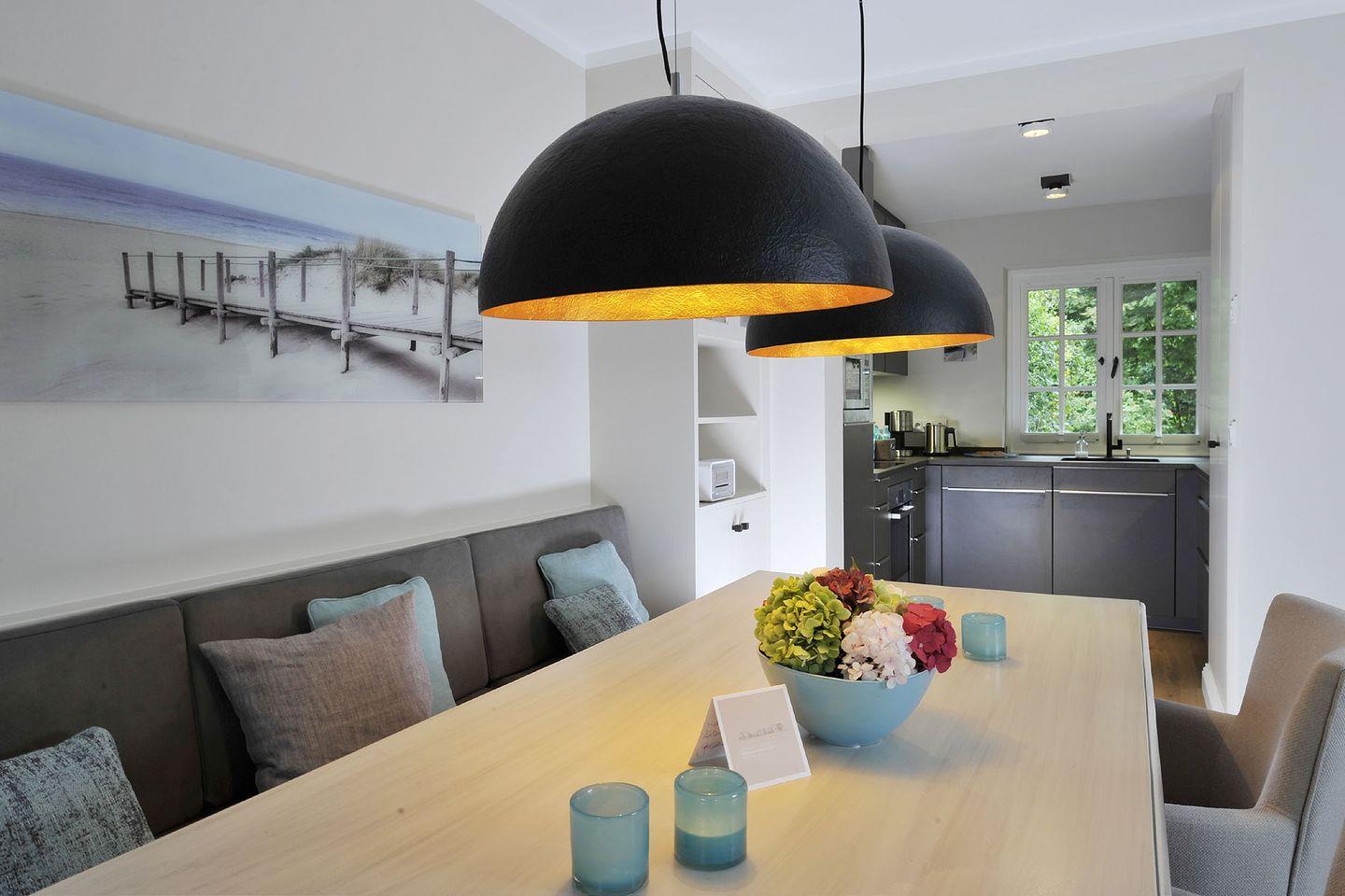 Das im Sommer 2014 neu konzipierte und vollständig renovierte Ferien Domizil an der Bahnhofstraße 22B ist ein Kleinod für alle Wellness-Fans. Maximal sechs Personen finden hier auf vier Ebenen und 136 m² ausreichend Platz. Der 180 m² große Garten und die nach Westen ausgerichtete Terrasse bieten zusätzlichen Raum zur Entspannung. Der moderne Hausteil unter Reet erwartet seine Gäste mit vielen schönen und einladenden Plätzen. Im Wohnzimmer sorgt ein Gaskamin für wohlige Wärme und zaubert einen Lieblingsplatz auf dem gemütlichen Sofa. Herzstück der Wohnung ist der große Esstisch, denn er verbindet die offene und umfangreich ausgestattete Küche mit dem Wohnbereich auf sehr sympathische Art und Weise. Die Inneneinrichtung basiert auf schönen und dezenten Farben, behaglichen Stoffen und ausgesuchten Requisiten. Ein privater, großzügiger Wellnessbereich im Souterrain des Hauses verführt zur Entspannung mit Sauna, Ruheraum und schönem Bad, er bietet Komfort und Wohlfühlgenuss auf höchstem Niveau.